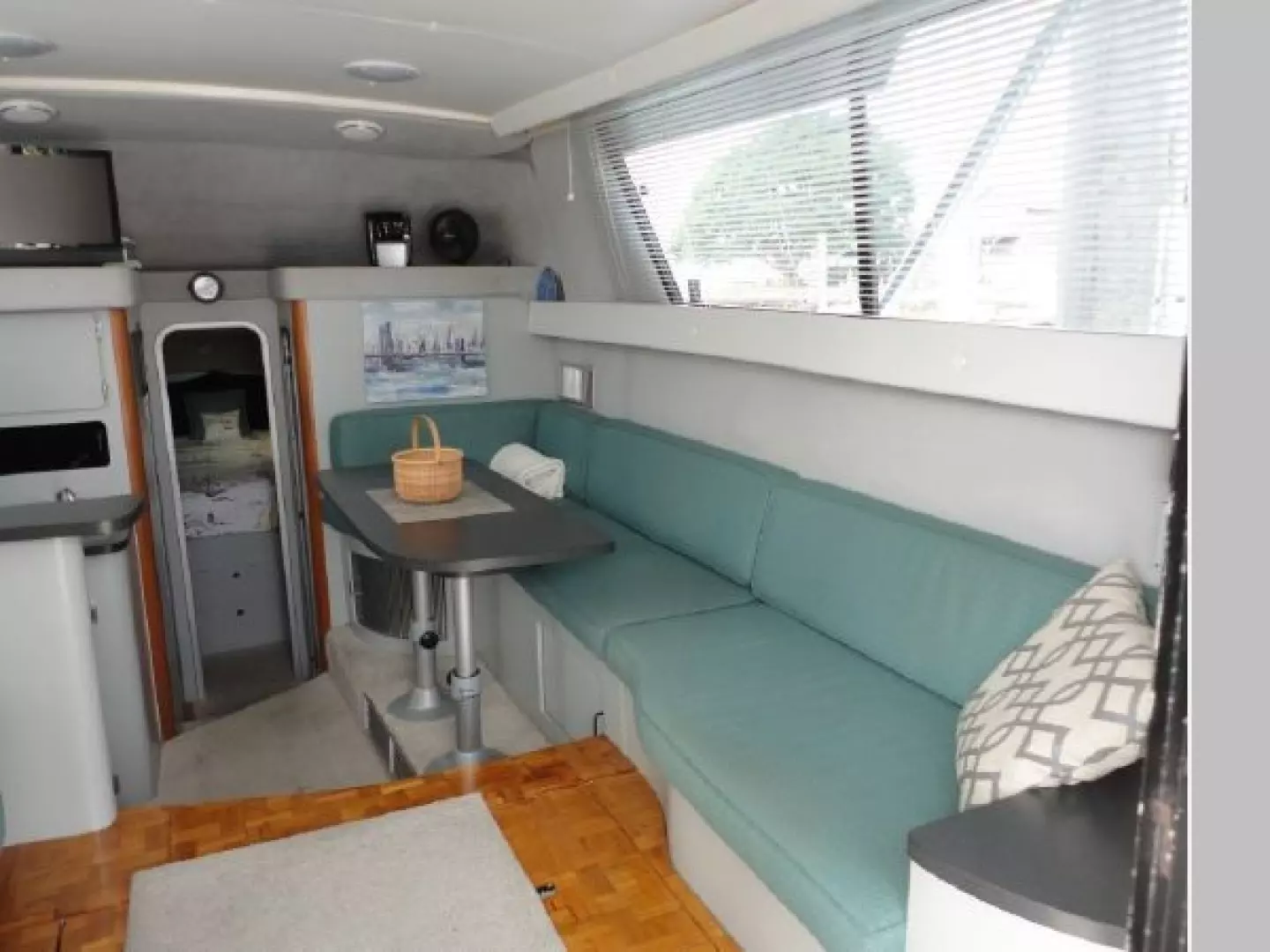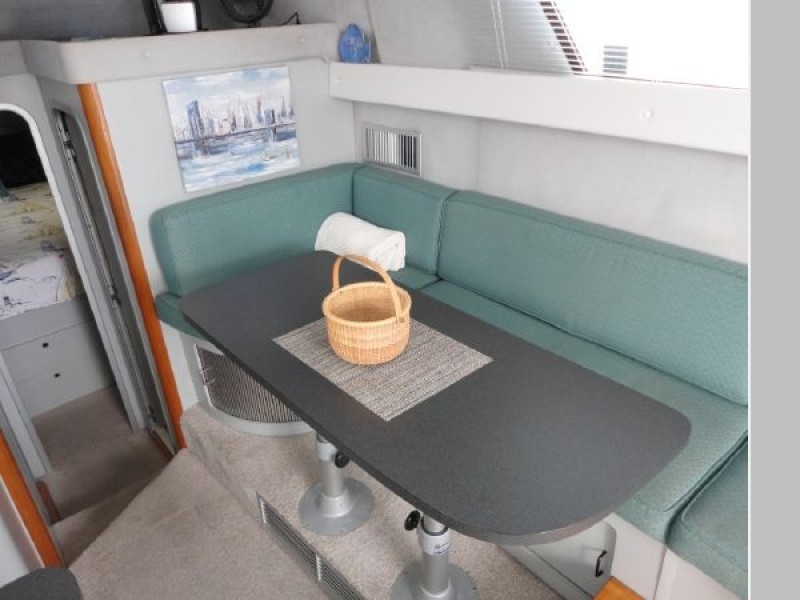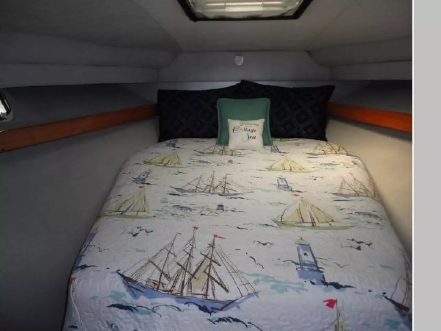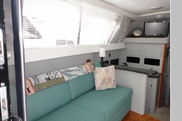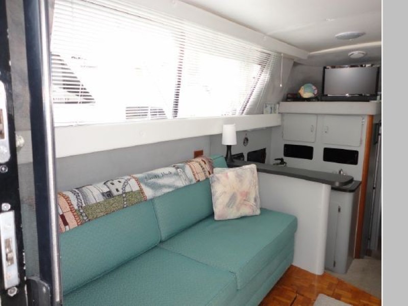 A centerline queen with a custom mattress is forward with hanging lockers port and starboard. Aft to port is the head with vanity and aft to starboard is the enclosed shower. Aft again to port is the spacious galley area with ample counter, cabinet and drawer space. Opposite the galley and up a couple of steps is the convertible dinette. A full length settee runs along the starboard side of the salon to include the L-shaped dinette and another settee (with storage beneath) along the port side. Out the sliding door to a comfortable cockpit suitable for fishing or entertaining. Up on the flybridge you have a center helm with a forward facing bench seat and two helm seats.