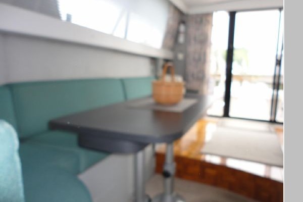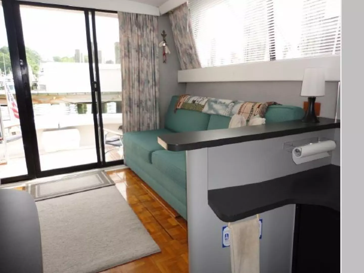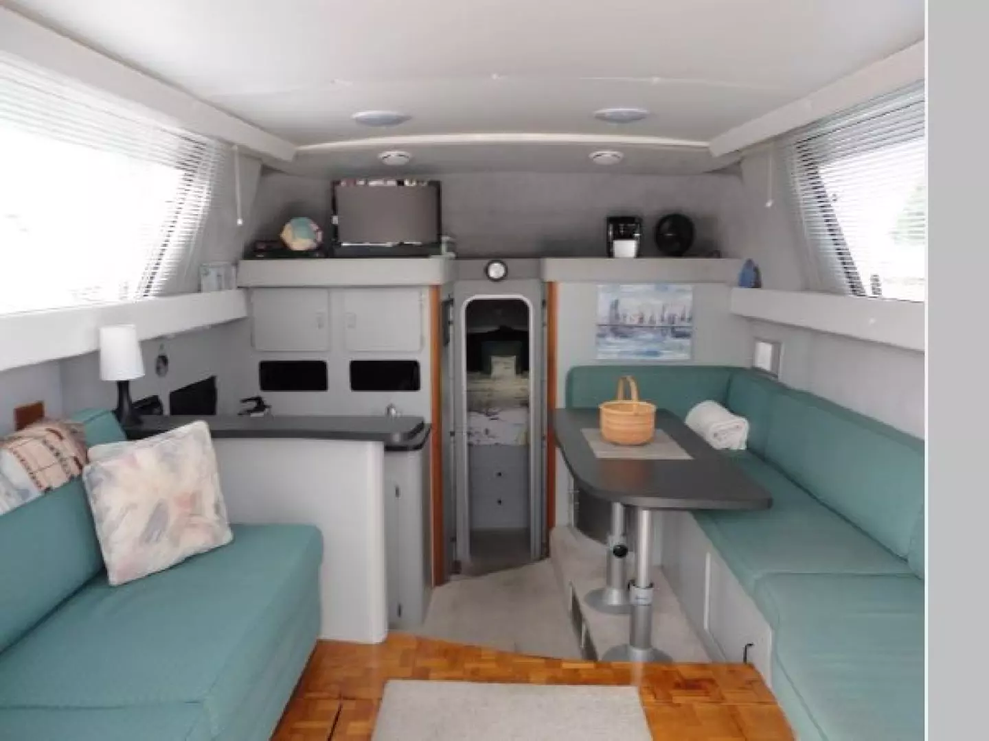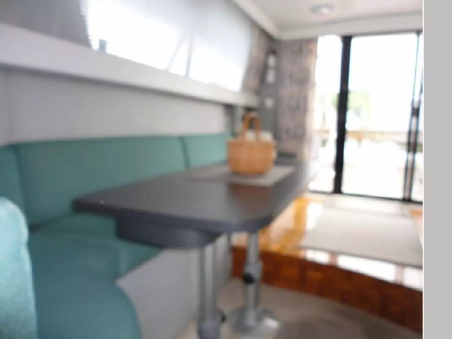 A centerline queen with a custom mattress is forward with hanging lockers port and starboard. Aft to port is the head with vanity and aft to starboard is the enclosed shower. Aft again to port is the spacious galley area with ample counter, cabinet and drawer space. Opposite the galley and up a couple of steps is the convertible dinette. A full length settee runs along the starboard side of the salon to include the L-shaped dinette and another settee (with storage beneath) along the port side. Out the sliding door to a comfortable cockpit suitable for fishing or entertaining. Up on the flybridge you have a center helm with a forward facing bench seat and two helm seats.