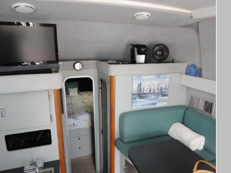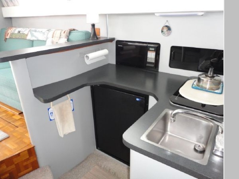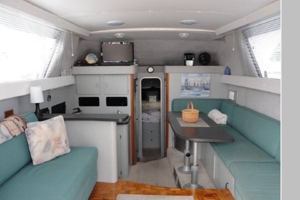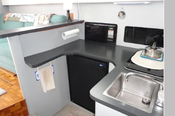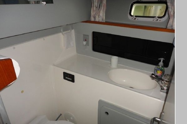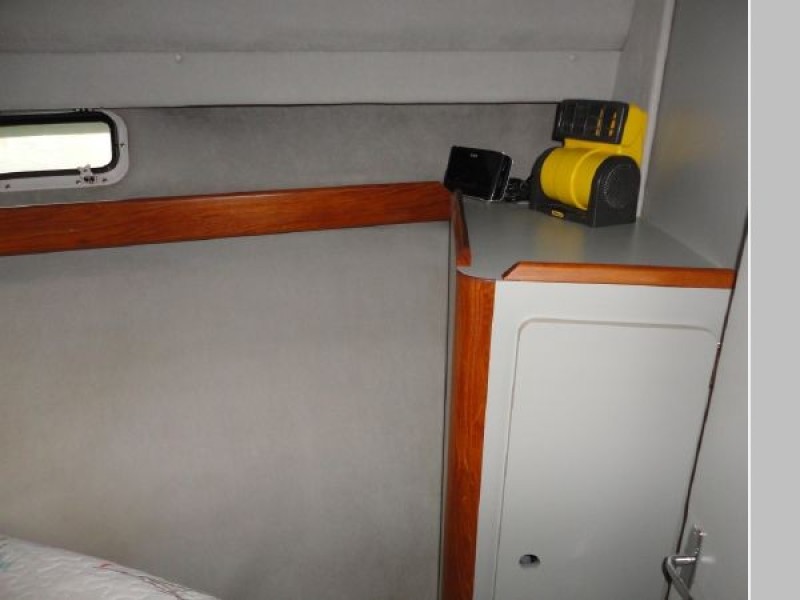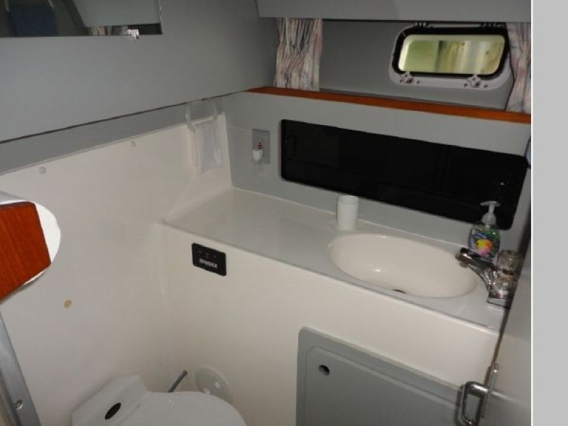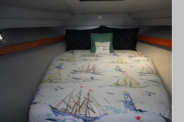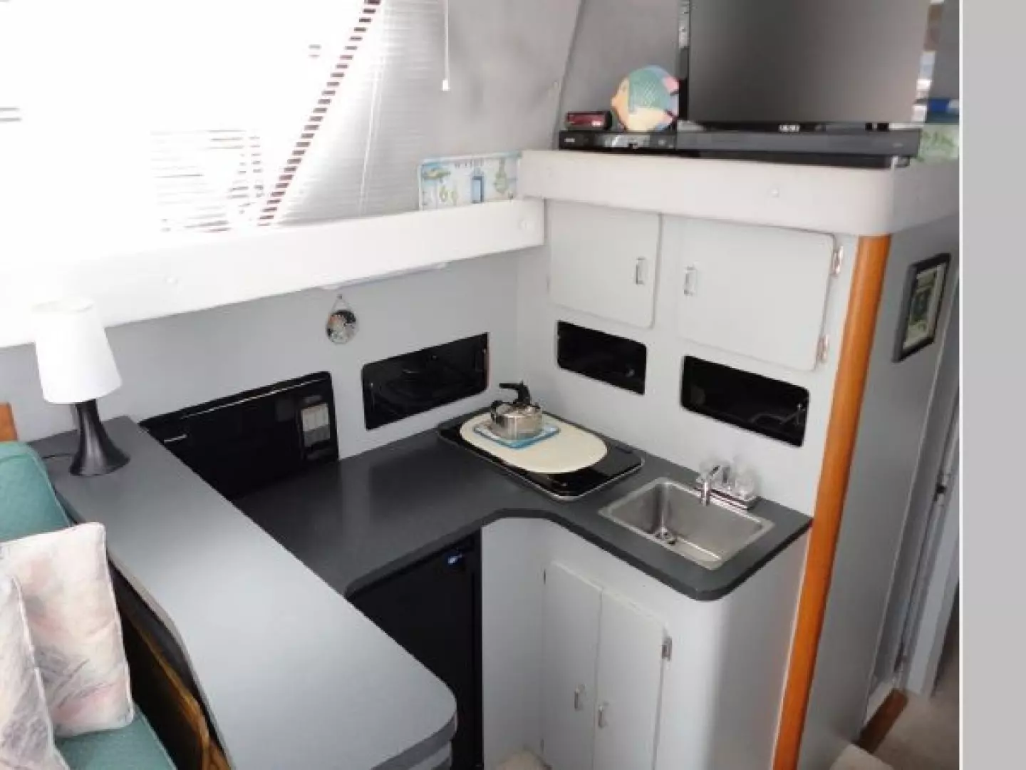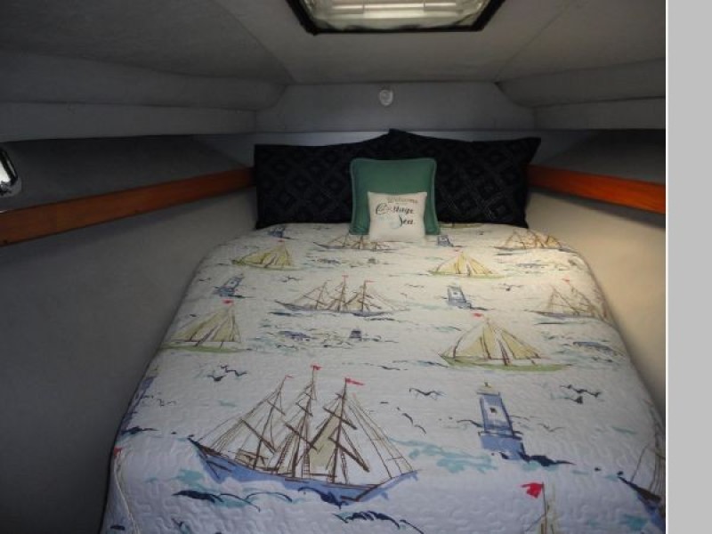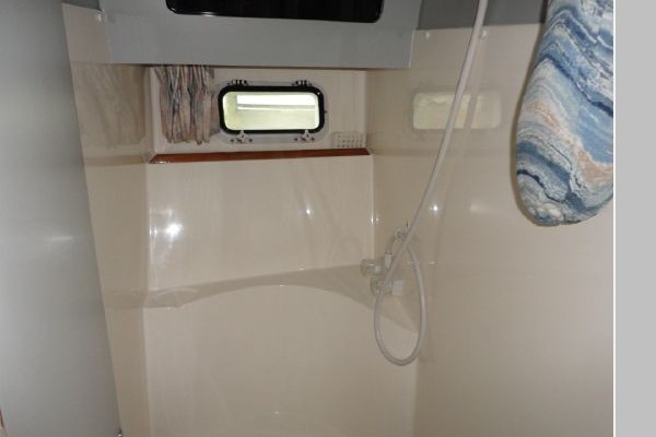 A centerline queen with a custom mattress is forward with hanging lockers port and starboard. Aft to port is the head with vanity and aft to starboard is the enclosed shower. Aft again to port is the spacious galley area with ample counter, cabinet and dr |