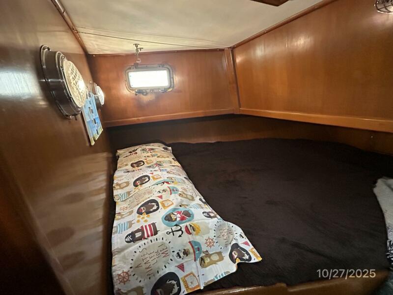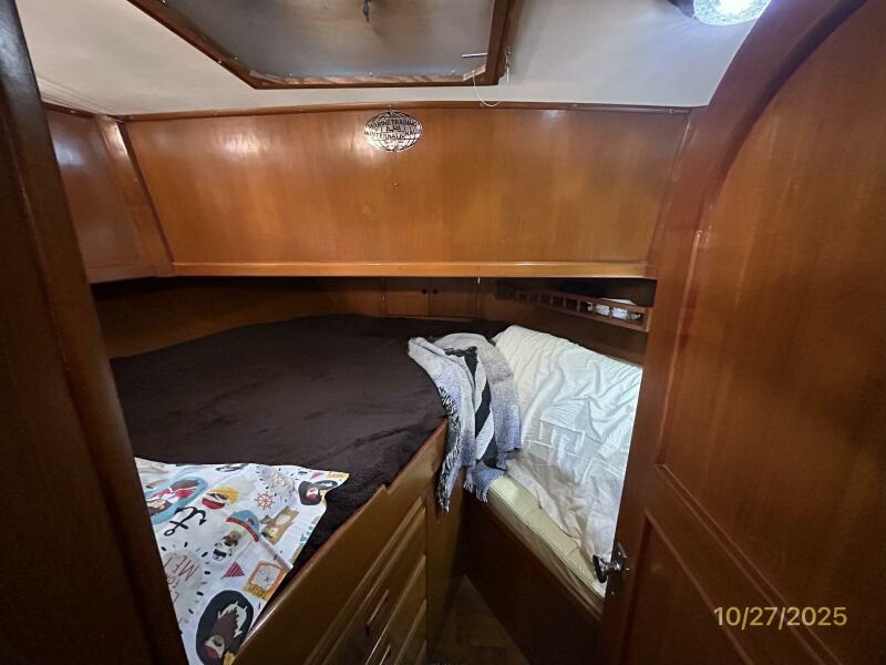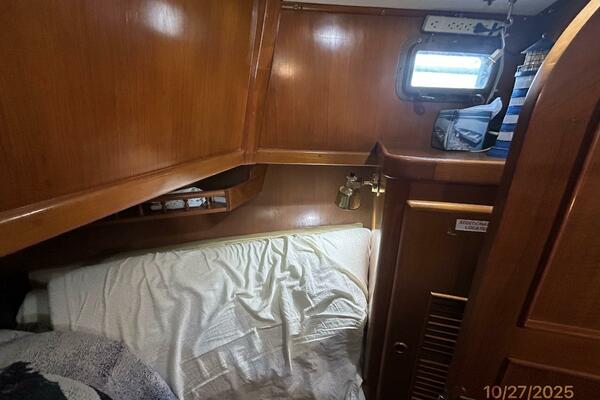 The guest stateroom is forward and offers a double size berth to port, benchseat with storage to starboard, 2 portlights, overhead hatch with a screen, reading lights, teak parquet sole, hanging locker, shelf, storage drawers and anchor chain locker access. The guest head is to starboard across from the galley.