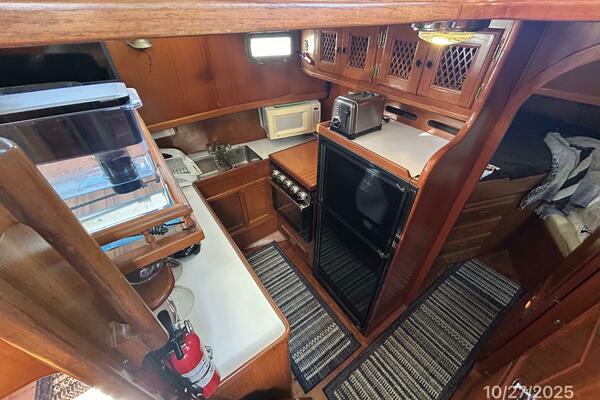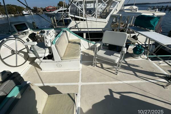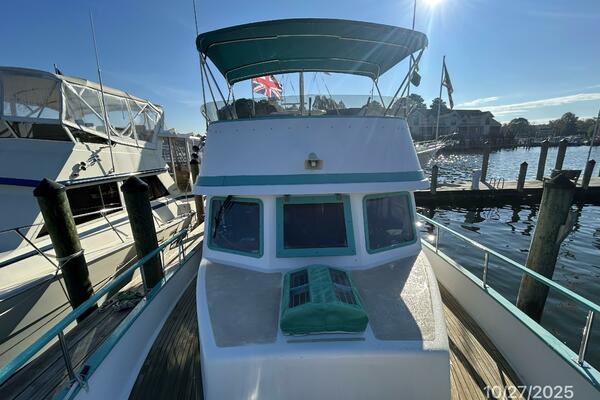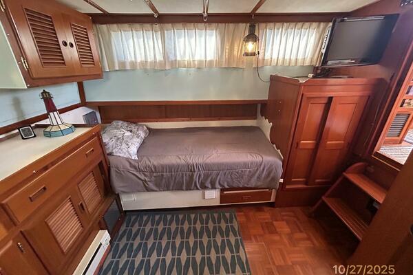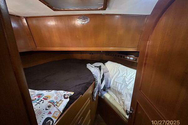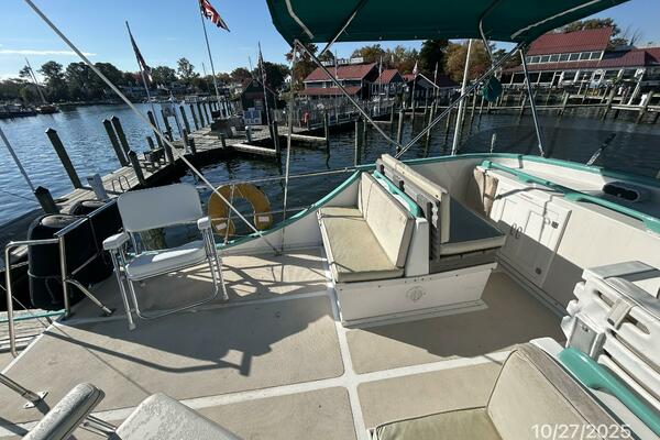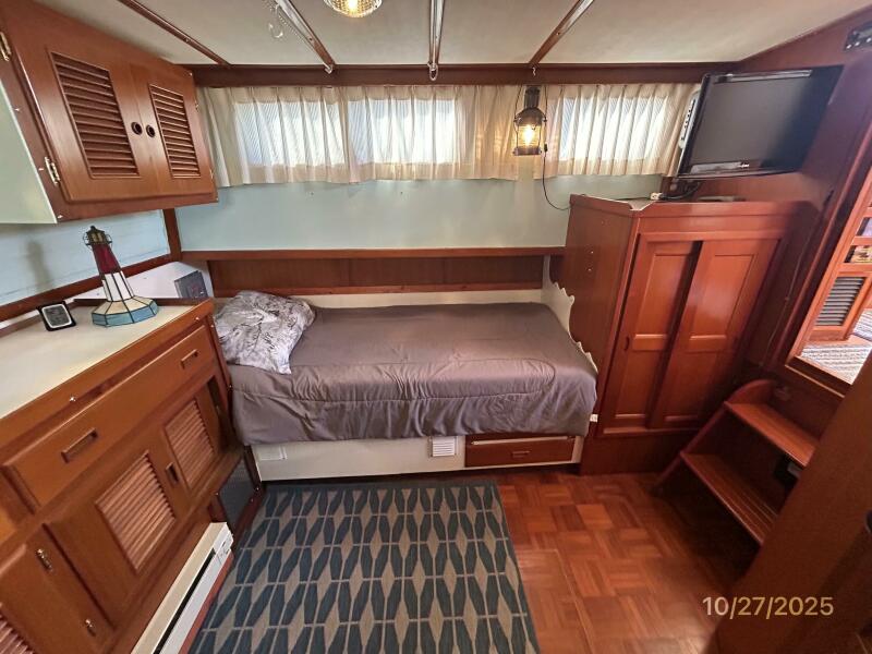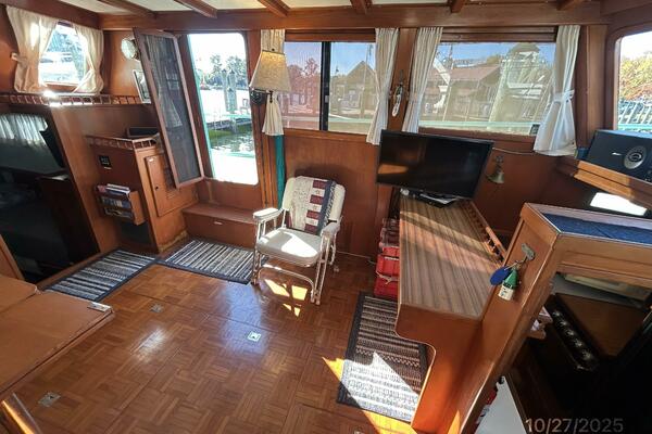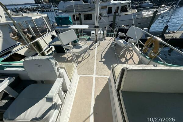 From the aftdeck, you can walk out either side deck to the foredeck and salon or step onto the trunk cabin and then up to the flybridge. Entering the salon from the port side door, you will find the master stateroom companionway port aft, deck chair to port, counter port forward, L-shaped seating/berth with storage and a hi/lo folding teak table starboard aft, liquor cabinet to port and the lower helm and side deck access door starboard forward. Walk forward and step down to find the galley to port, guest head to starboard and the guest stateroom forward. Engine room access is via salon sole hatches.