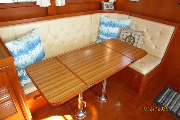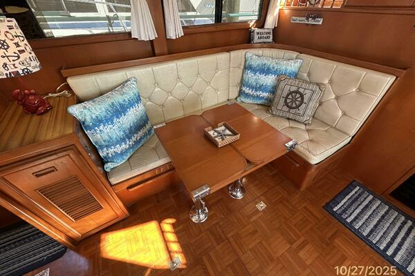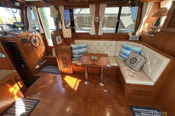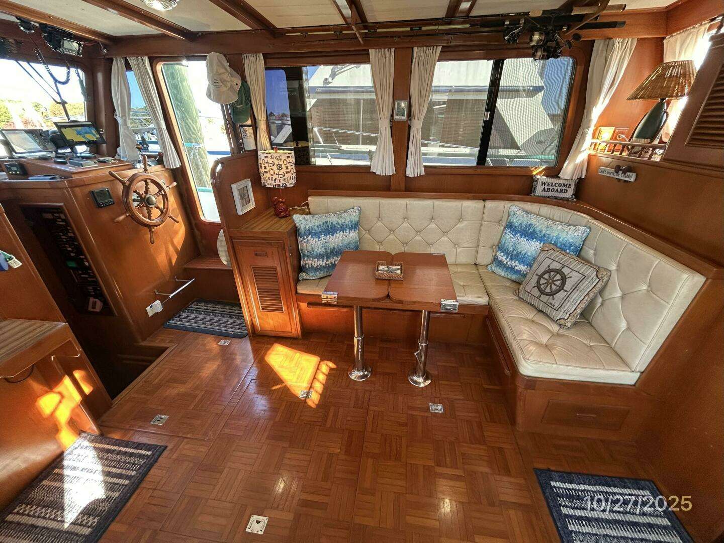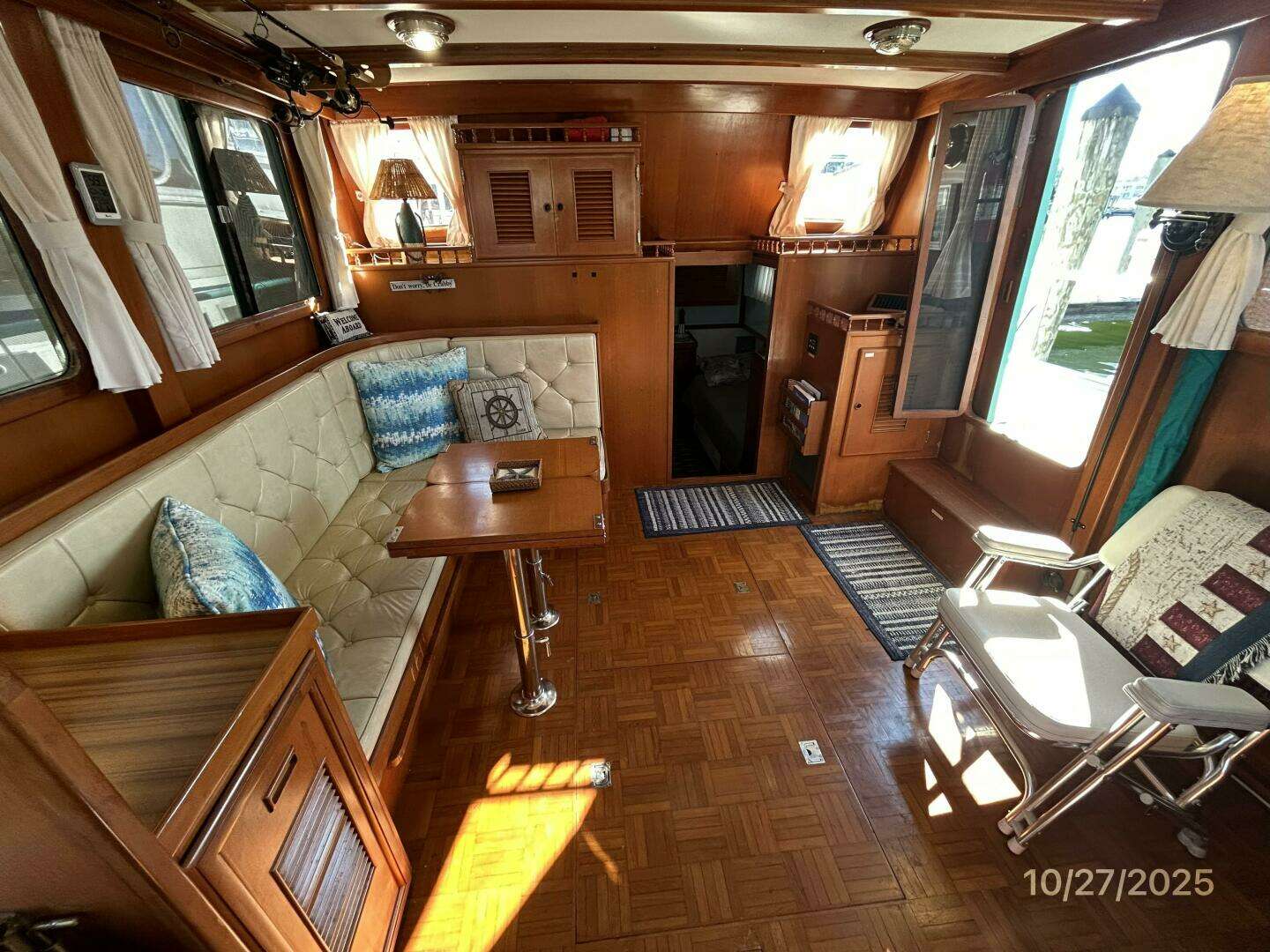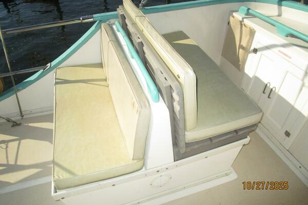 The salon offers L-shaped seating with storage and a hi/lo folding teak table that converts to a double size berth starboard aft, liquor cabinet to starboard, storage cabinet port aft, side deck access doors starboard forward and port aft, counter port forward, deck chair to port, opening side windows with screens and curtains, aft windows with curtains, opening center windshield with a screen, teak parquet sole, bookshelf, rod storage and engine room access.