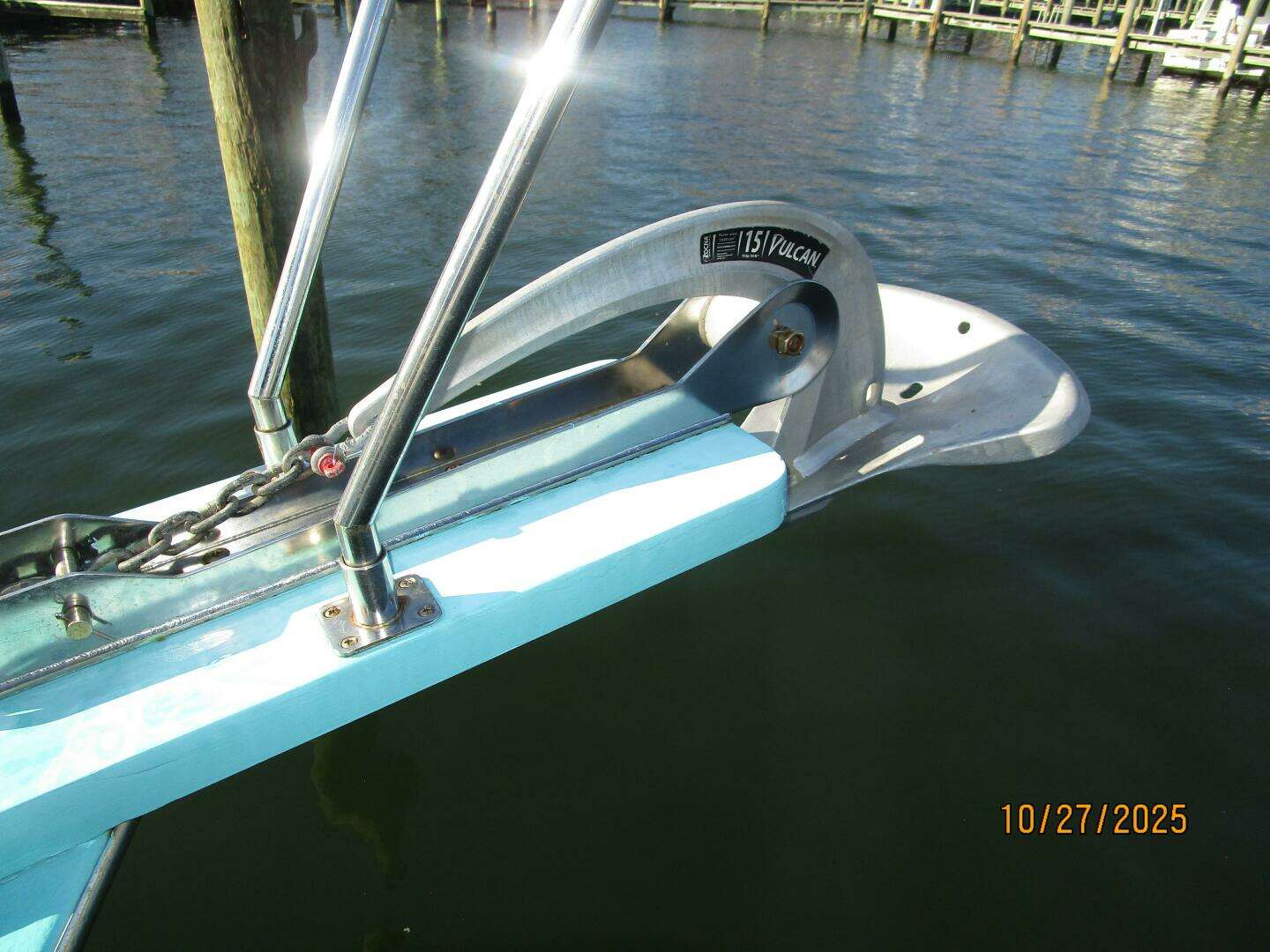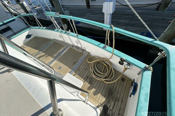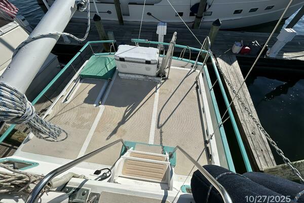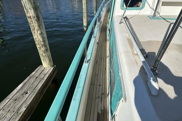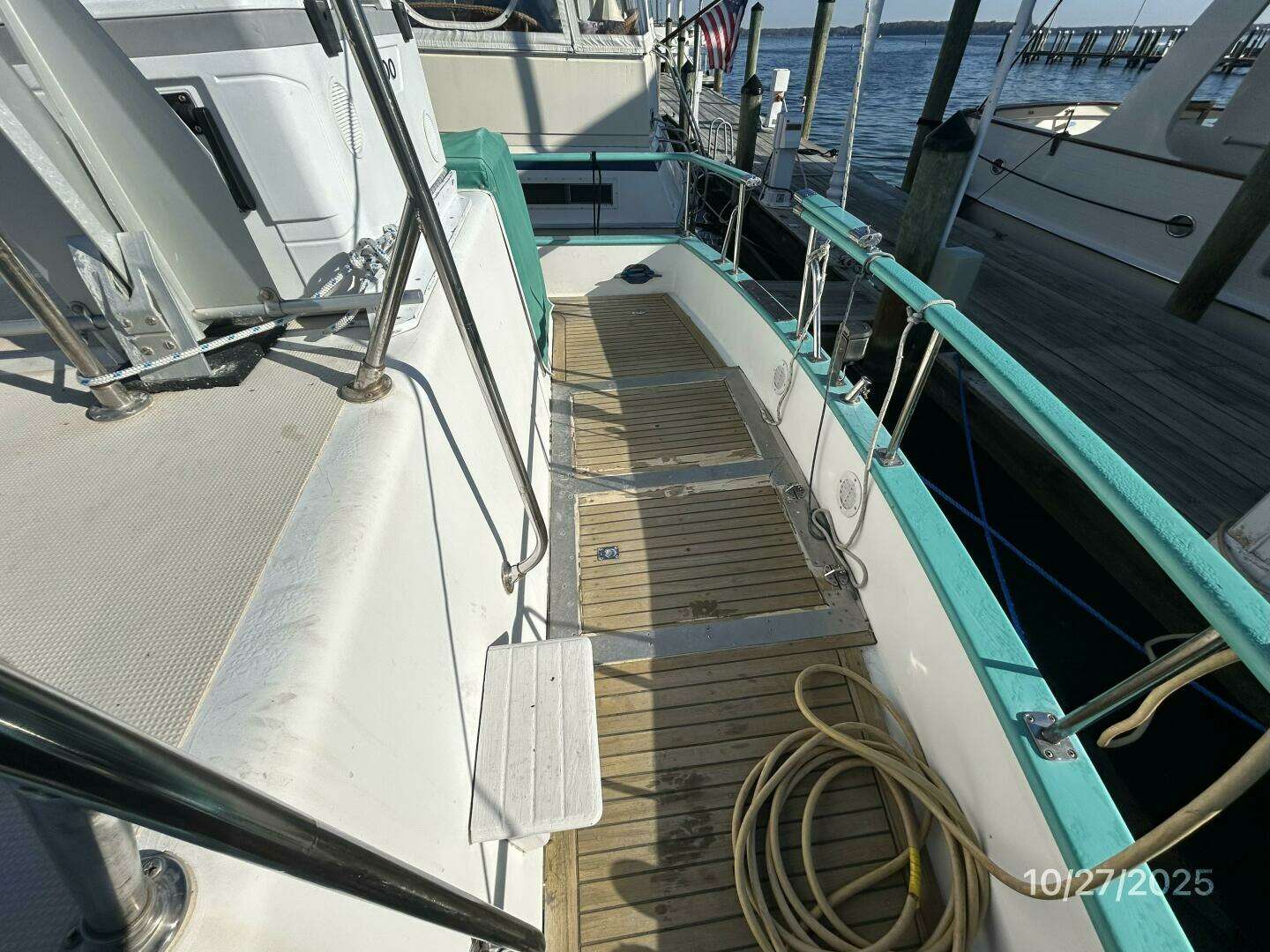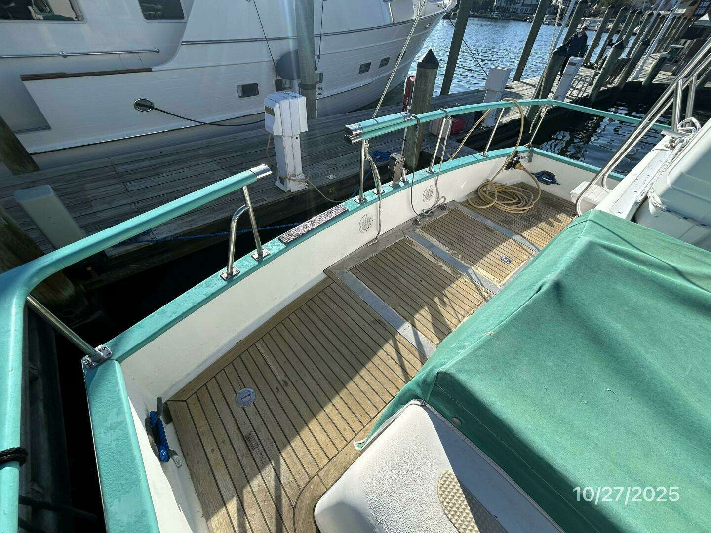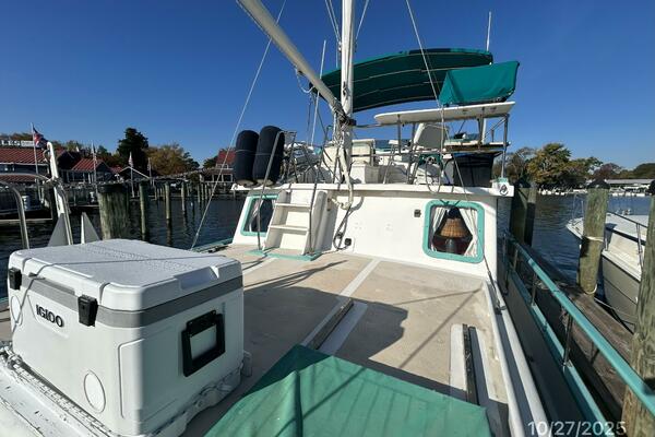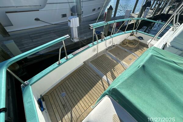 The aftdeck offers a teak deck, lazarette access, boarding gate aft, hatch to the master stateroom, same-level side deck access and one step up to the trunk cabin.