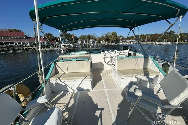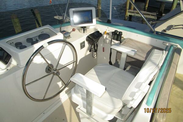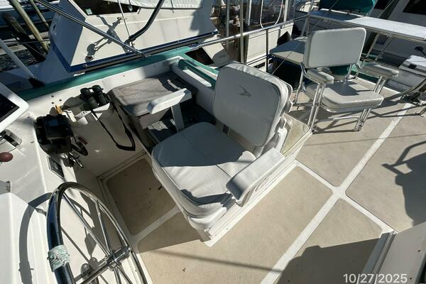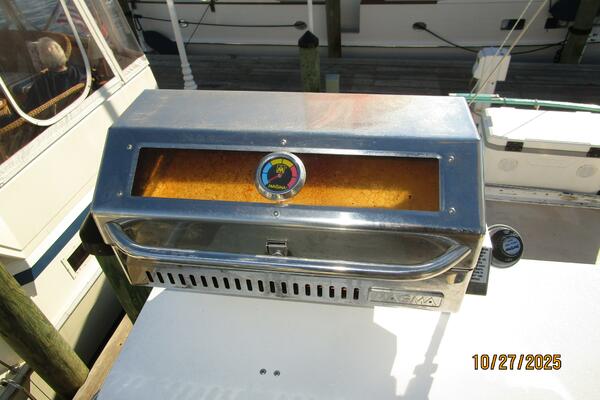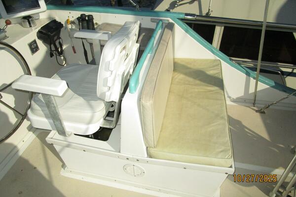 The flybridge offers a bimini, non-skid deck, Magma Newport infrared BBQ grill, helm seat, benchseat with storage on each side fore and aft, storage under the console, two deck chairs, custom countertop aft and a hinged mast with boom.