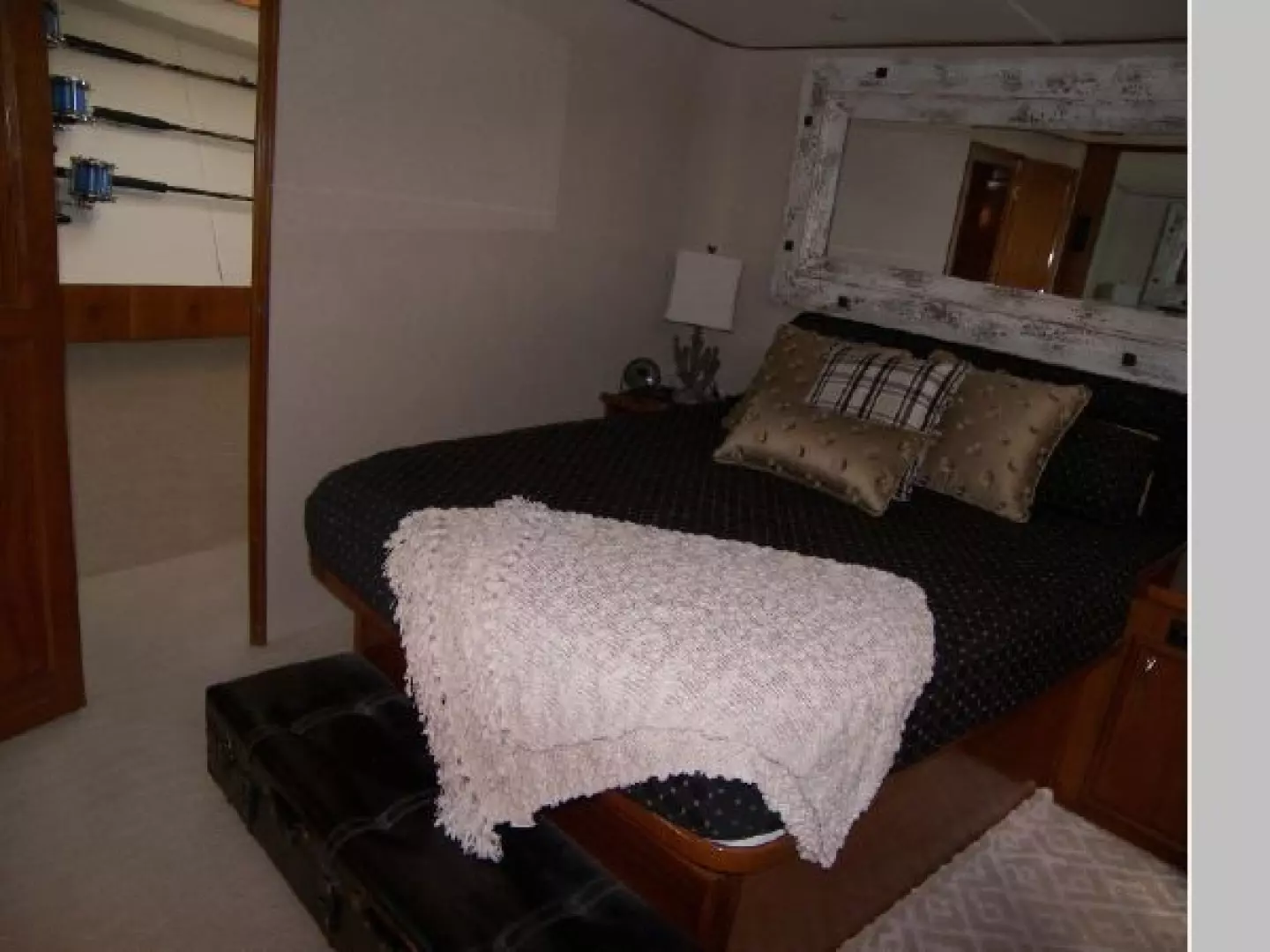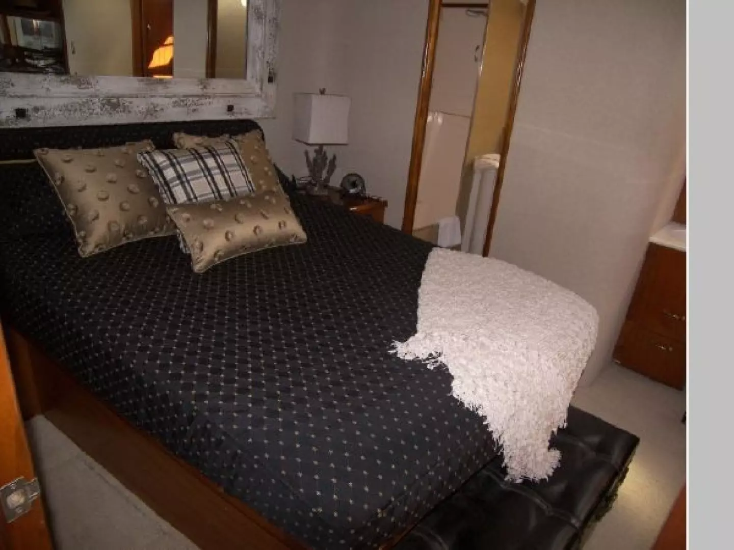 Master cabin is mid-ship featuring a walk around Queen berth and built-in nightstands, en suite Head with Tub and Shower, Cedar lined closets and drawer storage.