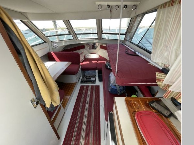 The Phoenix 29 SFX is an updated and restyled version of the earlier Phoenix 29 Convertible (1977/87). She replaced the conservative profile of her predecessor with the more aggressive lines of the larger Phoenix 33 Convertible. Indeed, the oversized flybridge of the SFX seems almost too large for a 29-footer. Phoenix introduced a number of desirable features in this model including a transom door, molded pulpit, aluminum rails, and a revamped and updated interior layout with berths for six. Stoutly built, an all-new hull featured a slightly wider beam at the waterline, a redesigned entry, and extra strakes for improved lift and stability. Notably, the absence of a forward stateroom bulkhead results in a more open and spacious interior. Borrowing again from the 33 Convertible, a unique air duct system is used to rid the cockpit of exhaust fumes while underway. Among several engine options offered during her production years, twin 270hp gas engines cruise the 29 SFX at 22 knots (29/30 knots top).
