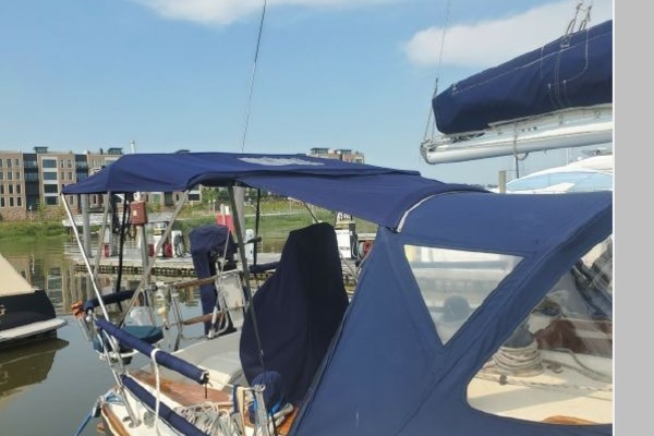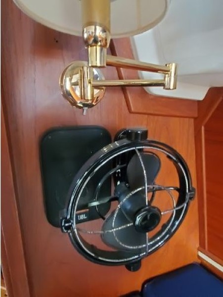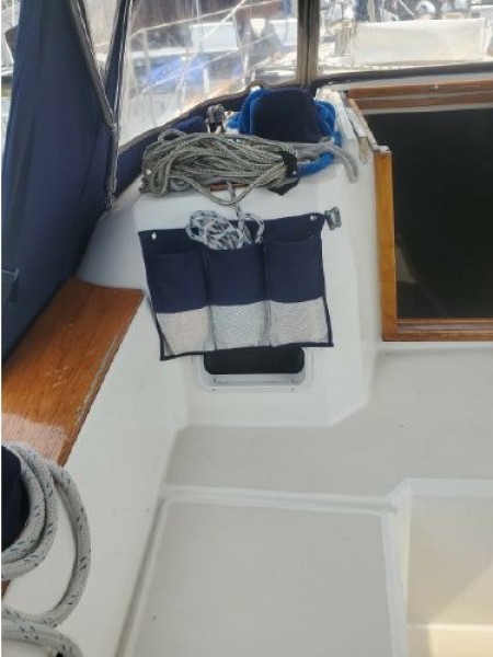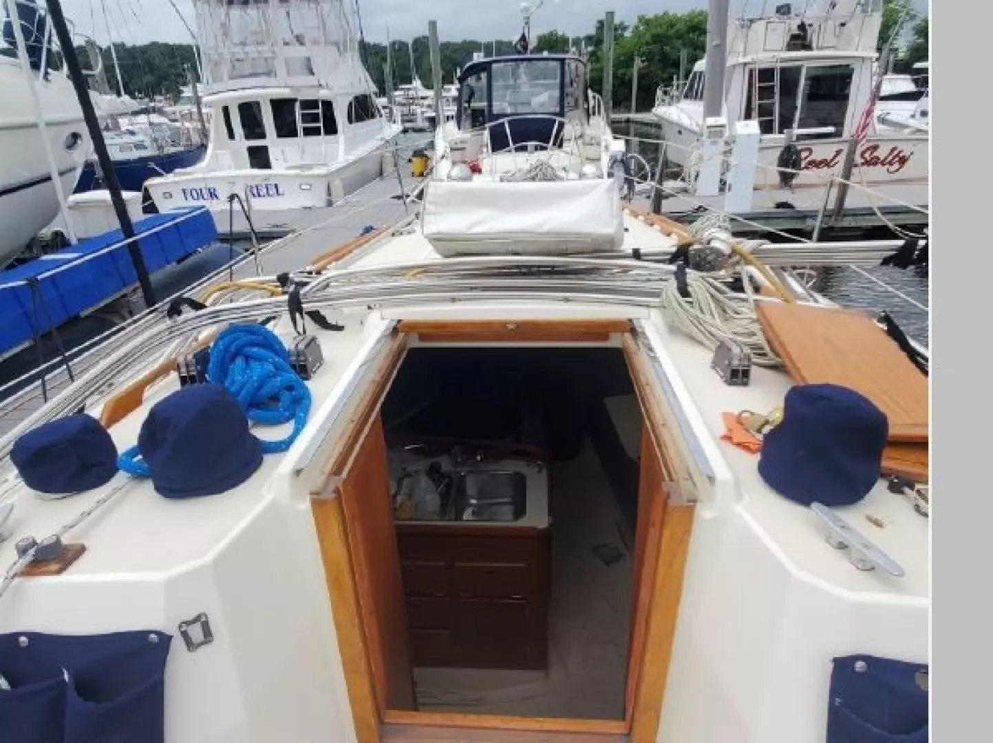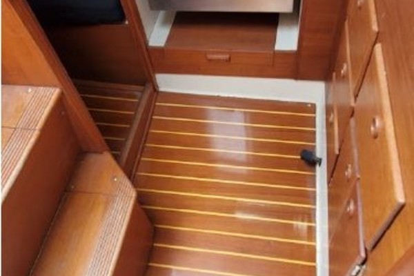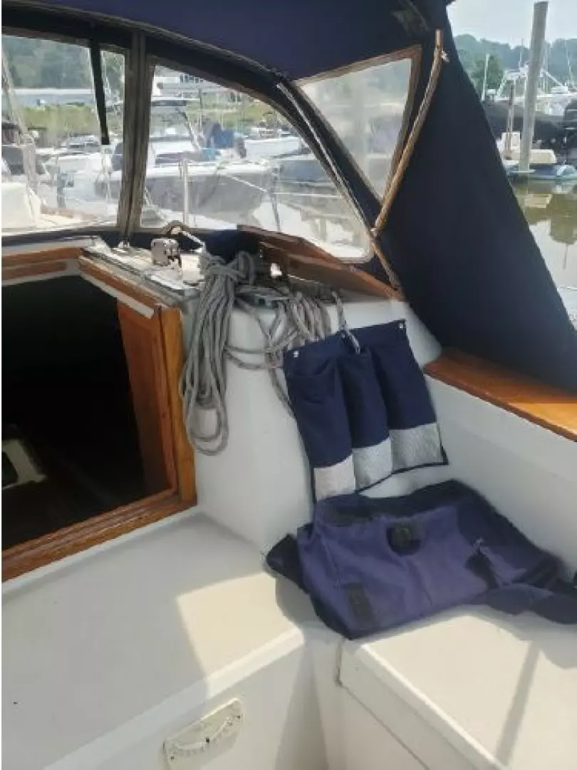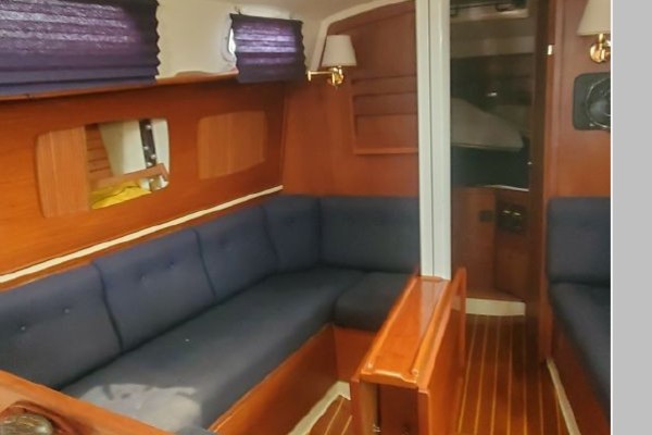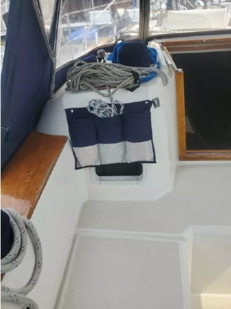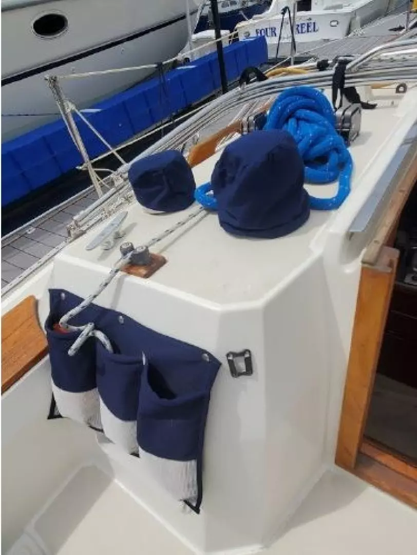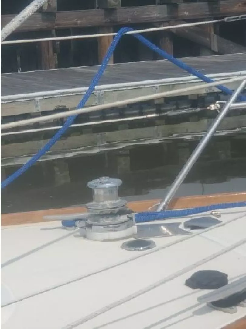 The freshly varnished interior shows like new. The interior is spacious with 6'3" headroom. There are 2 private staterooms, galley and salon, enclosed head. Natural light and ventilation is provided via 4 large fixed ports, 2 Bomar deck hatches, 8 opening ports, and dorade vents.