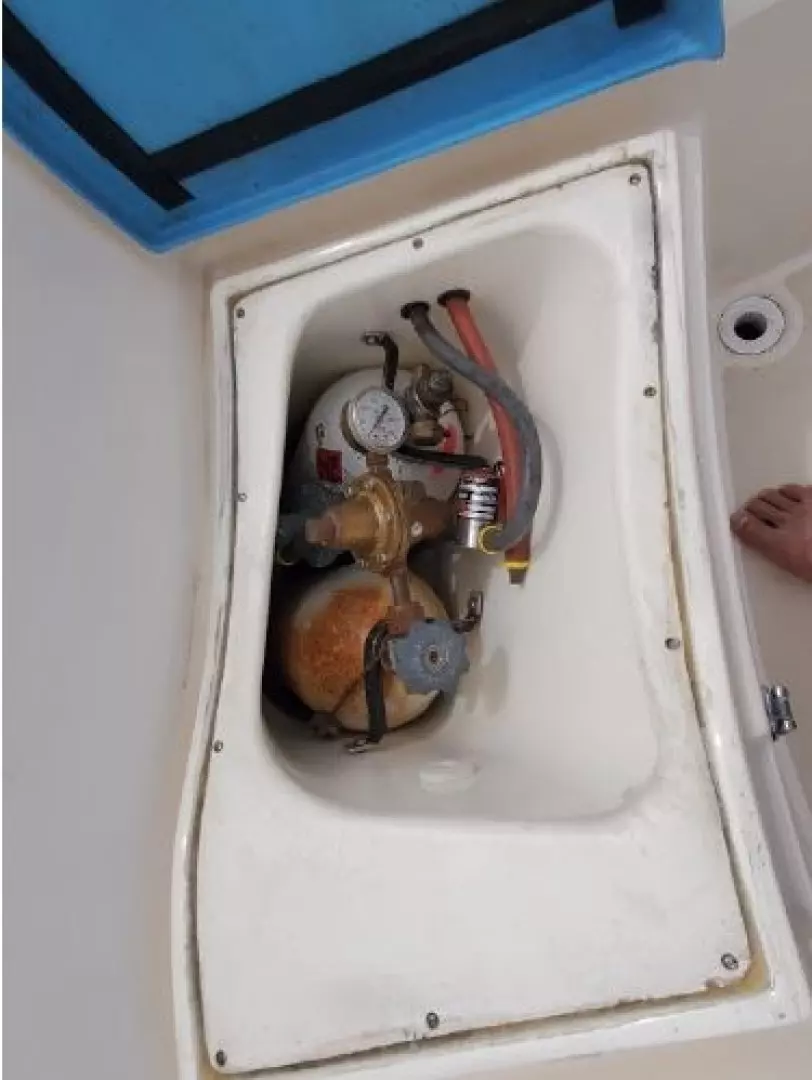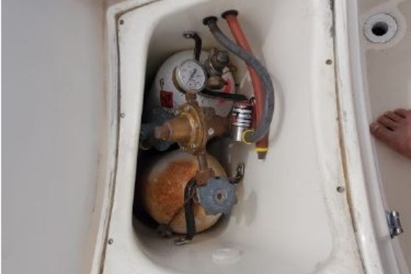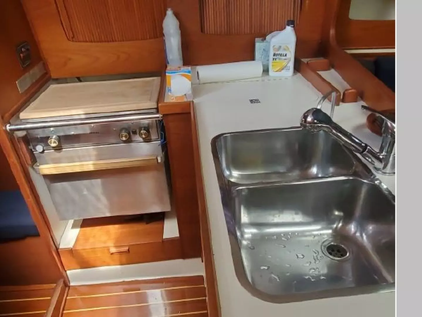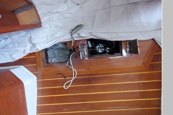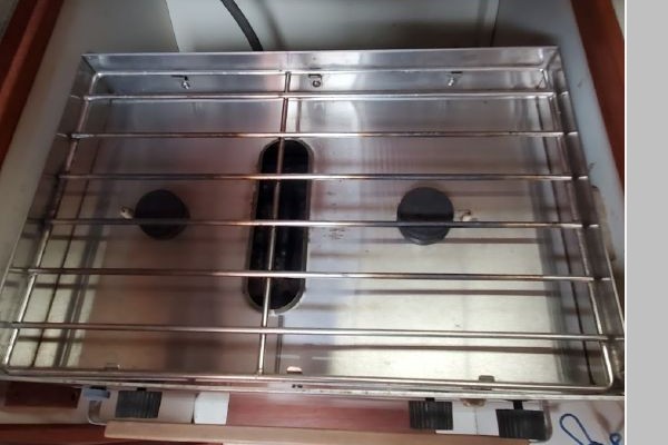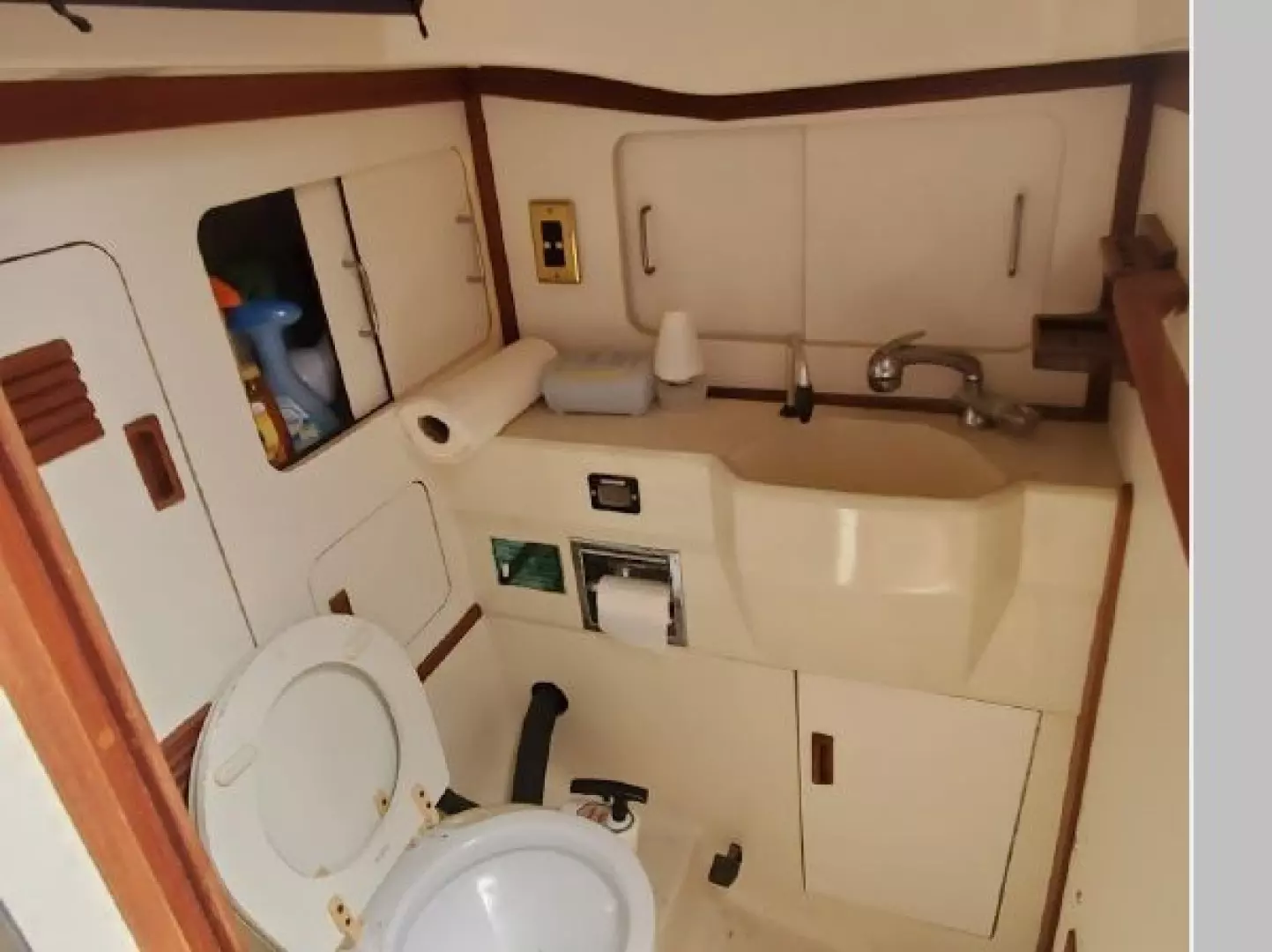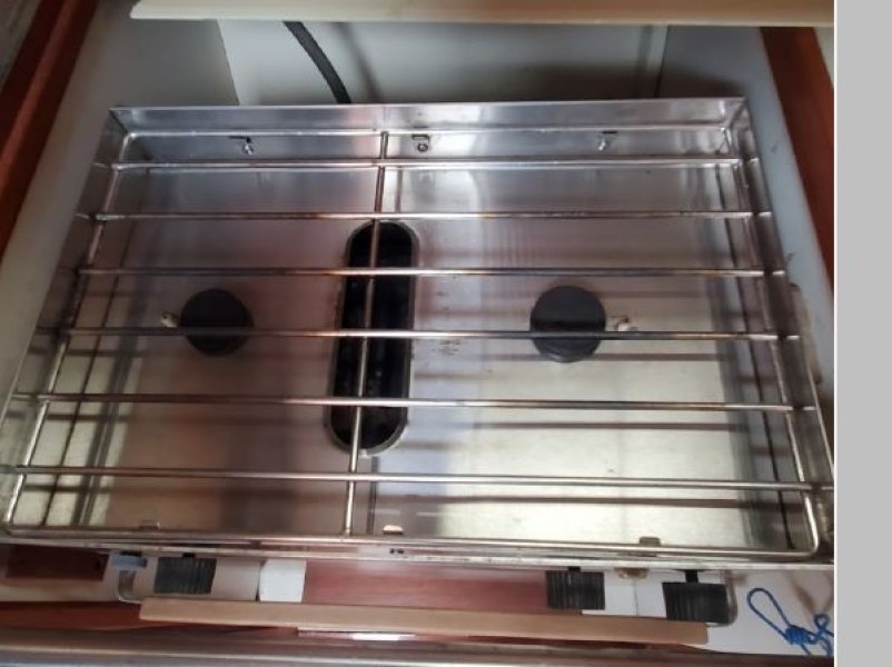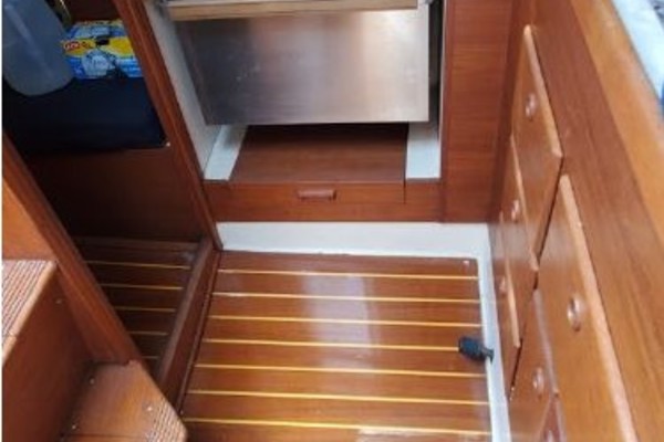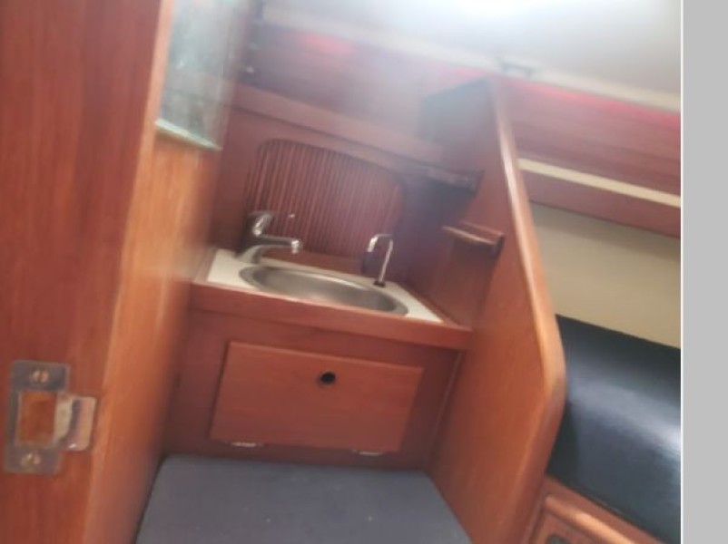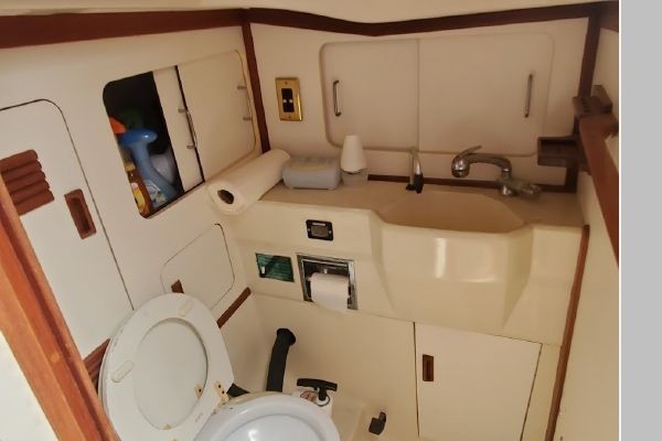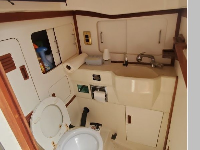 The Galley feature a refrigerated icebox, GNG Stove with oven, Twin Stainless Steel Sinks ample counter space with drawers and storage. The Head is located to Starboard at the base of the companionway stairs. This location allows for easy changing of foul weather gear without having to walk through the Saloon.