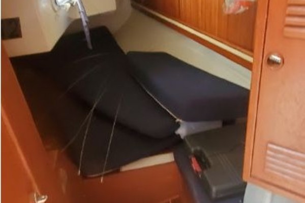 The forward stateroom has two 6'4" V berths with a filler cushion. There is a hinged cabin door that swings open to cover the hanging locker and shelf to starboard. On the port side of the cabin is a bulkhead-hung mirror, stainless steel vanity sink and counter, with hot and cold water. There is ample storage behind a teak tambour-door cabinet and an open shelf. Additional storage is found along hullside shelves, two lower cabinets with flipdown doors and two bins under the V-berth cushions.