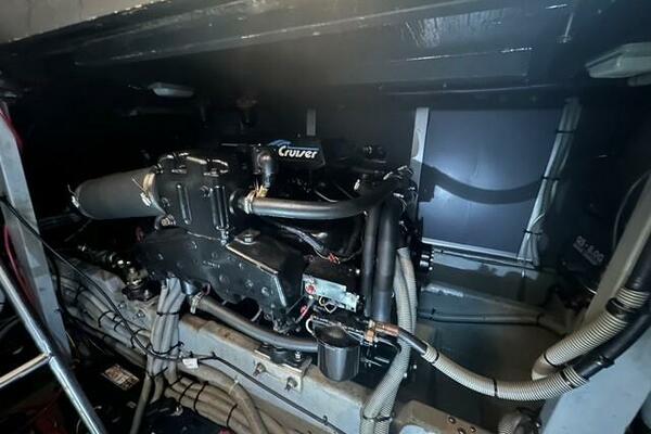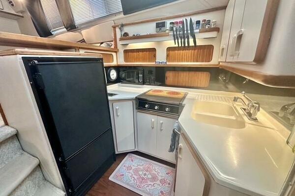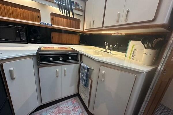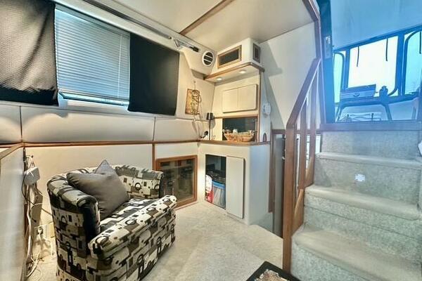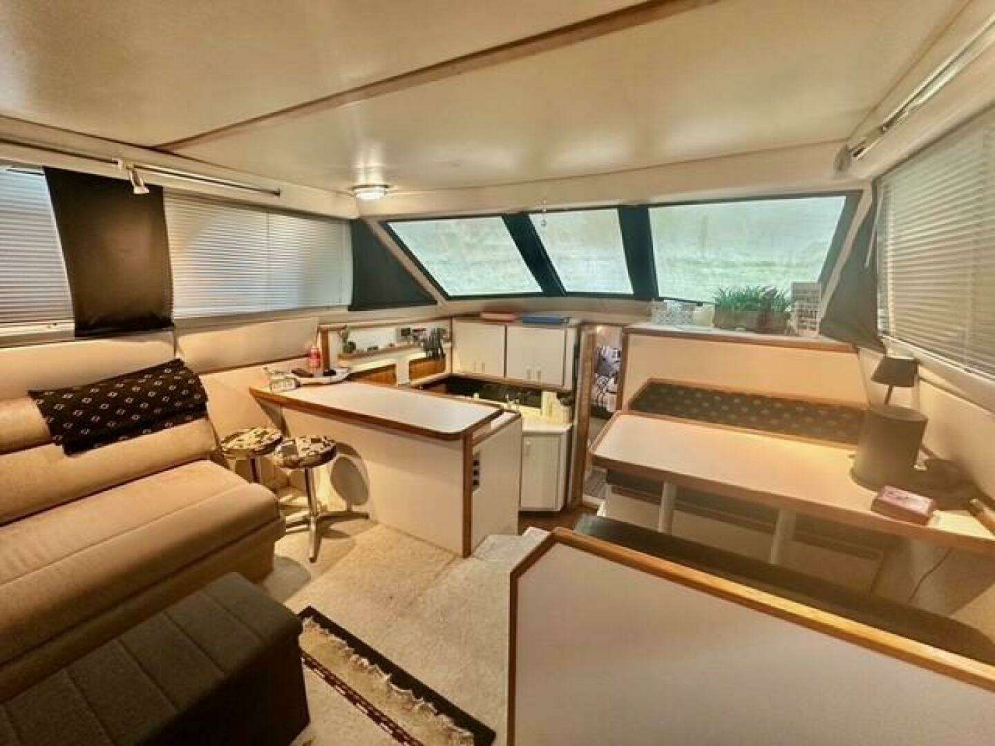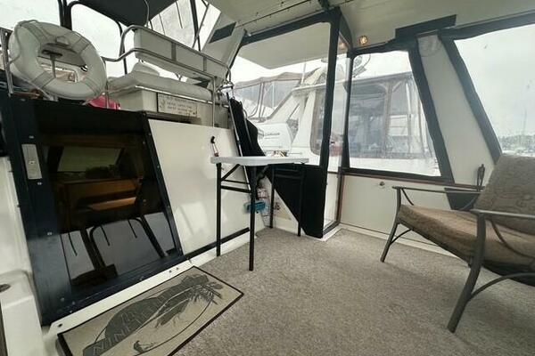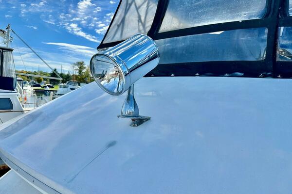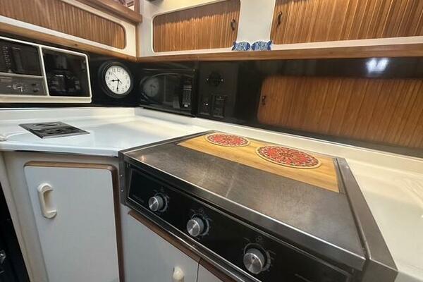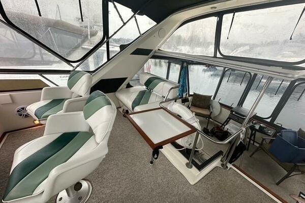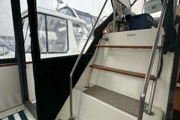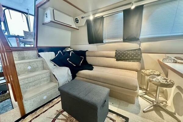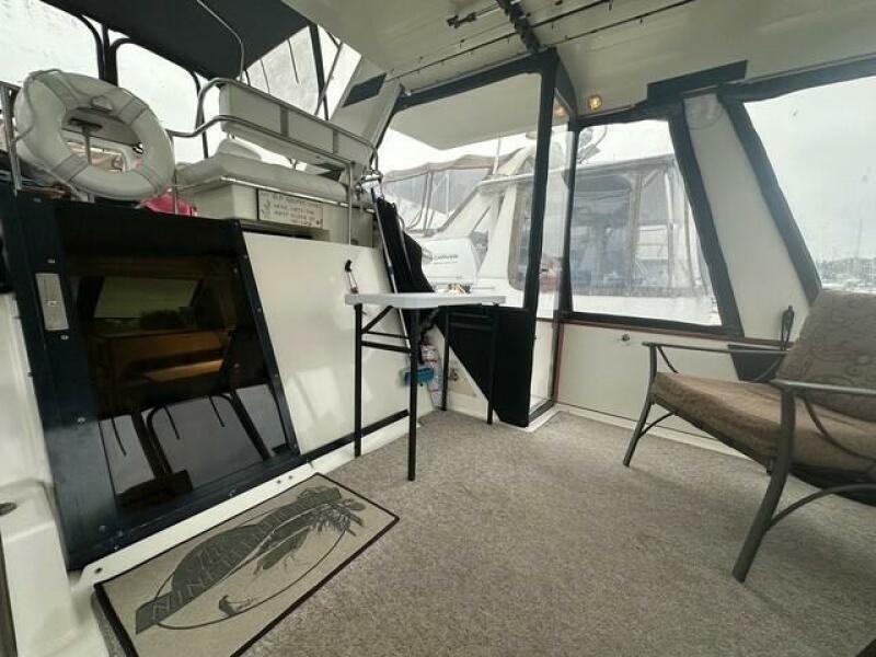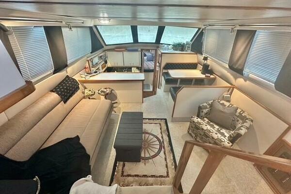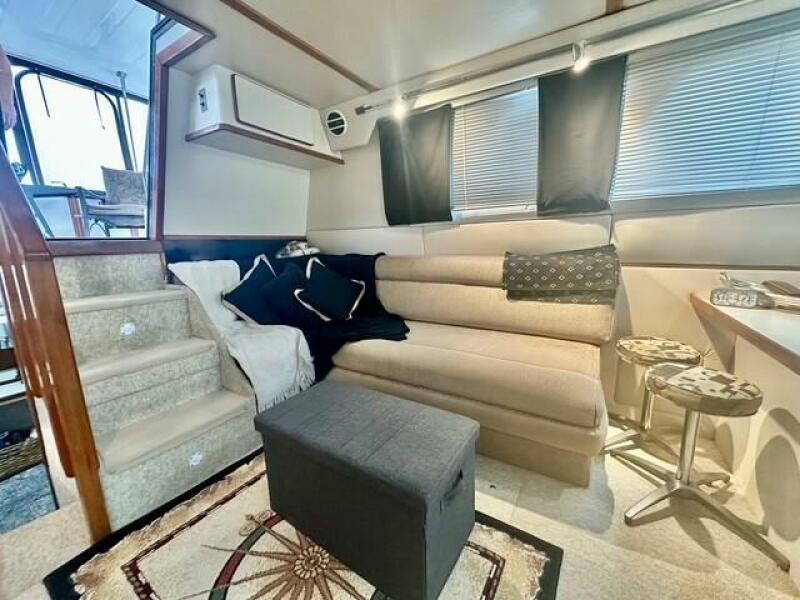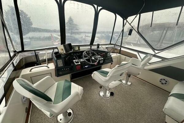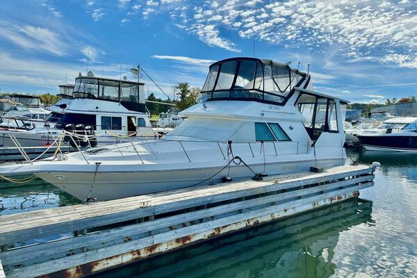 Traditional double-cabin cruiser offered contemporary styling, expansive accommodations at a competitive price. Galley-down interior features roomy salon with L-shaped sofa, convertible dinette, breakfast bar, large aft stateroom with vanity and closet. Lower helm station was optional. Wide side decks afford easy fore-deck access. Fly-bridge has guest seating aft of helm. Radar arch was standard.