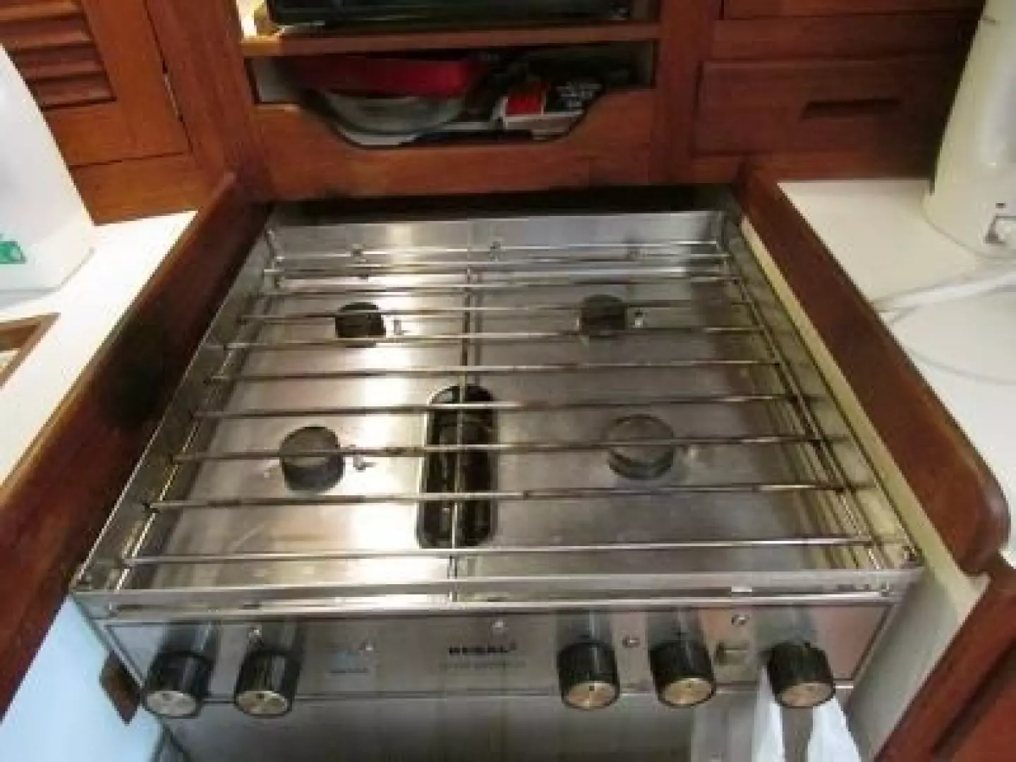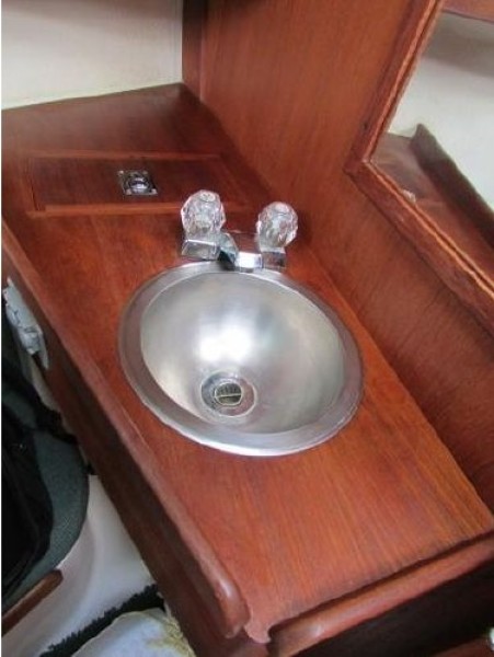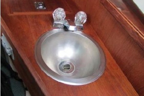 - Double bowl stainless sink on the centerline above engine enclosure with hot and cold pressure water and fresh water foot pump.