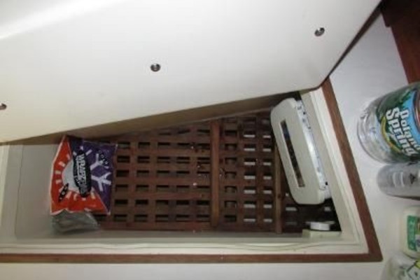 In the main salon there is a U-shaped dinette to starboard with filler boards and cushion for double berth, a drop leaf dining table on centerline with storage and drawers, and a settee/single berth opposite. Under the berths are the water tanks, batteries and refrigeration unit.