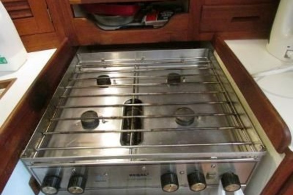 The galley is U-shaped with the sinks on centerline over the engine enclosure, a large refrigerated ice box, a 4 burner stove with oven, a microwave and additional drawers and cupboards.