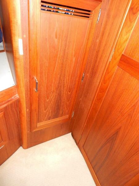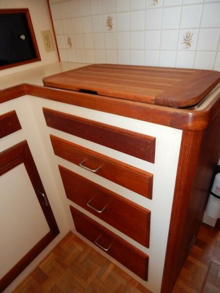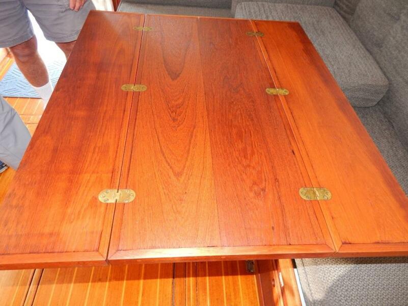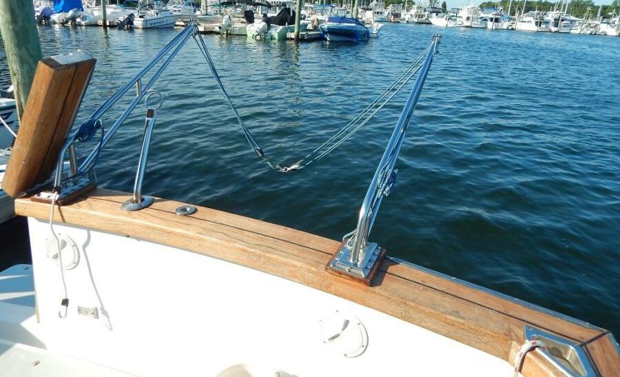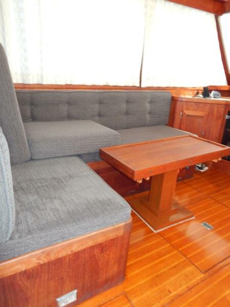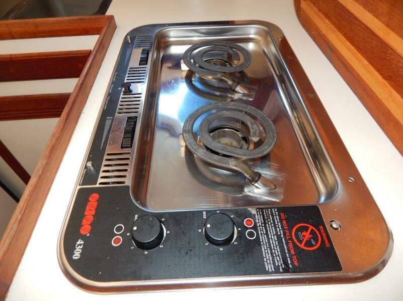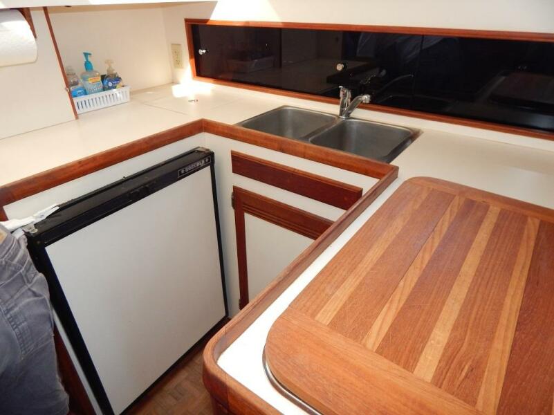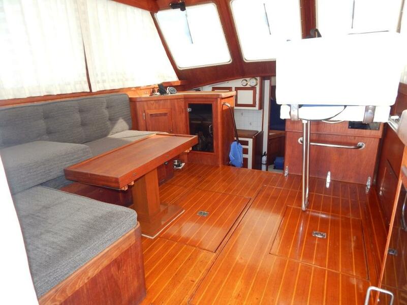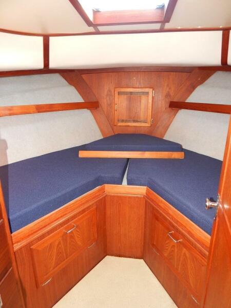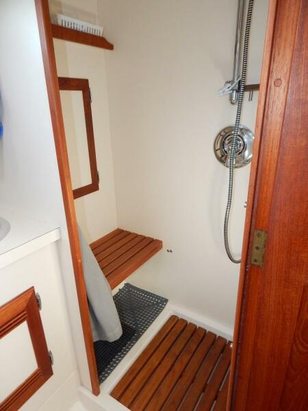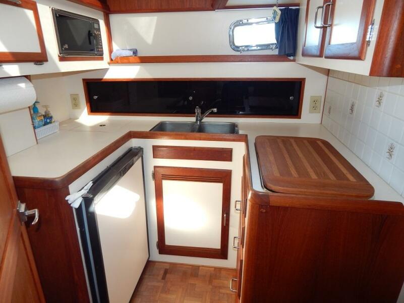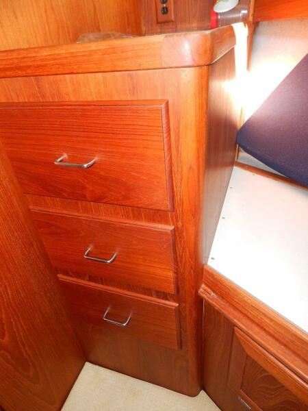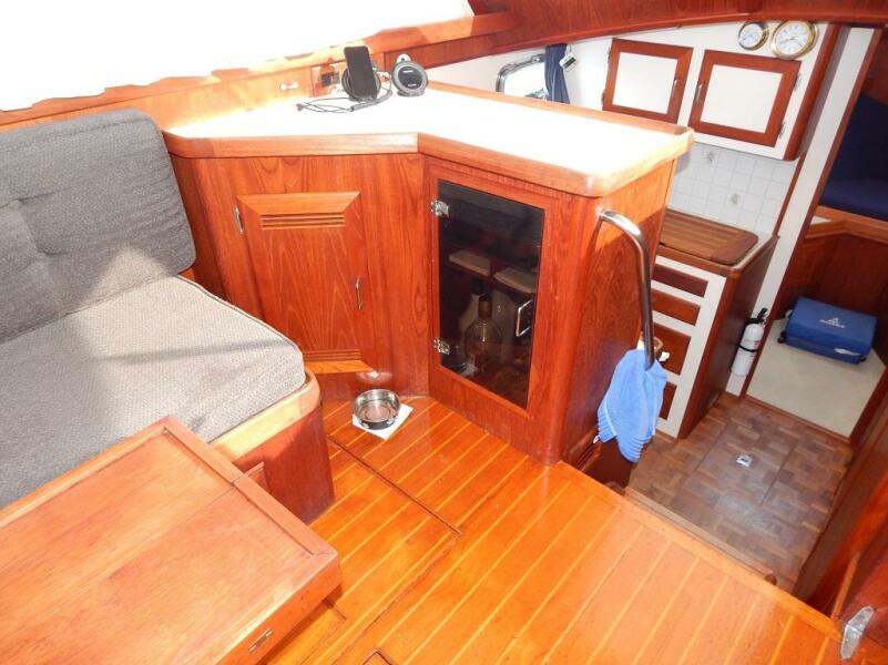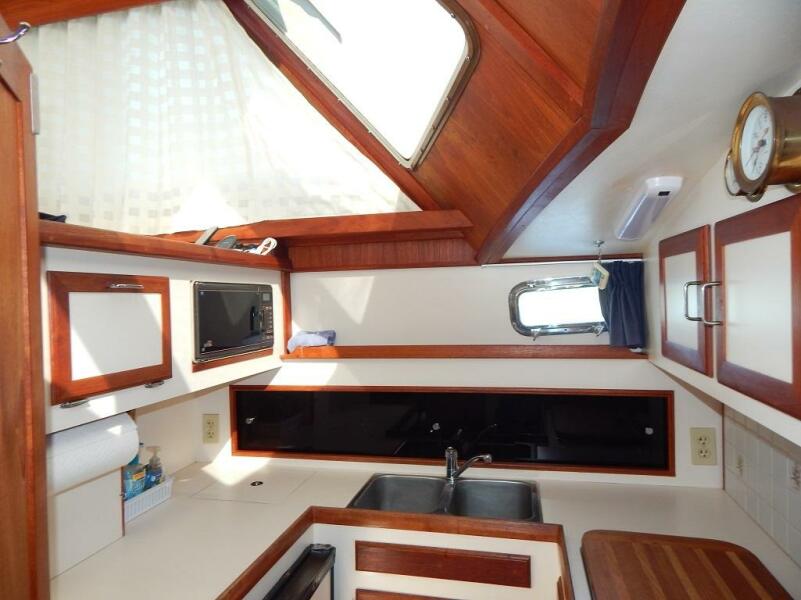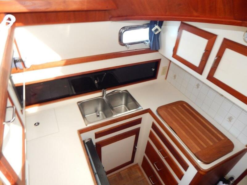 The salon interior is teak bulkheads, with teak joinerwork and cabinetry with teak and holly sole. The galley has teak parquet sole and the V-berth has fitted carpet. The galley and head have white laminate joinerwork in the Herreshoff style with teak trim and drawers, laminate countertops and tile behind the stove for a nice bright finish.