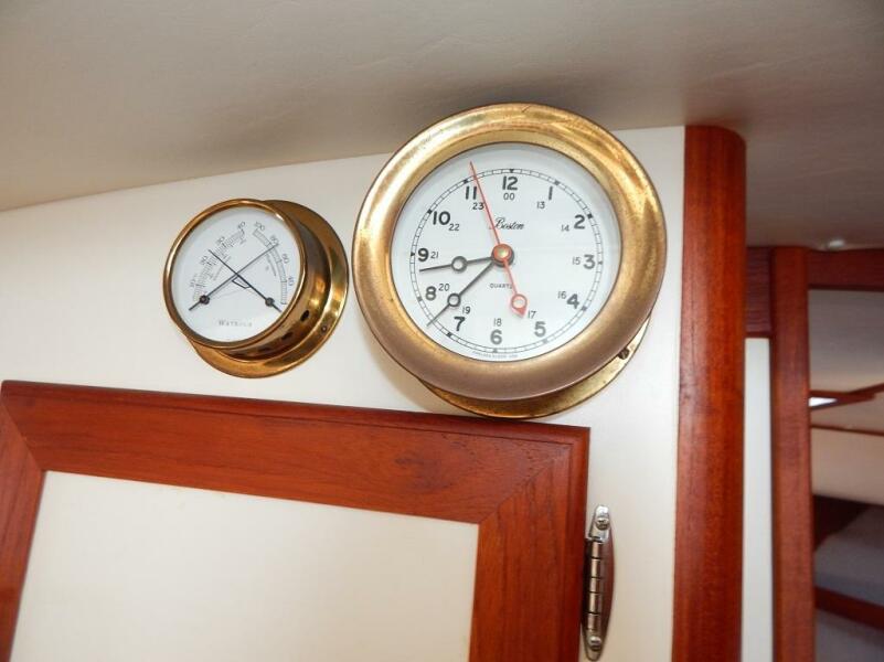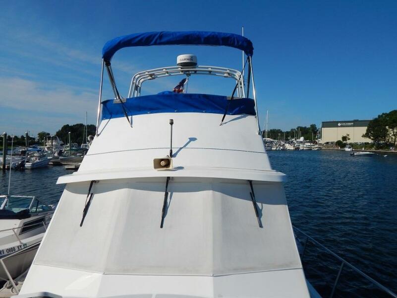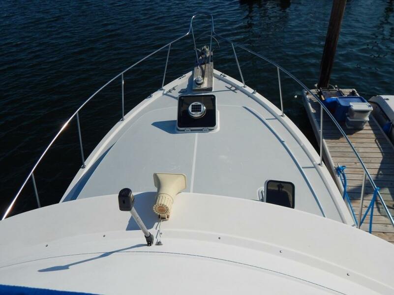There are 2 overhead hatches below and 4 stainless steel opening ports for ventilation. The pilothouse has 3 windshields with covers, 4 sliding side windows and one aft sliding window and the sliding door to the cockpit.