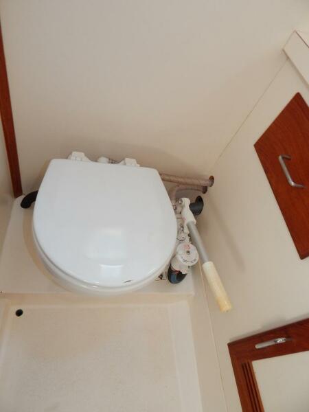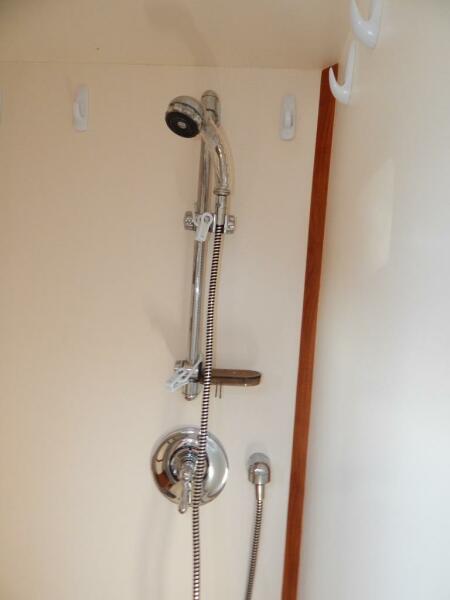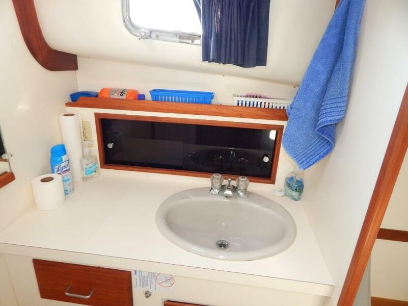 Furthest forward is the V-berth with filler, teak shelves and storage below, aft to port are storage drawers, to starboard is the hanging locker. Next aft is the U-shaped galley to port and the enclosed head with separate shower stall to starboard. Up 3 steps to the salon with the convertible L-shaped settee with teak hi-lo dining table to port and the helm to starboard. There are white curtains in the salon and nice blue cushions throughout. Headroom is 6 foot 4 inches in the salon and galley. 6 foot 1 inch in the V-berth and head.