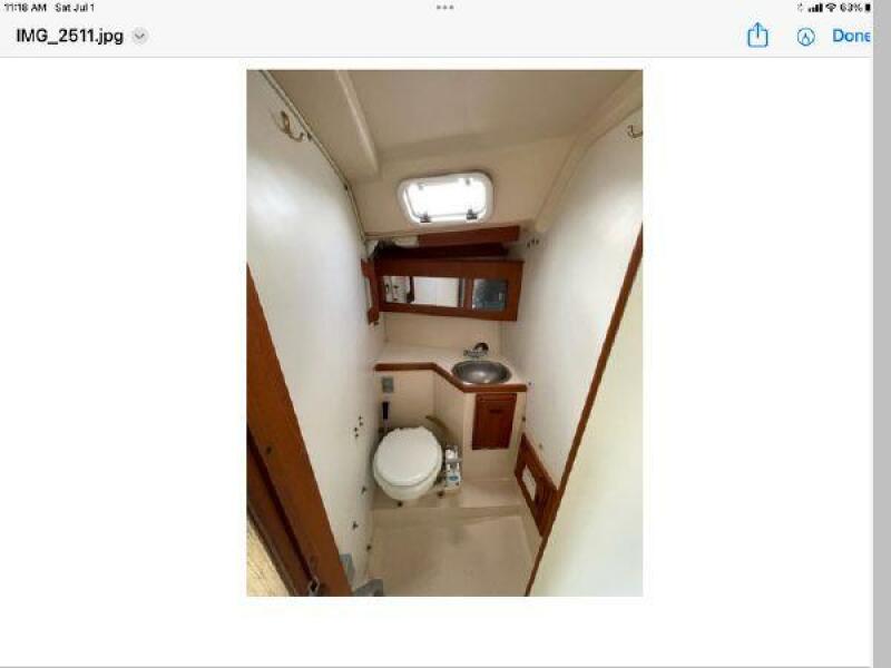 - Enclosed head compartment with marine toilet, vanity and sink