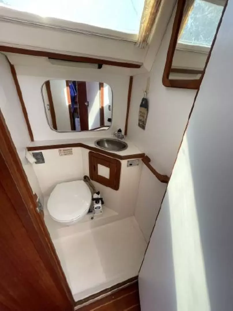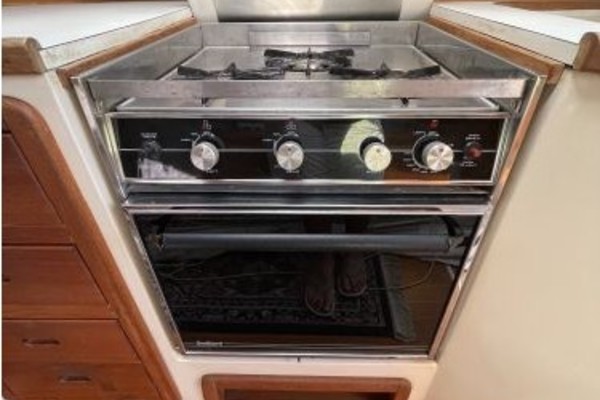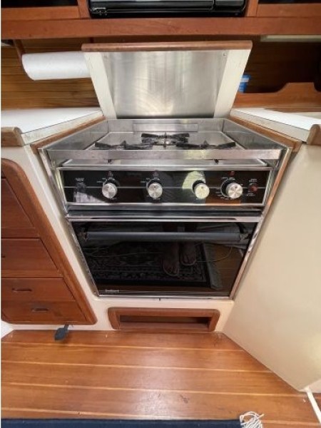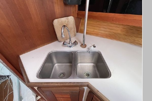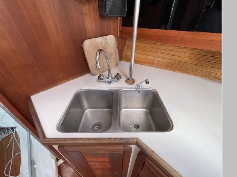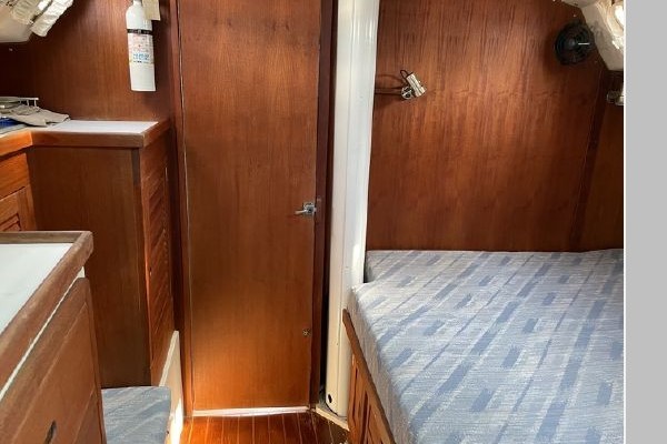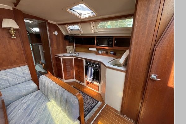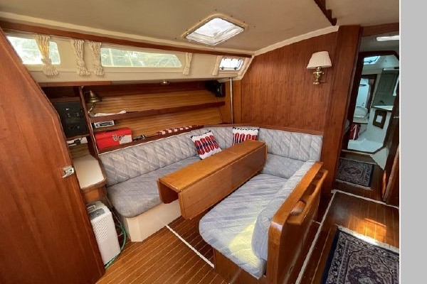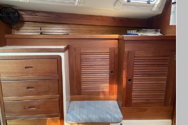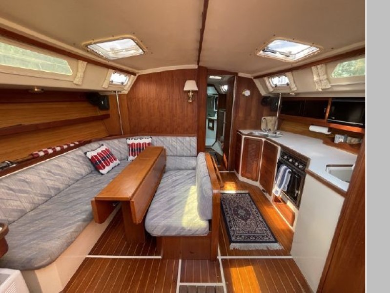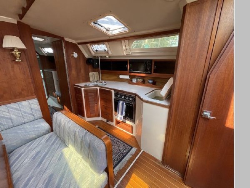 The main salon is extremely large and very accomodating. She has an L-shaped dinette to port, shelves outboard. A fixed drop leaf table and mid-ships bench with back allows 6 to dine in comfort. Opposite the dinette is her starboard side galley, reaching the full length of the salon. Lovely soft blue cushions, teak cabinetry and teak and holly sole greet you with warmth yet she is bright and airy. Here too one will find opening ports and 2 overhead hatches.