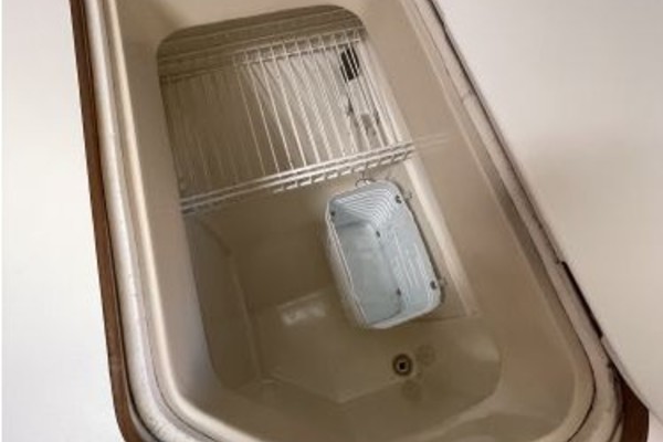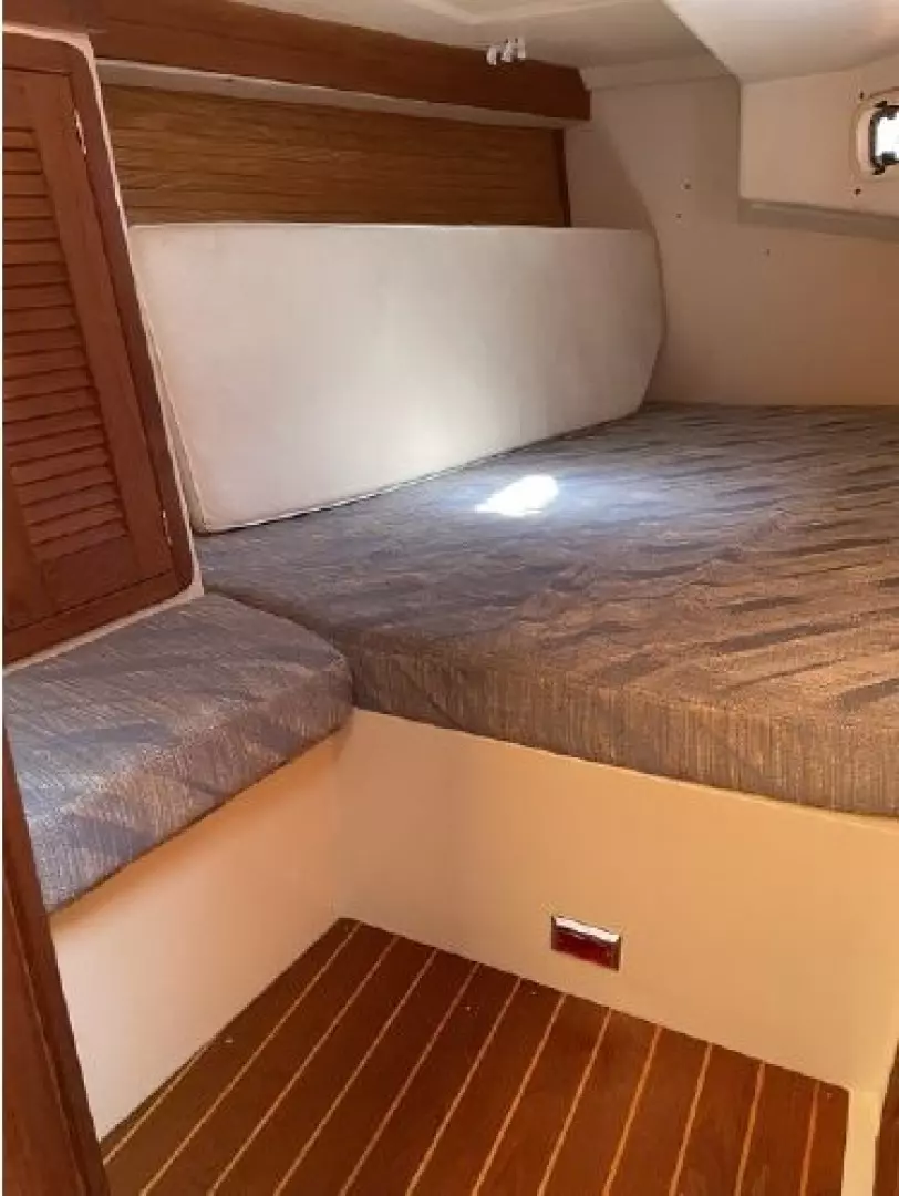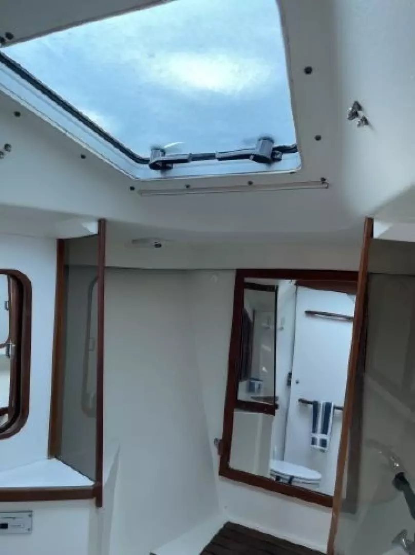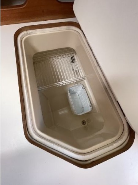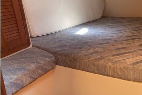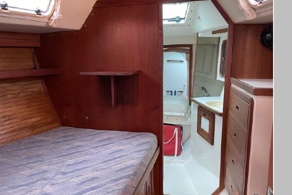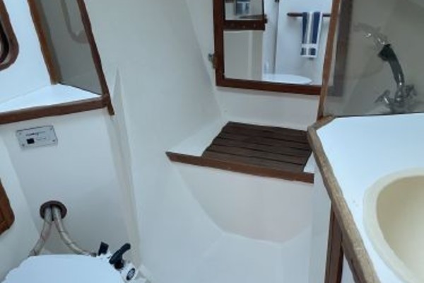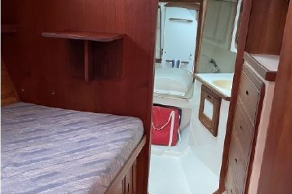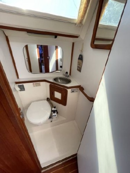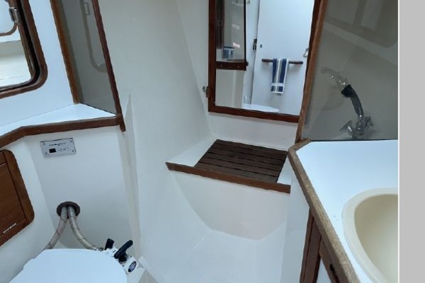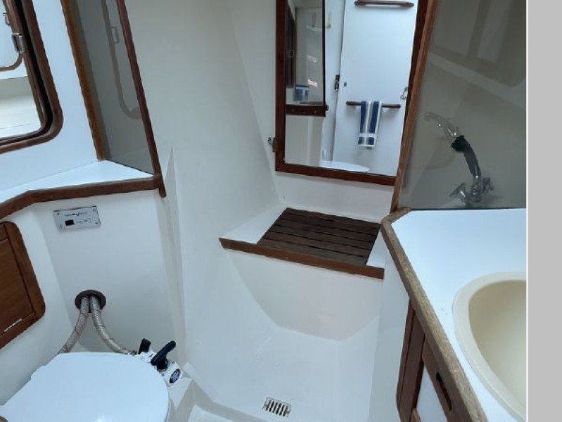 Forward is a storage locker under and behind the anchor locker and accessed via a mirrored door in the master head. Next is the very large master head. The shower area is forward with bench seat followed by the vanity with sink to starboard and toilet opposite to port. Plenty of storage in cabinets outboard and under. Her large overhead hatch gives her excellent ventilation.