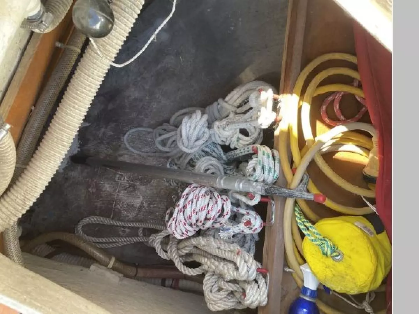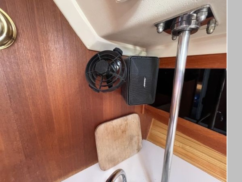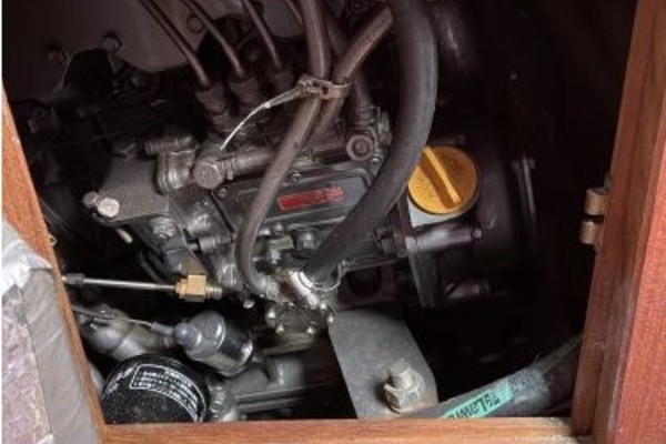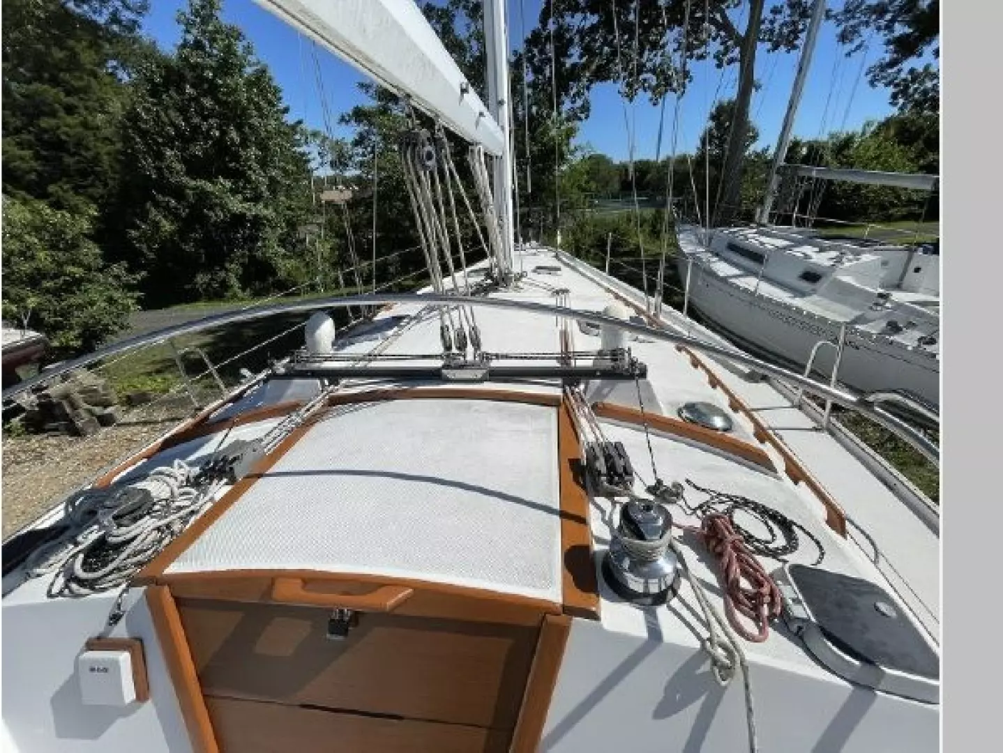 Access to the engine is via the centerline companionway steps as well as 2 access points in the starboard aft cabin. She has a wonderfully large and comfortable T-shaped cockpit allowing for a large wheel. Teak cockpit grate, 2 aft lockers for extra deck gear, walk out transom to her scooped platform for ease in boarding or swimming. Her combings are angled appropriately for one to sit on the windward side comfortably. Her well thought out design with low profile cabin gives you excellent site lines from the cockpit. Access around the foredeck is made easy by her wide decks and flat surface.