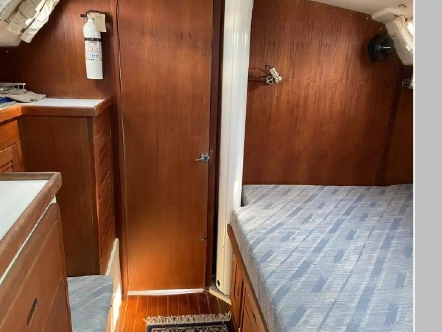 Aft of the dinette is her navigation station with electric panel, followed by a 2nd stateroom with double berth, locker, outboard shelf and 2 opening ports. Aft of the galley and opposite the Navigation station is the 2nd head with vanity, sink, toilet and telephone shower. Aft of the head is the 3rd stateroom with double berth, seat, locker, outboard shelf and 2 opening ports.