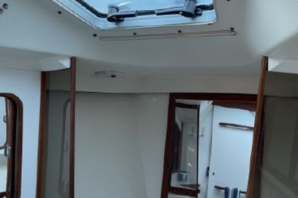 The Master stateroom is aft of the head and is a full athwartships room. There is a large double Pullman berth to port, outboard shelf, forward bulkhead shelf for TV and drawers under. The starboard side is all lockers with drawers, hanging locker and seat. Here too there is excellent ventilation via 4 opening ports and 2 overhead hatches.
