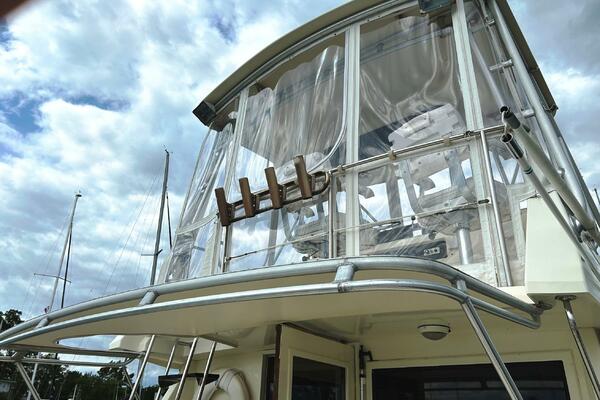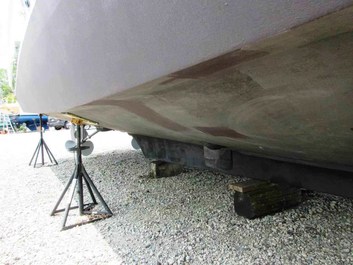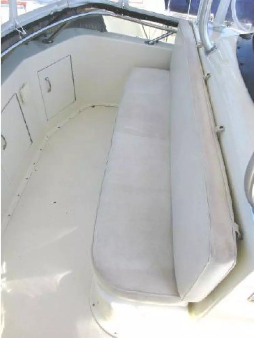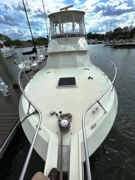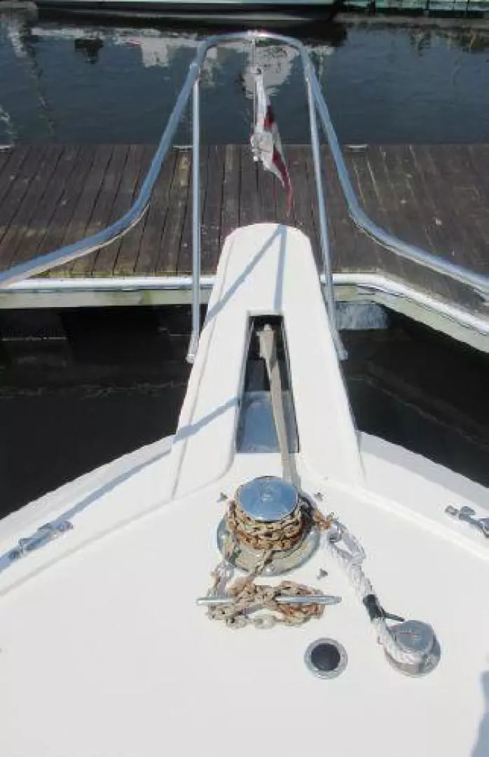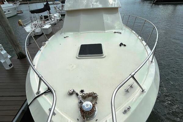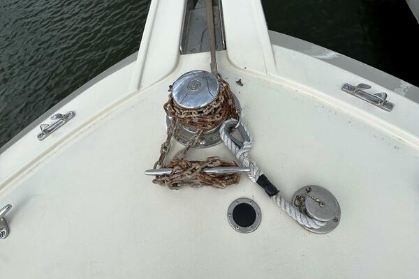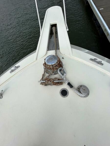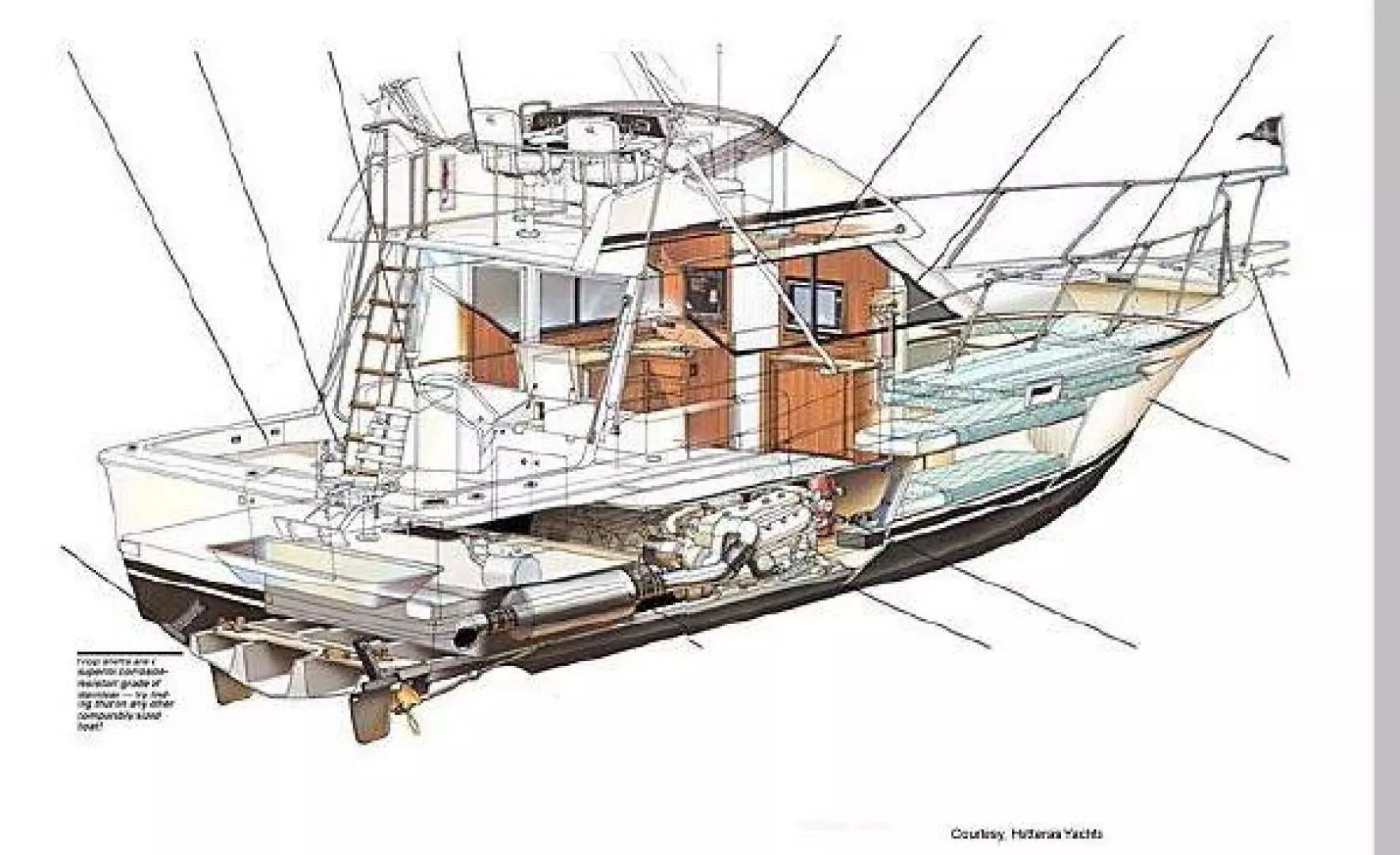 The HATTERAS 38 was built with a hand-laid up hull and with a shallow keel for good directional stability & protection. The hull is cored above the waterline w/ balsa for strength, reduced weight and insulation. The bottom is solid fiberglass. She has a modified "V" hull underbody.
