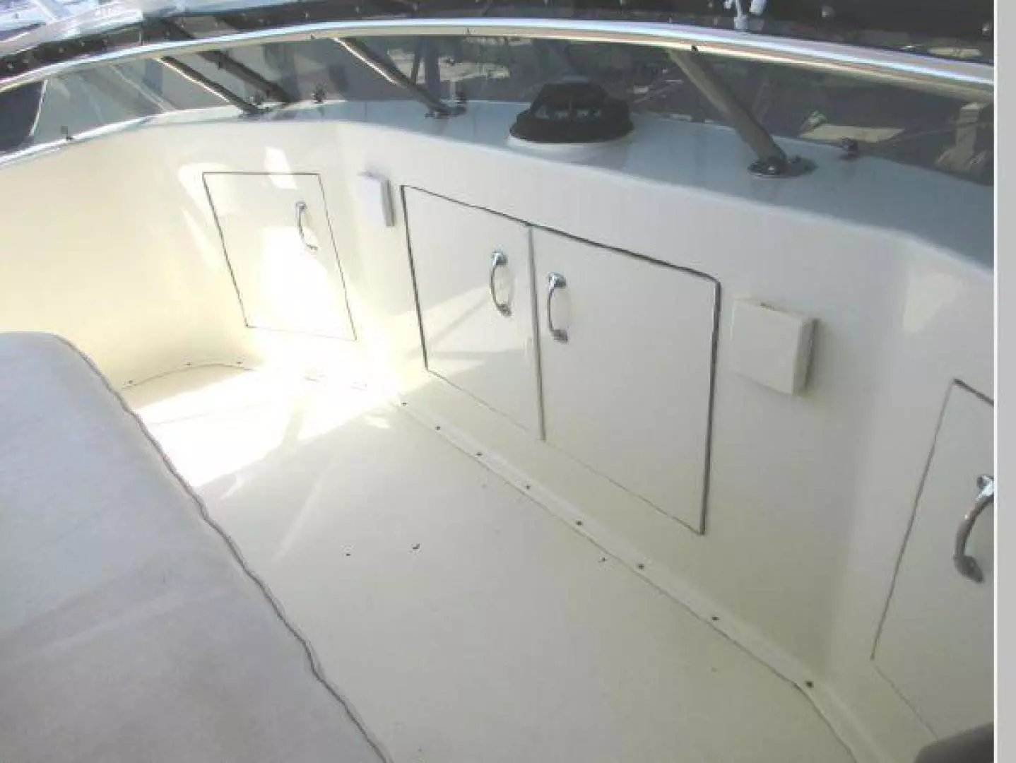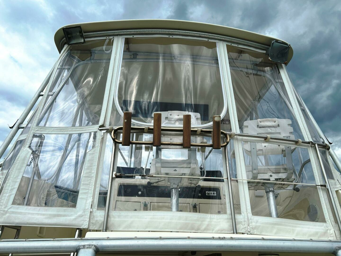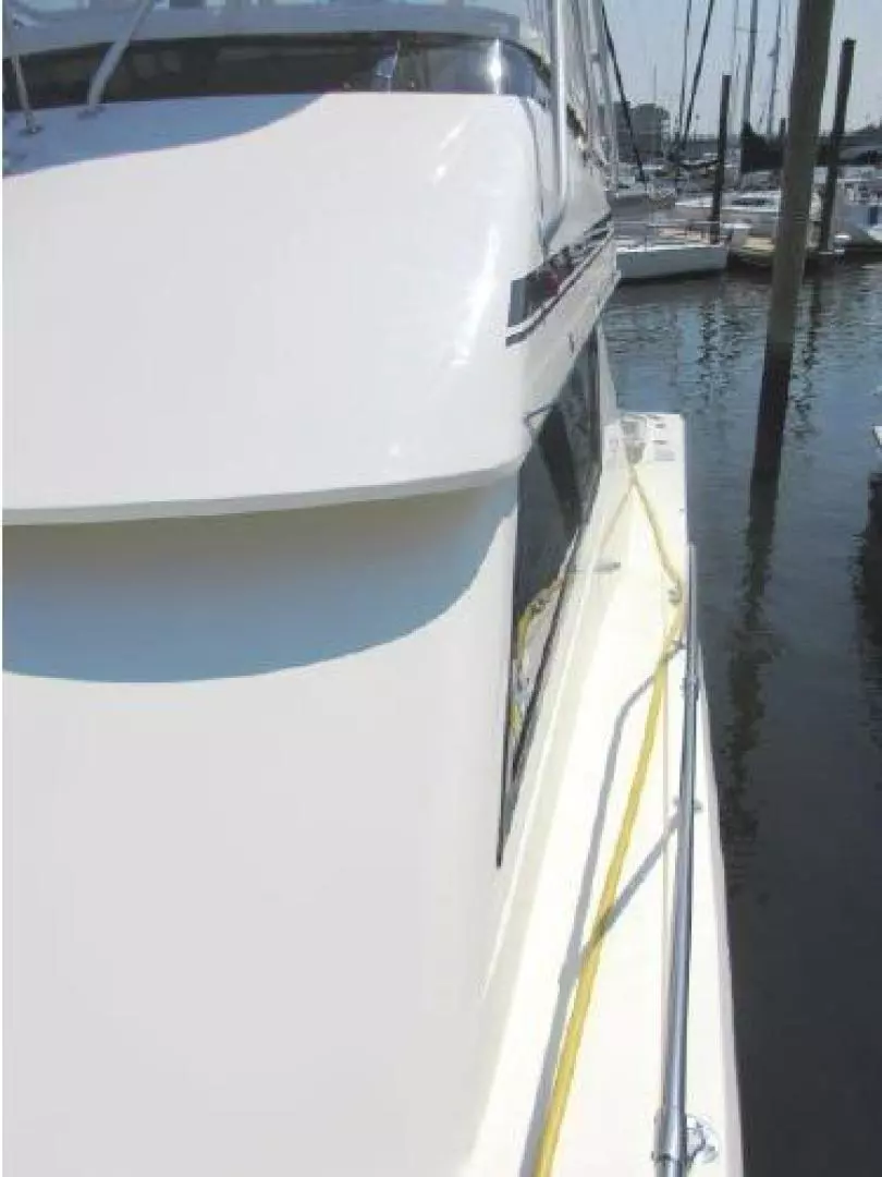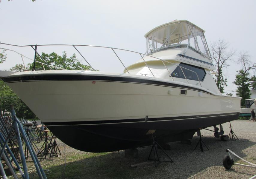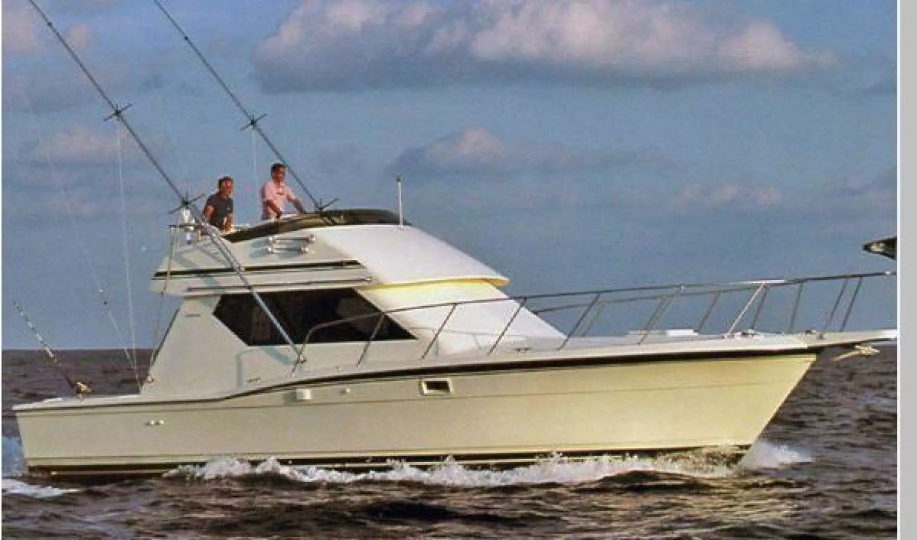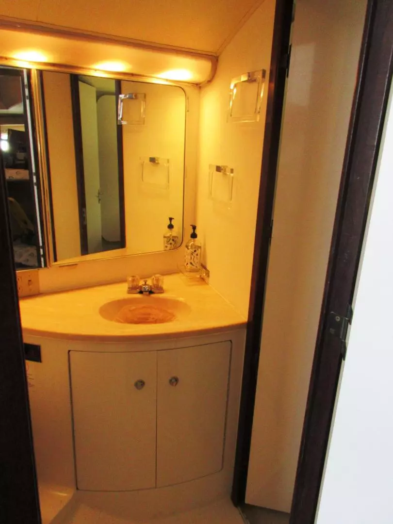 The HATTERAS 38 was built with a hand-laid up hull and with a shallow keel for good directional stability & protection. The hull is cored above the waterline w/ balsa for strength, reduced weight and insulation. The bottom is solid fiberglass. She has a modified "V" hull underbody.