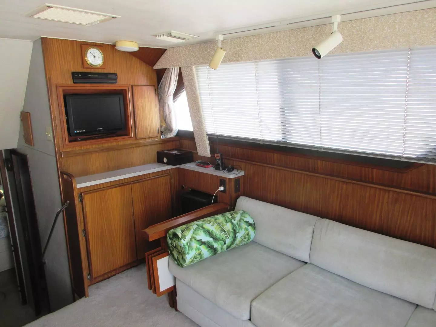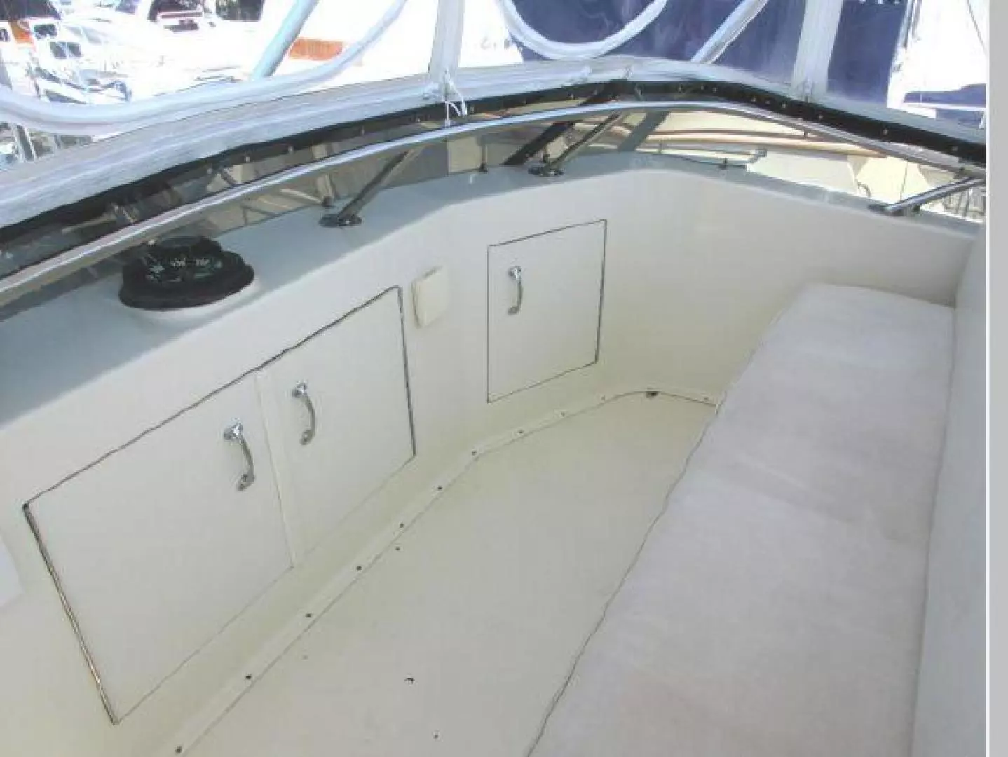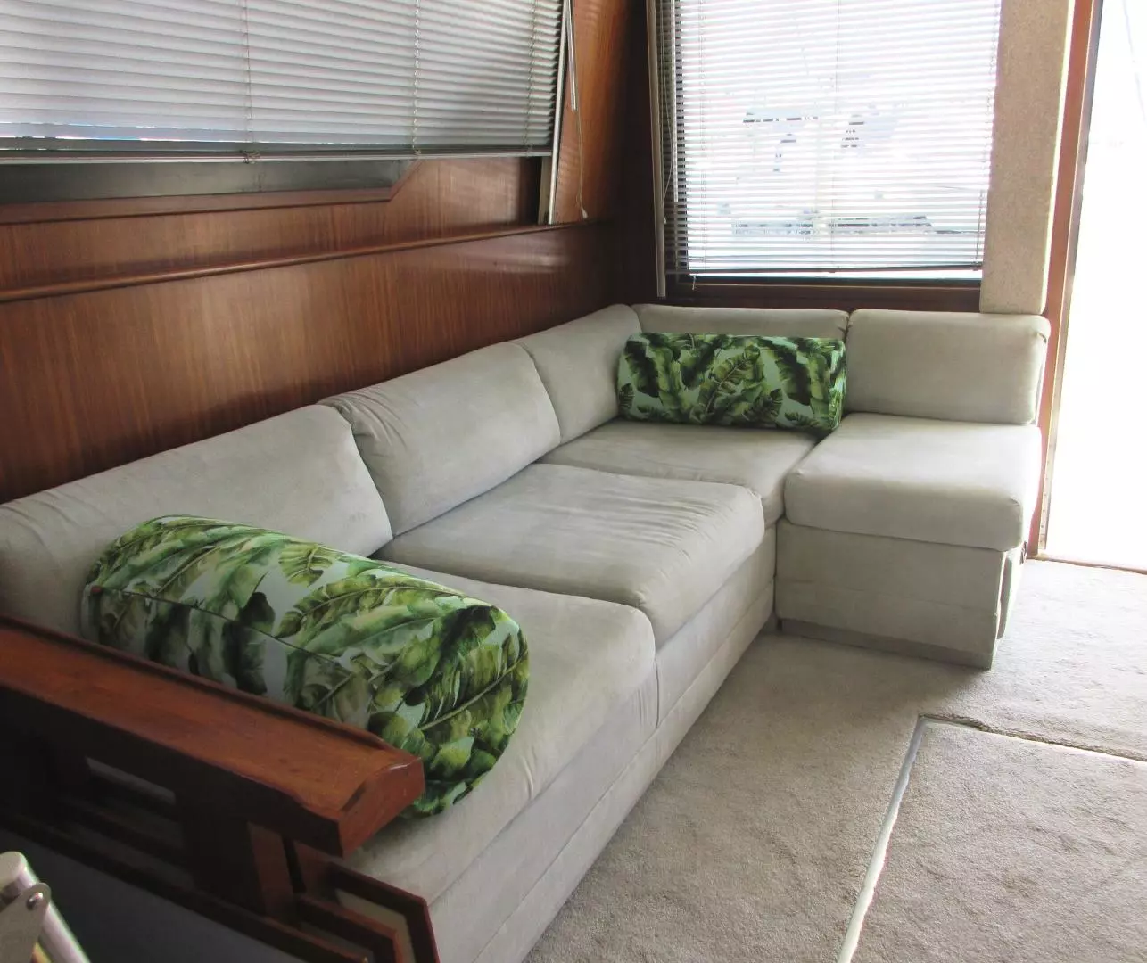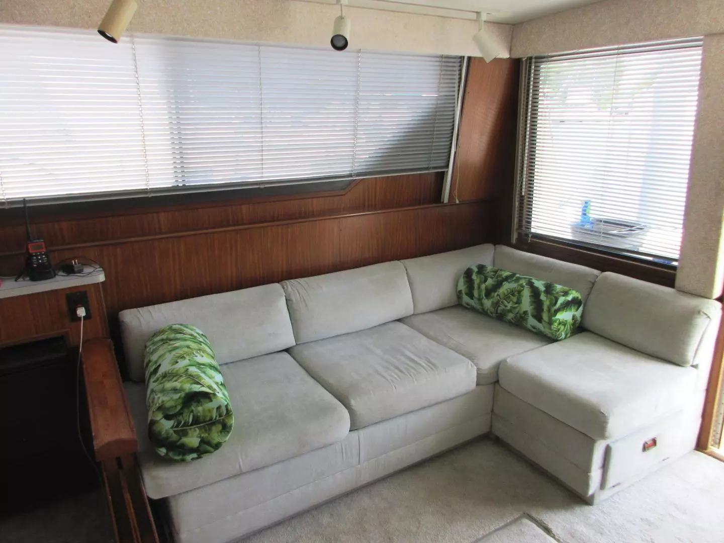 The HATTERAS 38 Convertible has the standard AFROMOSIA interior furniture paneling in the Salon. This material is a very durable "teak-finish" veneer over high-quality marine plywood as utilized by HATTERAS YACHTS for many years. Other sections forward are finished with off-white vinyl coverings.