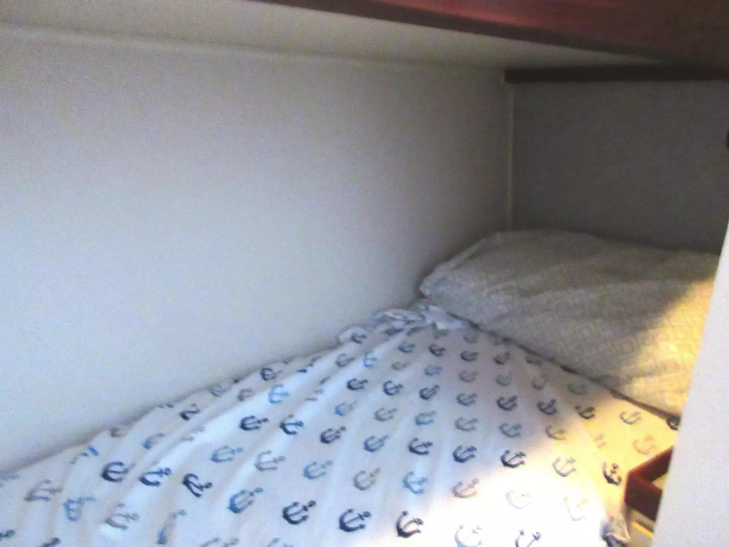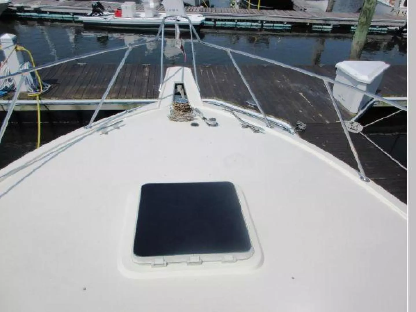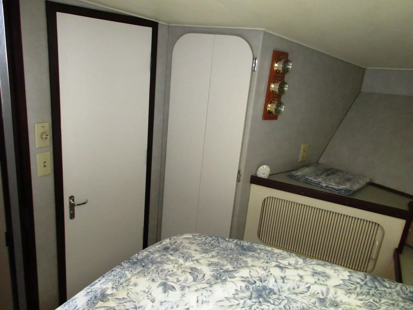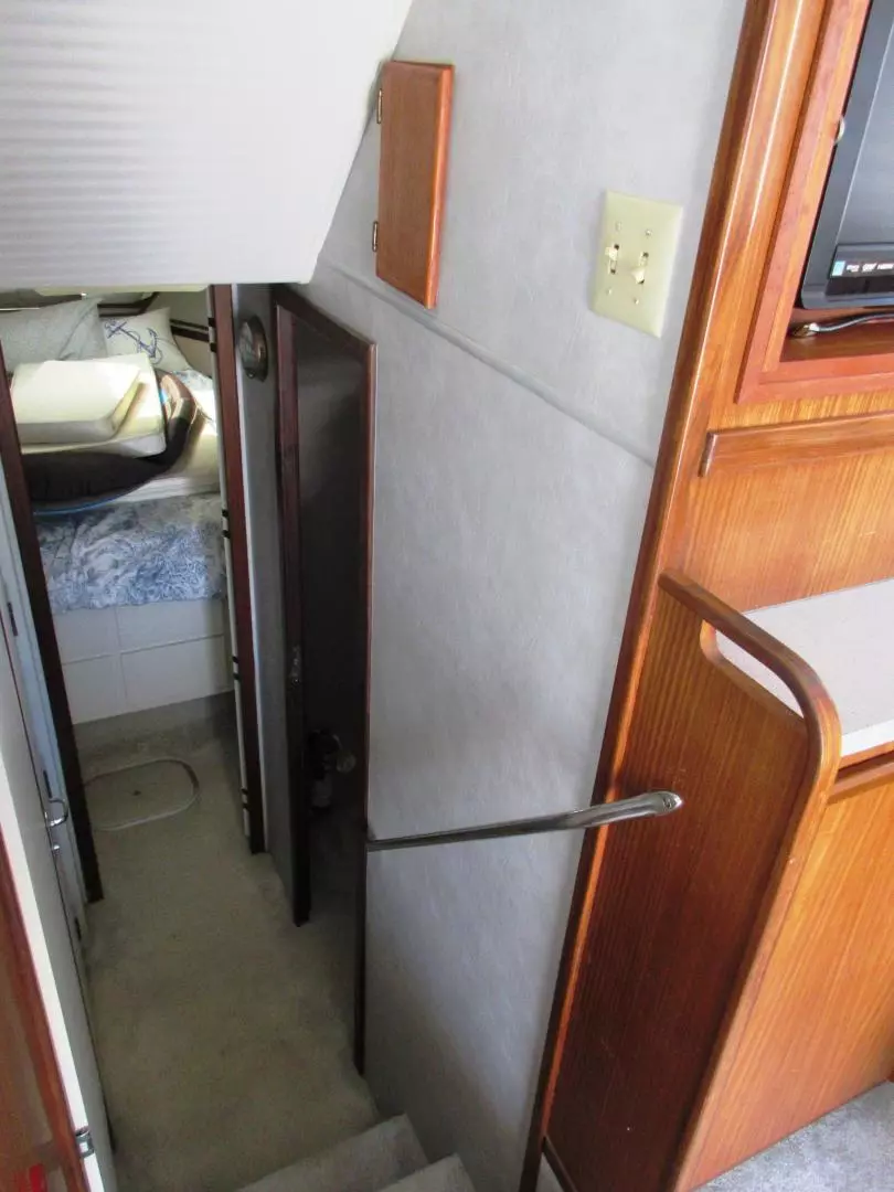 The basic layout details are best referenced in the included layout diagram. Entering the Salon area, the Settee and table are located to starboard. There's a separate seating area opposite. The Galley is "L" shaped and forward in the Salon, port side. The Head area with a separate shower enclosure is located on the port side and some (3) steps down from the Salon. Opposite the Head on the starboard side is the Guest Stateroom. It has an "over & under" bunk berth setup. The Master / Owner's Stateroom is forward a features a "Queen berth on centerline". There is side access to board the berth, port & starboard. There are two large hanging lockers & drawer storage provided. There is an ensuite entry for the Head on the port side aft of the Stateroom.