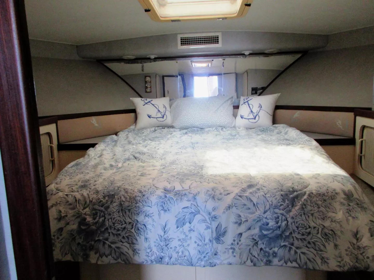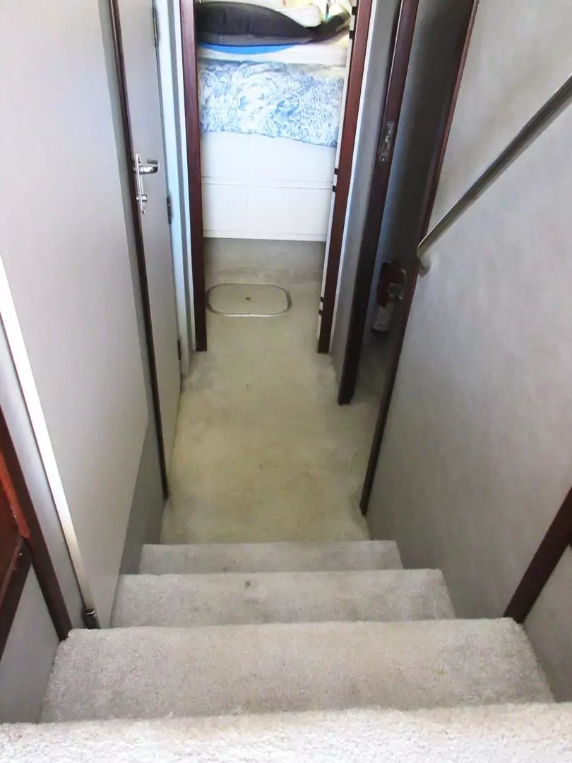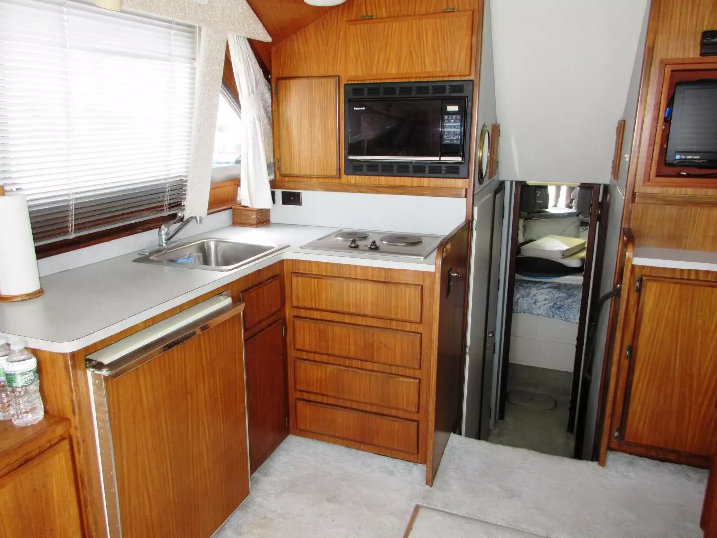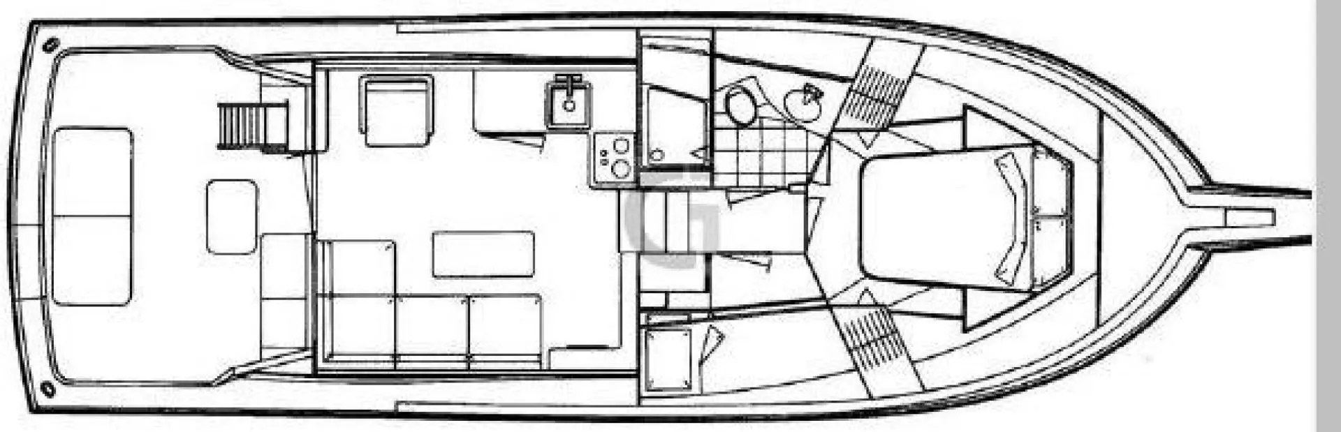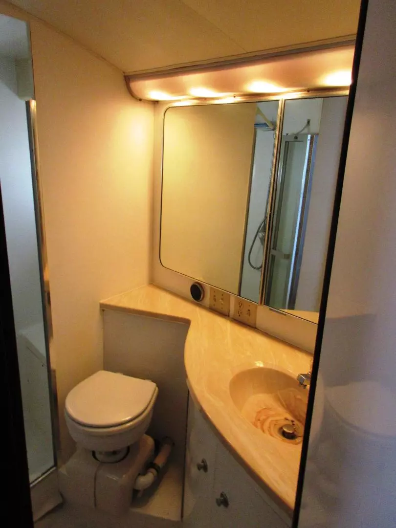 The basic layout details are best referenced in the included layout diagram. Entering the Salon area, the Settee and table are located to starboard. There's a separate seating area opposite. The Galley is "L" shaped and forward in the Salon, port side. The Head area with a separate shower enclosure is located on the port side and some (3) steps down from the Salon. Opposite the Head on the starboard side is the Guest Stateroom. It has an "over & under" bunk berth setup. The Master / Owner's Stateroom is forward a features a "Queen berth on centerline". There is side access to board the berth, port & starboard. There are two large hanging lockers & drawer storage provided. There is an ensuite entry for the Head on the port side aft of the Stateroom.