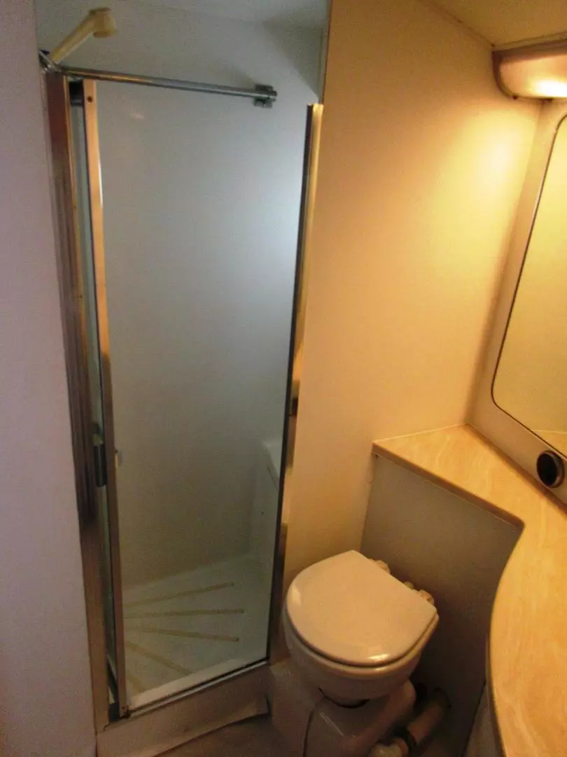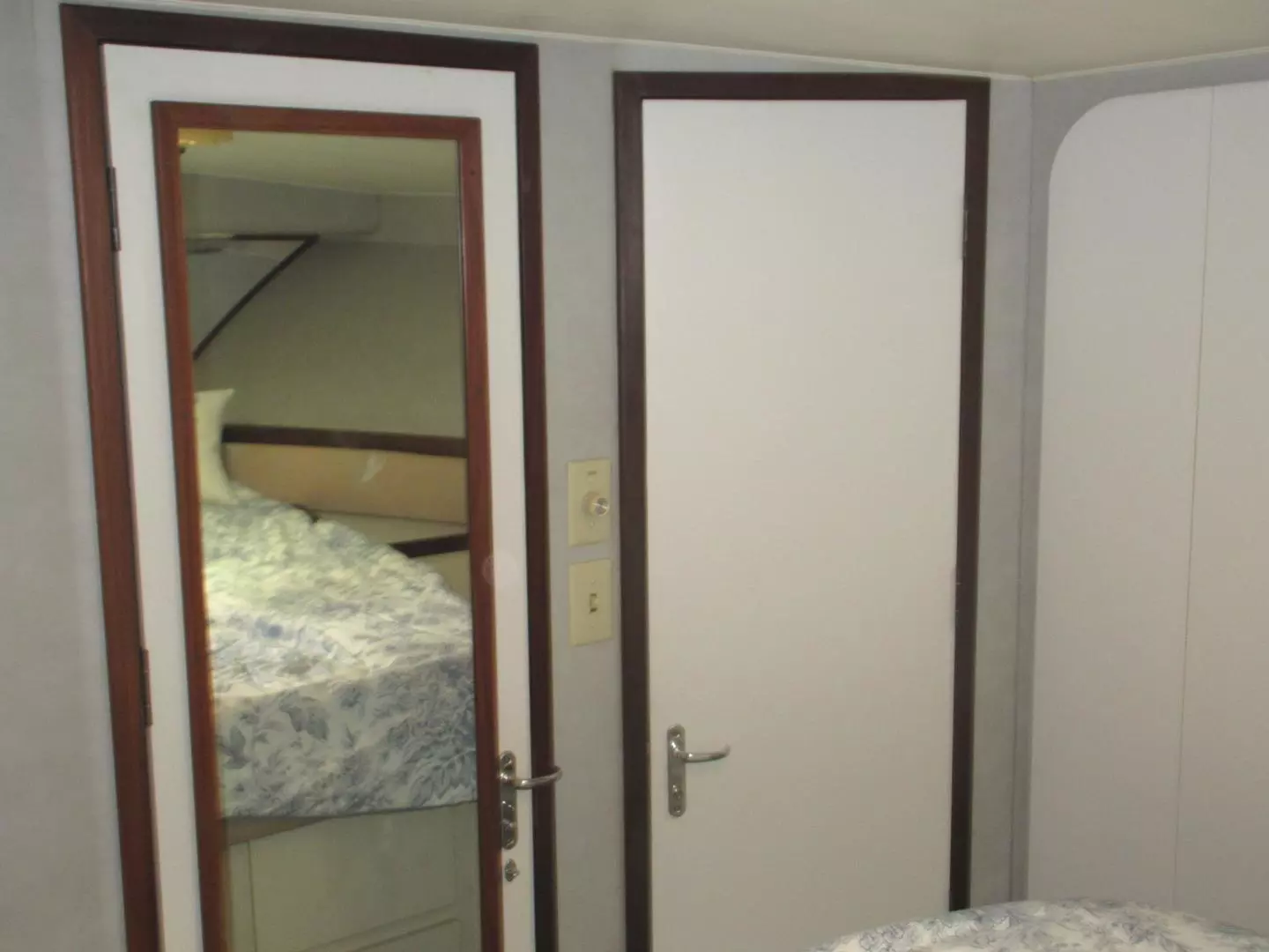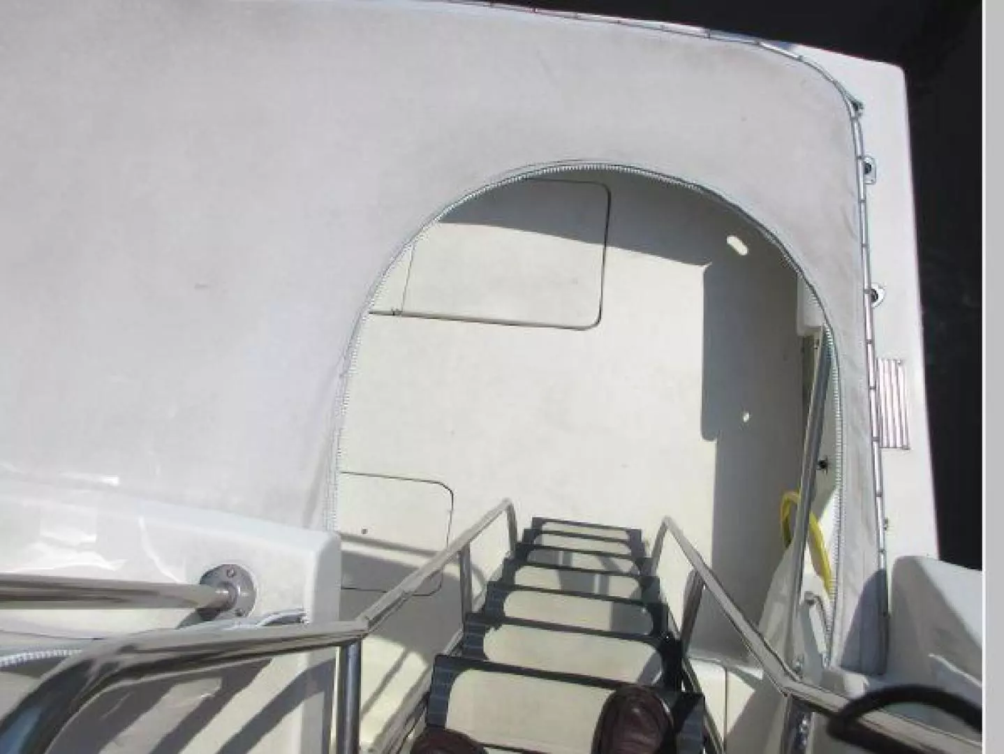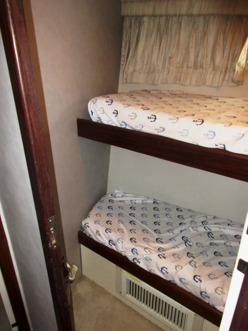 The basic layout details are best referenced in the included layout diagram. Entering the Salon area, the Settee and table are located to starboard. There's a separate seating area opposite. The Galley is "L" shaped and forward in the Salon, port side. The Head area with a separate shower enclosure is located on the port side and some (3) steps down from the Salon. Opposite the Head on the starboard side is the Guest Stateroom. It has an "over & under" bunk berth setup. The Master / Owner's Stateroom is forward a features a "Queen berth on centerline". There is side access to board the berth, port & starboard. There are two large hanging lockers & drawer storage provided. There is an ensuite entry for the Head on the port side aft of the Stateroom.