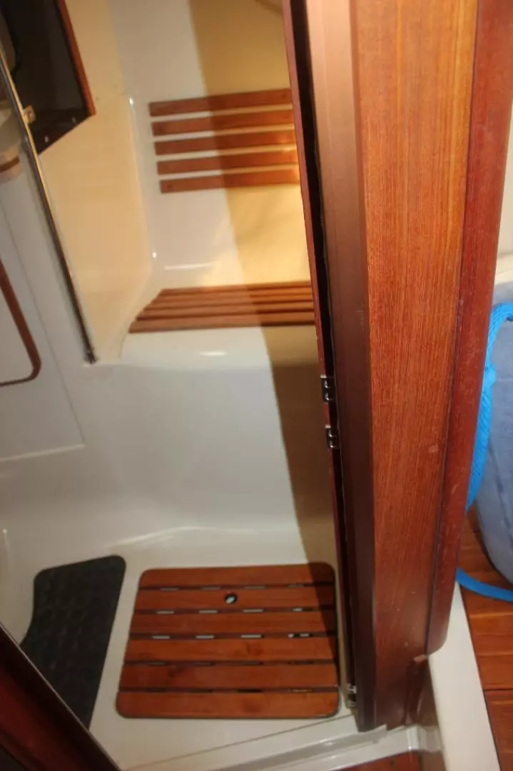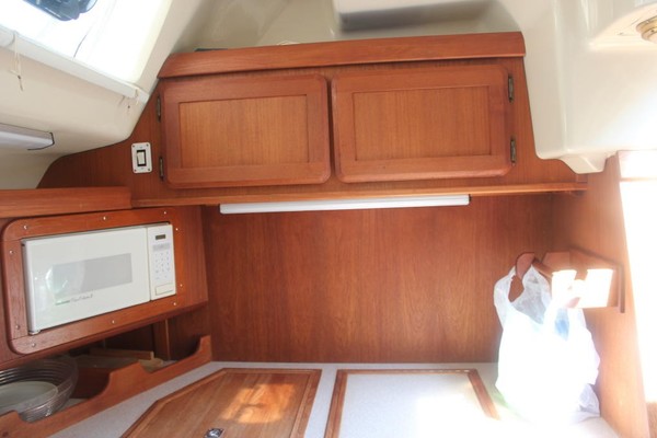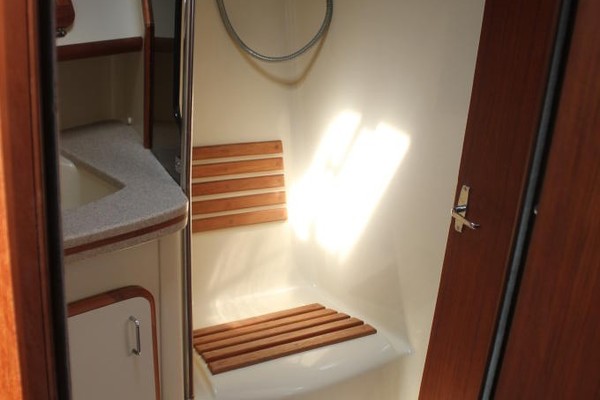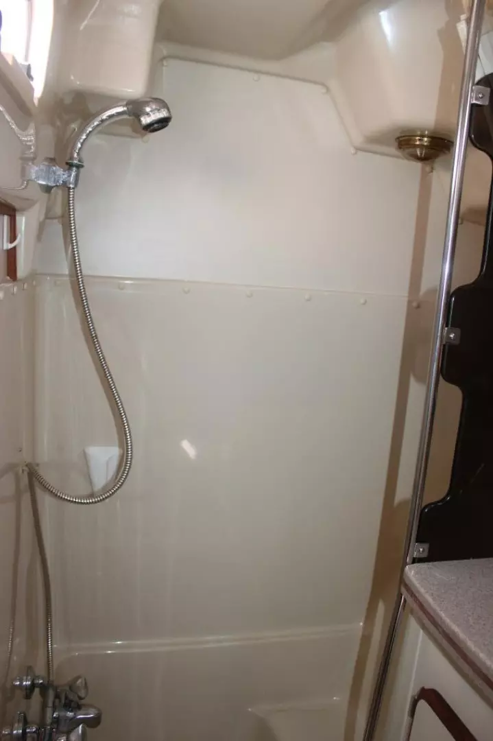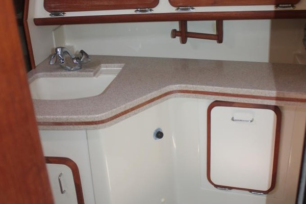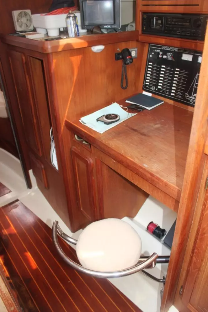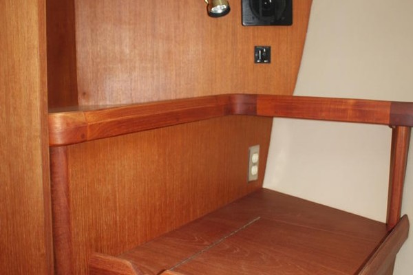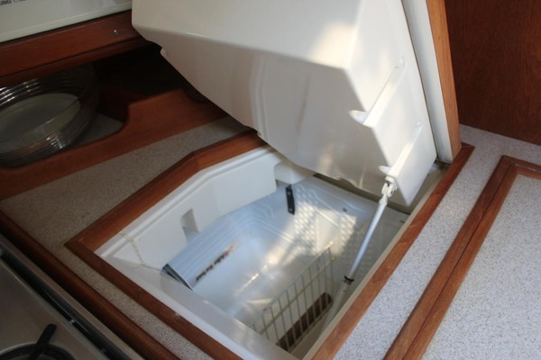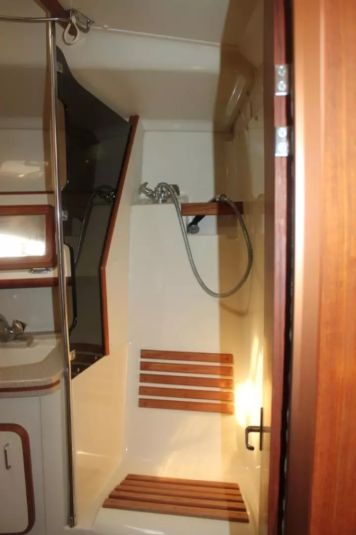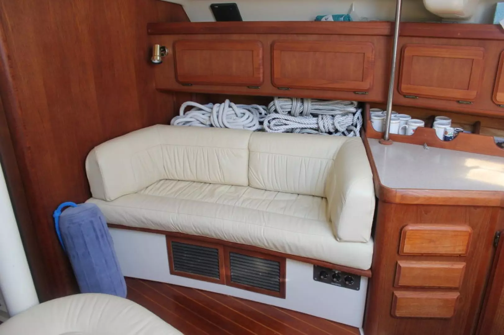 The main cabin is large with 6'6" headroom. There is a U-Shaped dinette to port with an oval dining table which collapses to form an extra double berth. A settee is to starboard. All cushions are in excellent condition. There are many cabinets and lockers for storage throughout the entire boat. Forward double berth with ample storage space and private door leading to forward head/shower. There is a seat with vanity table as well. The master stateroom with its centerline queen walk around bunk, a curved settee, private bath and full shower and tub, wide hanging locker and lots of drawers. The galley is very well laid out with Corian countertops, 3-burner stove, microwave, double stainless steel sink, refrigerator and separate freezer, many drawers and cabinets.