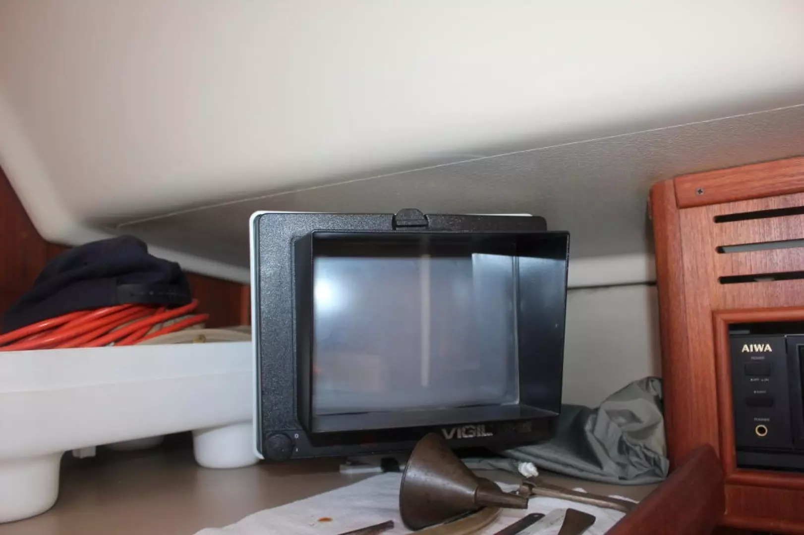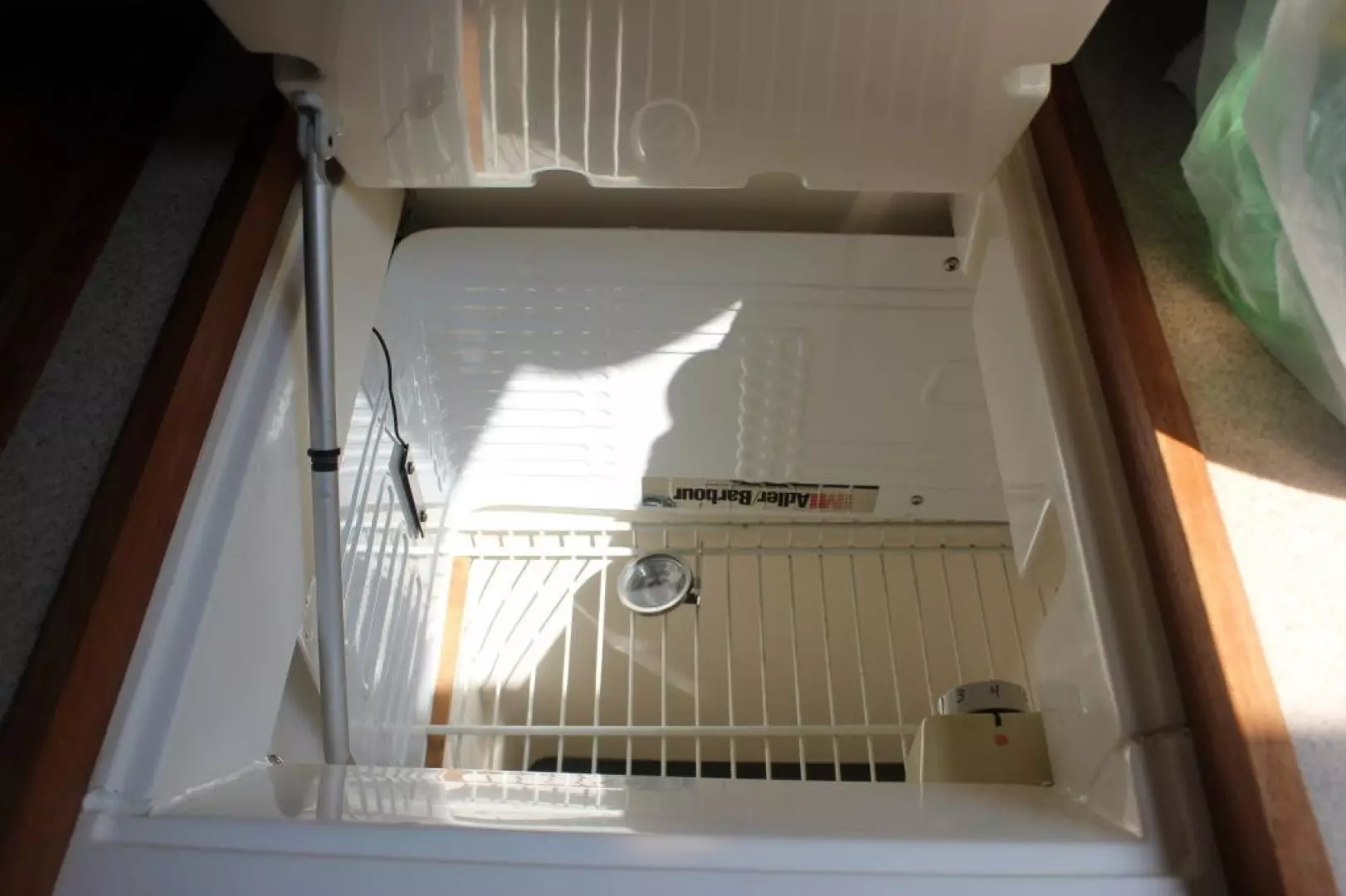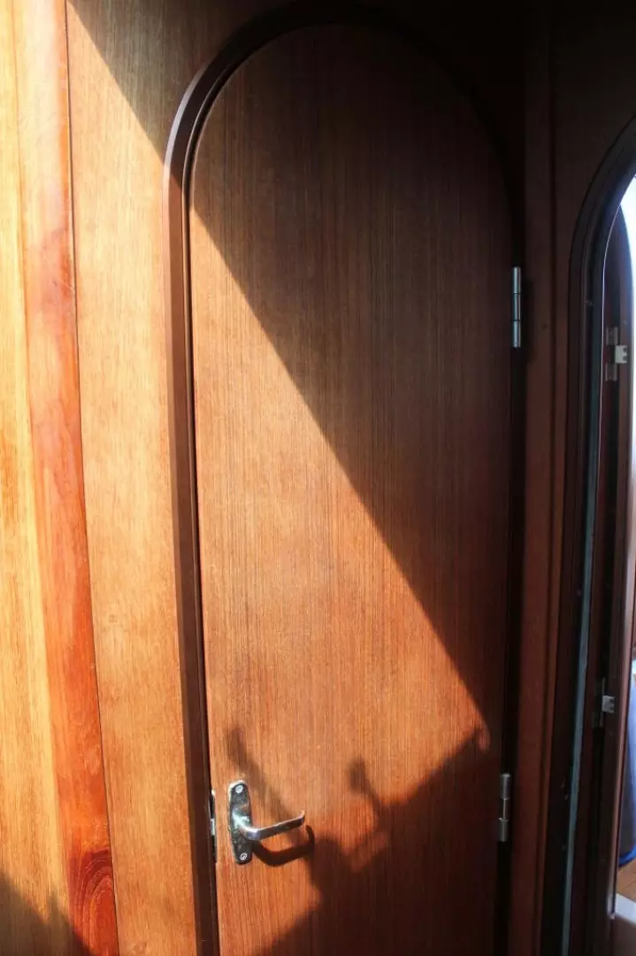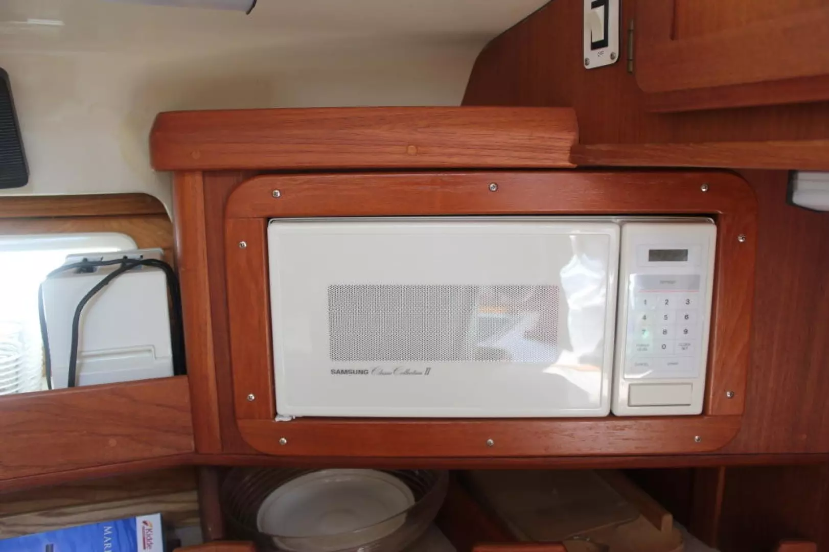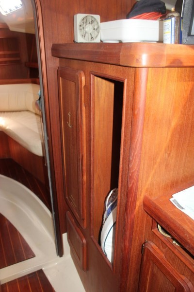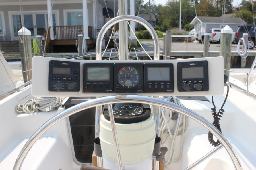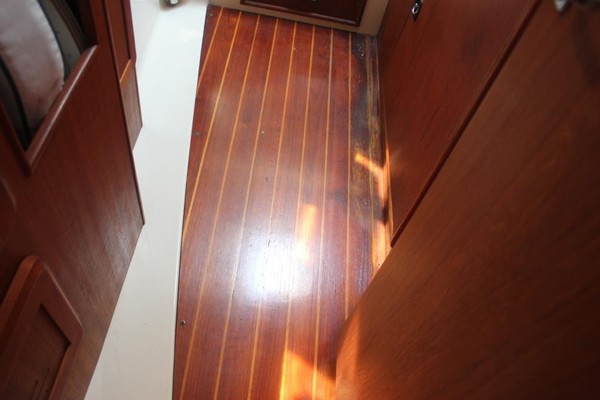 The main cabin is large with 6'6" headroom. There is a U-Shaped dinette to port with an oval dining table which collapses to form an extra double berth. A settee is to starboard. All cushions are in excellent condition. There are many cabinets and lockers for storage throughout the entire boat. Forward double berth with ample storage space and private door leading to forward head/shower. There is a seat with vanity table as well. The master stateroom with its centerline queen walk around bunk, a curved settee, private bath and full shower and tub, wide hanging locker and lots of drawers. The galley is very well laid out with Corian countertops, 3-burner stove, microwave, double stainless steel sink, refrigerator and separate freezer, many drawers and cabinets.