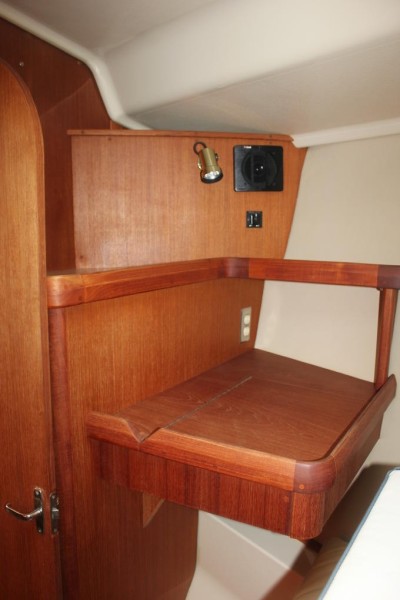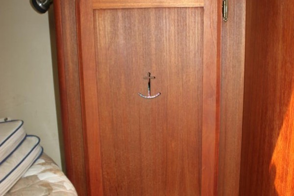 Queen berth, vanity and generous storage spaces in hanging locker and drawers.