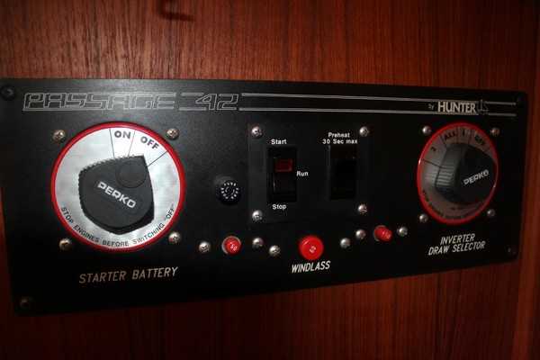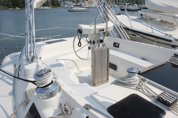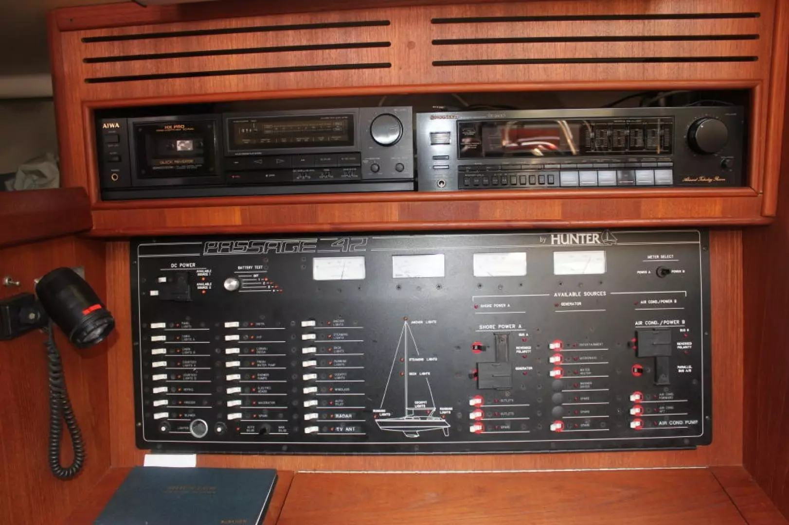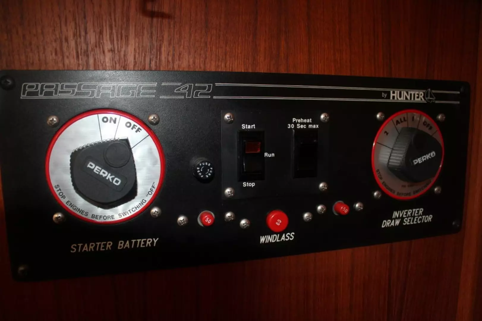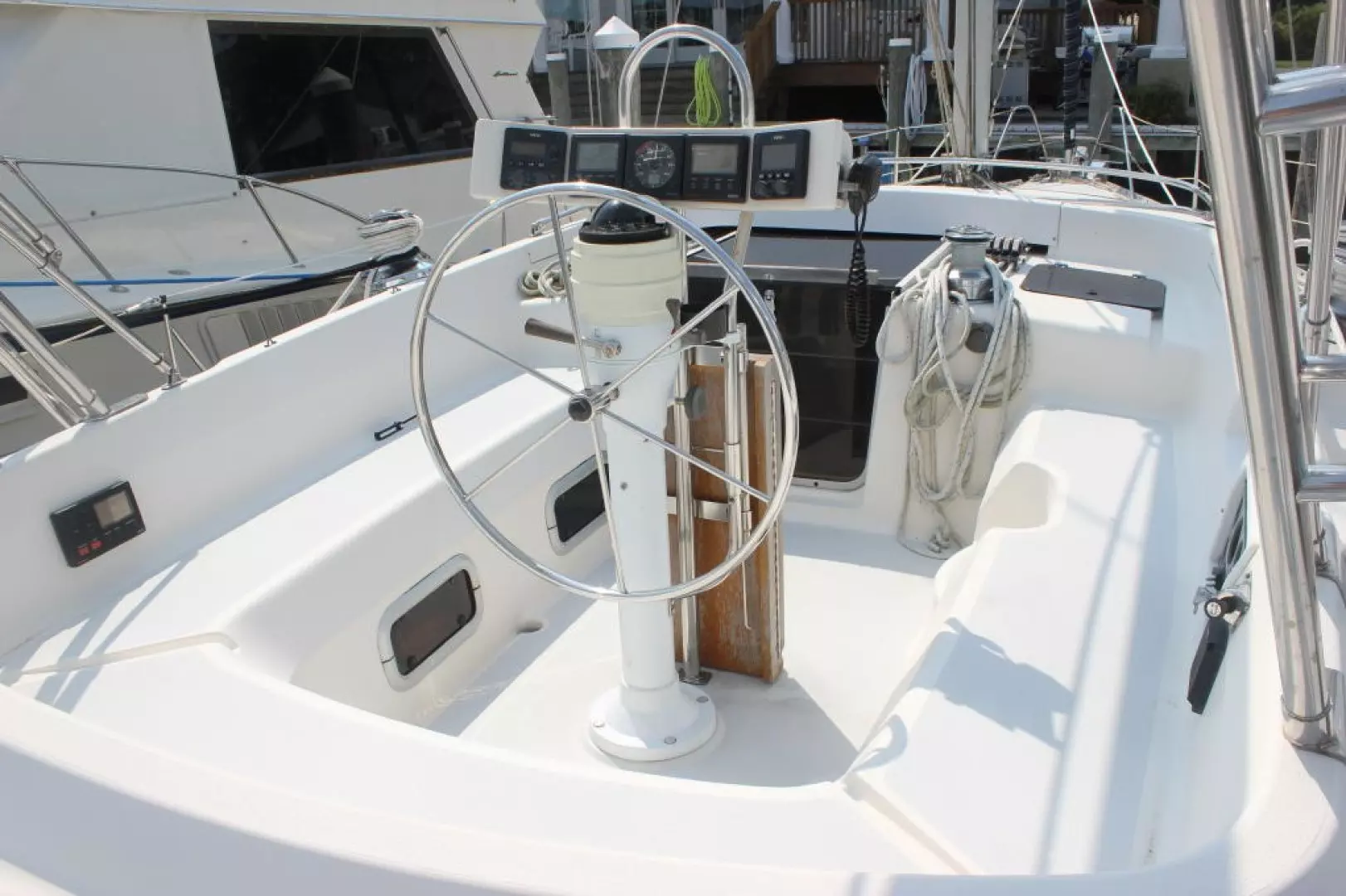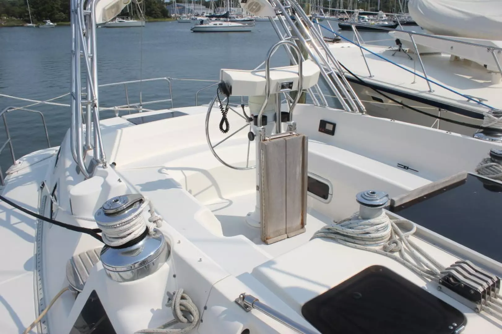 Paranon is a very roomy and comfortable center cockpit and feels like a much larger boat. Interior volume and enhanced accommodations are the idea behind the Passage 42 and Hunter makes full use of the center-cockpit theme by keeping the deck elevated from the mast all the way aft to provide up to 6'6" headroom below; with 14 feet of beam, the plan is opened up even further. Included are a double stateroom in the bow with its own head and shower, and another one - the master suite - in the stern quarters with a private head and shower. The main saloon is comprised of a large oval settee and a U-shaped galley on the starboard side that features refrigeration, hot and cold pressure water and a microwave oven. In lieu of ports is a large, "wraparound" windshield. In the passageway between the main and after cabins is the navigation station. The deck consists of a large center cockpit and a spacious upholstered "sun lounge" over the after cabin. Spanning the cockpit is a stainless steel structural arch that supports the traveler just over the helmsman's head. Sail controls and primary winches are within easy reach.