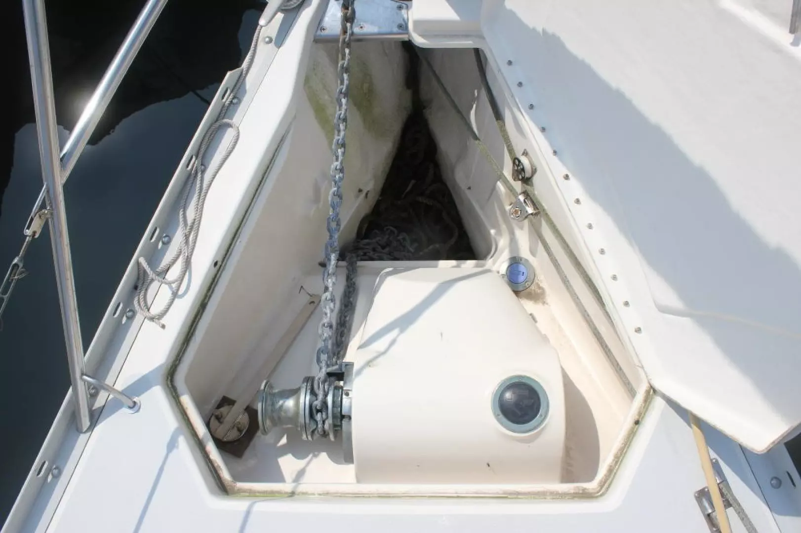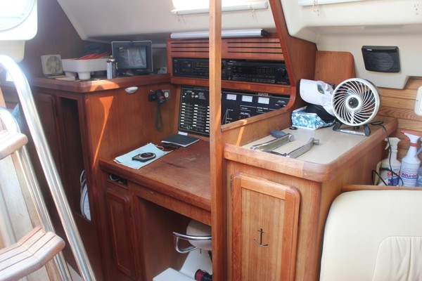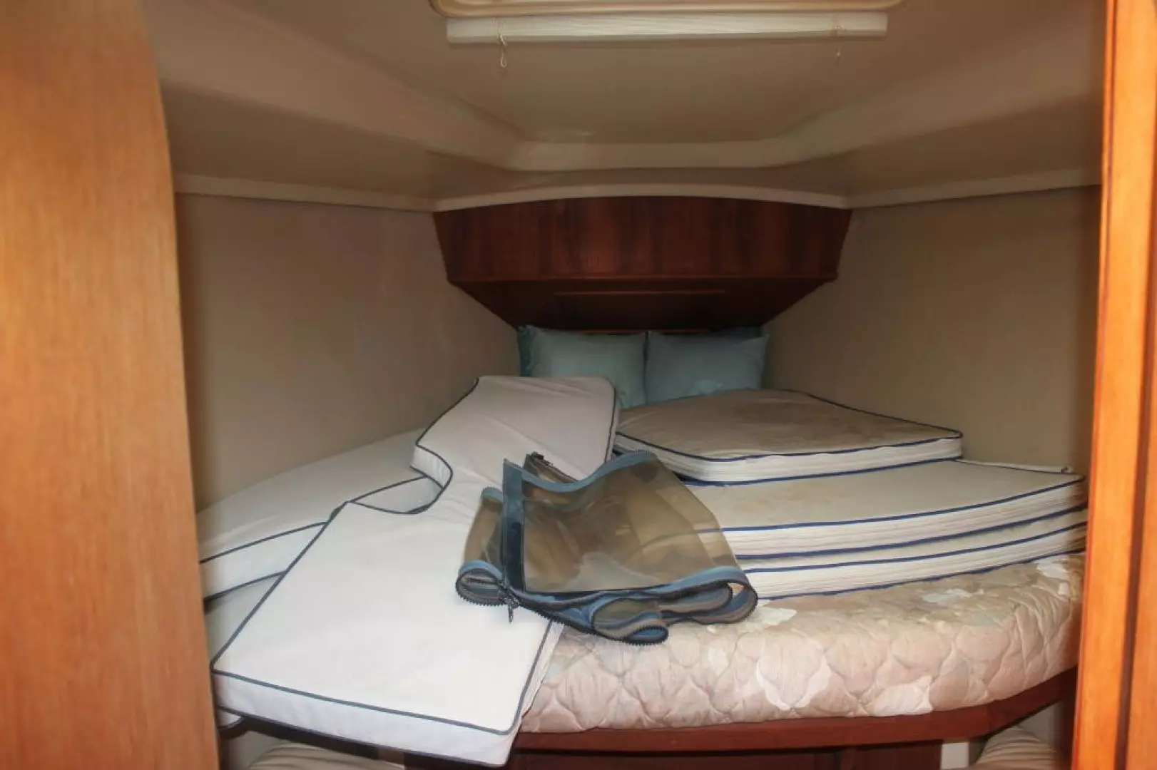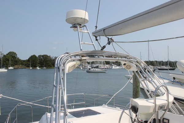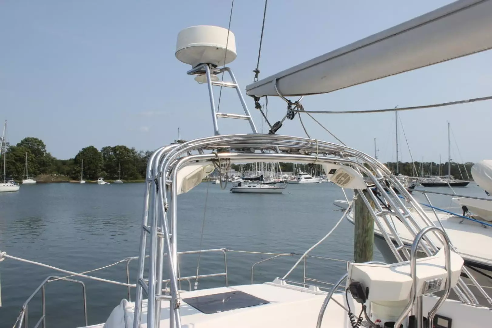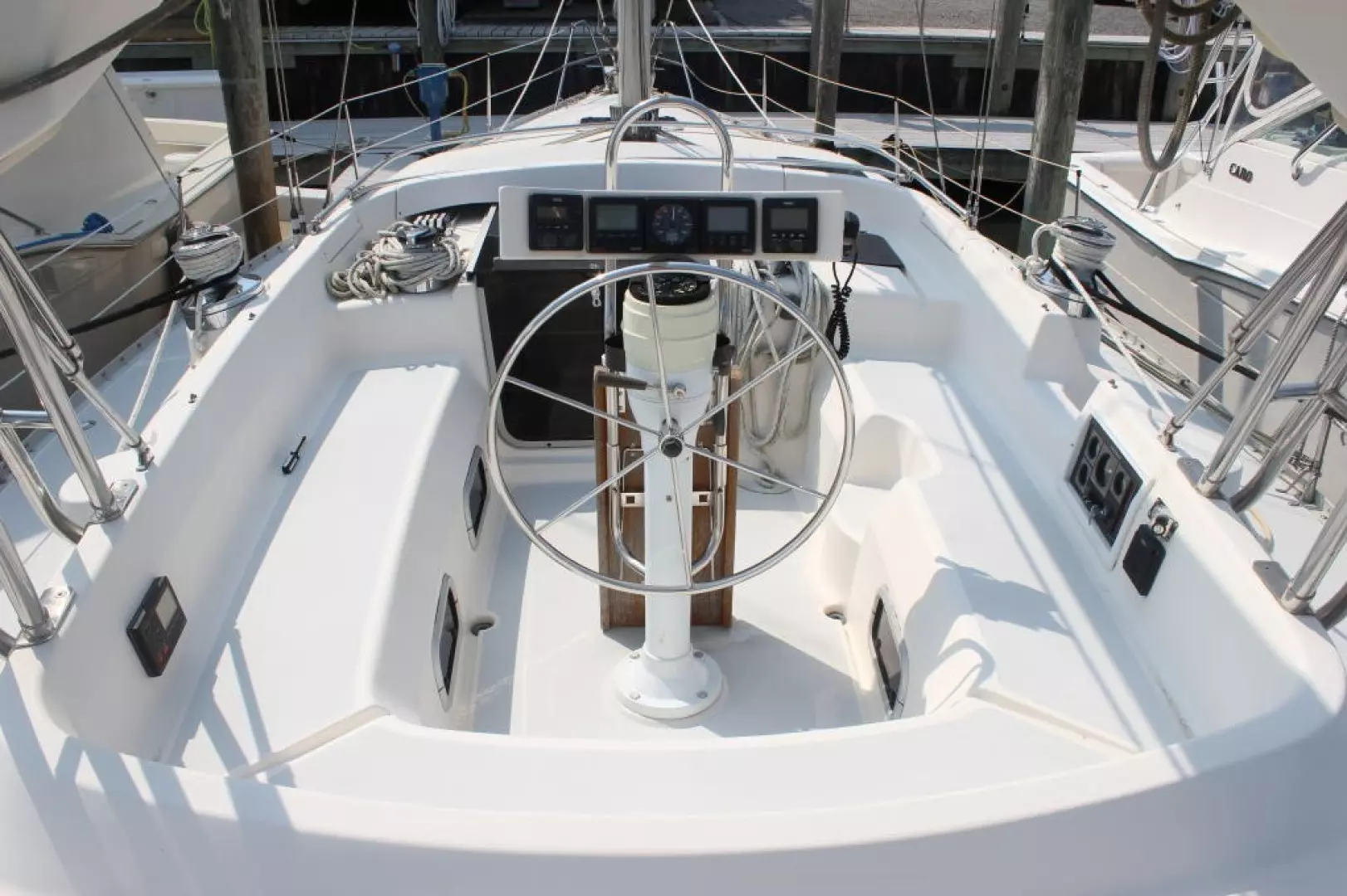 Paranon is a very roomy and comfortable center cockpit and feels like a much larger boat. Interior volume and enhanced accommodations are the idea behind the Passage 42 and Hunter makes full use of the center-cockpit theme by keeping the deck elevated from the mast all the way aft to provide up to 6'6" headroom below; with 14 feet of beam, the plan is opened up even further. Included are a double stateroom in the bow with its own head and shower, and another one - the master suite - in the stern quarters with a private head and shower. The main saloon is comprised of a large oval settee and a U-shaped galley on the starboard side that features refrigeration, hot and cold pressure water and a microwave oven. In lieu of ports is a large, "wraparound" windshield. In the passageway between the main and after cabins is the navigation station. The deck consists of a large center cockpit and a spacious upholstered "sun lounge" over the after cabin. Spanning the cockpit is a stainless steel structural arch that supports the traveler just over the helmsman's head. Sail controls and primary winches are within easy reach.