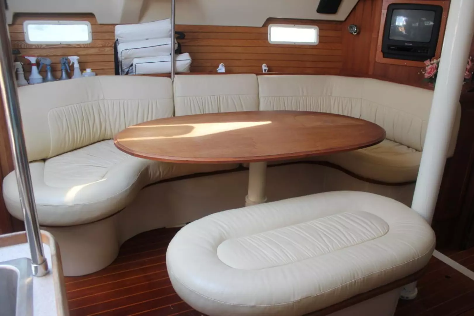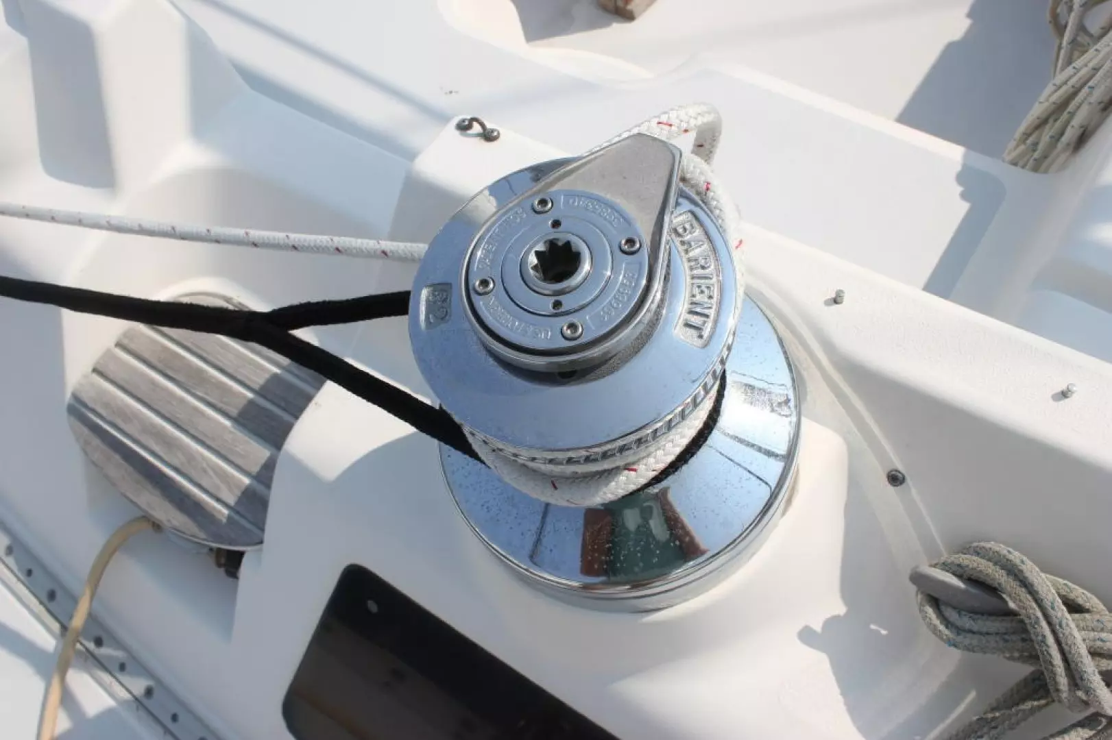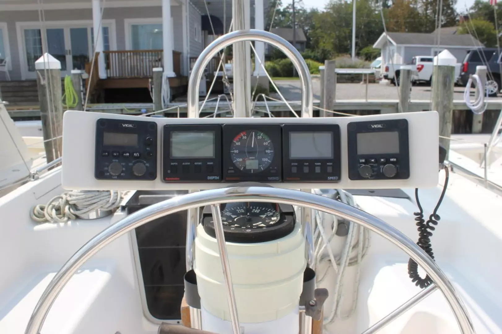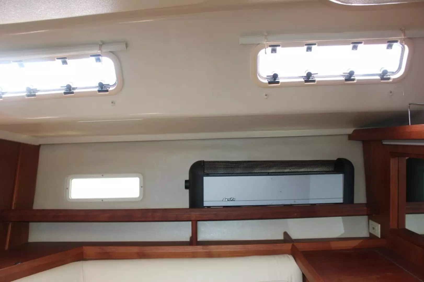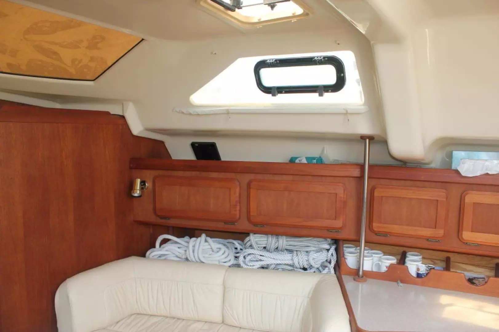 Paranon is a very roomy and comfortable center cockpit and feels like a much larger boat. Interior volume and enhanced accommodations are the idea behind the Passage 42 and Hunter makes full use of the center-cockpit theme by keeping the deck elevated from the mast all the way aft to provide up to 6'6" headroom below; with 14 feet of beam, the plan is opened up even further. Included are a double stateroom in the bow with its own head and shower, and another one - the master suite - in the stern quarters with a private head and shower. The main saloon is comprised of a large oval settee and a U-shaped galley on the starboard side that features refrigeration, hot and cold pressure water and a microwave oven. In lieu of ports is a large, "wraparound" windshield. In the passageway between the main and after cabins is the navigation station. The deck consists of a large center cockpit and a spacious upholstered "sun lounge" over the after cabin. Spanning the cockpit is a stainless steel structural arch that supports the traveler just over the helmsman's head. Sail controls and primary winches are within easy reach.