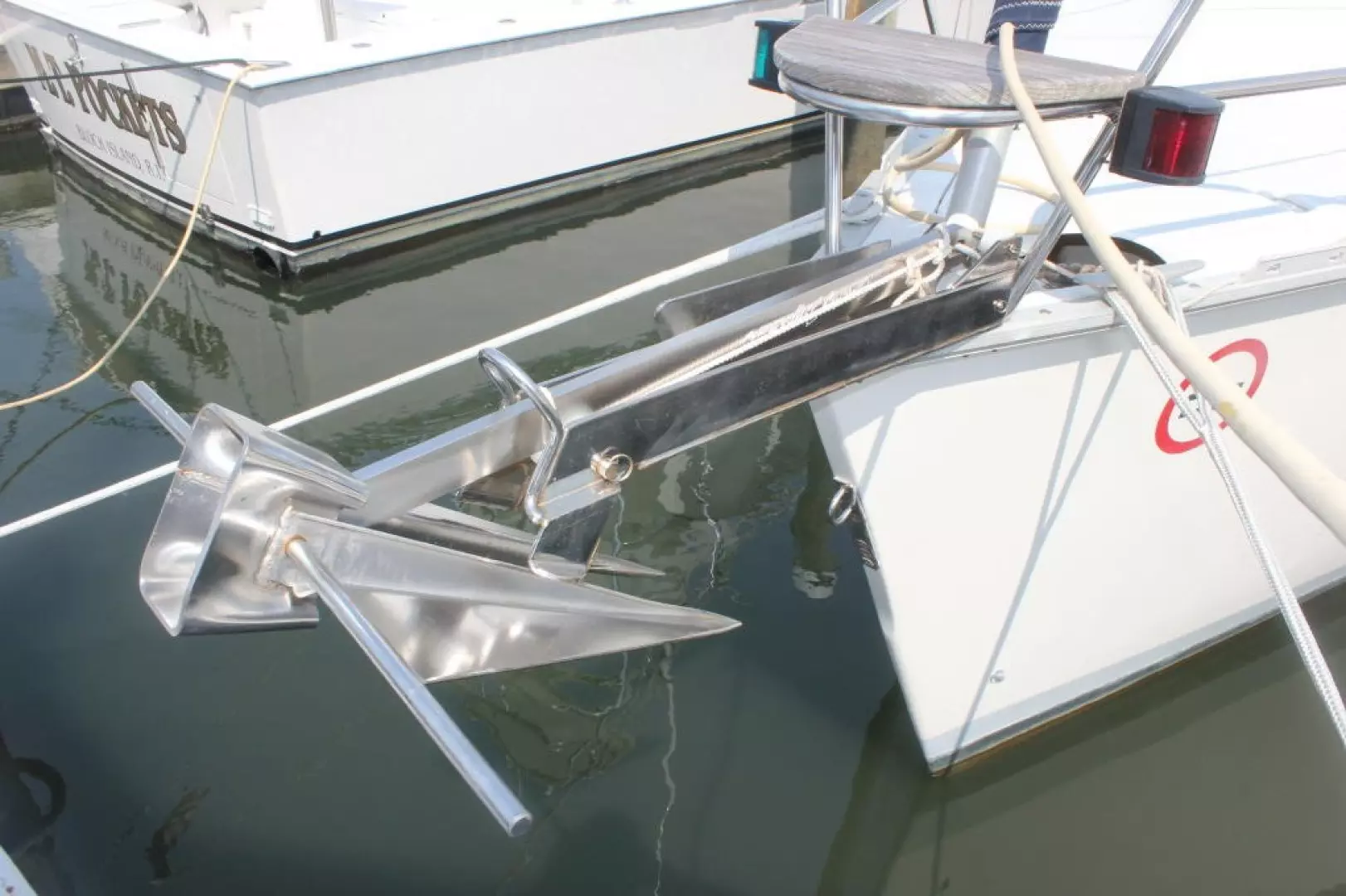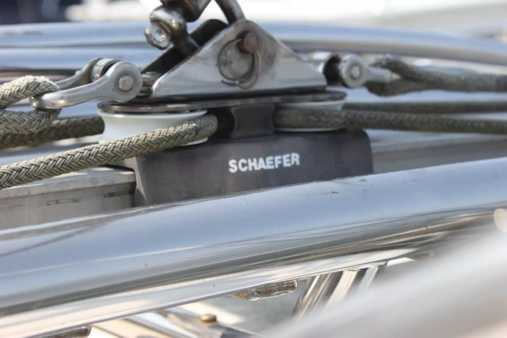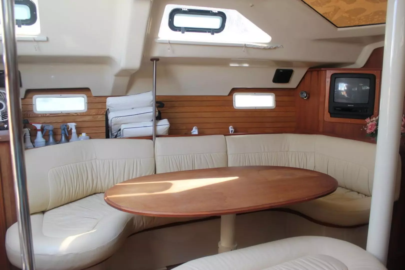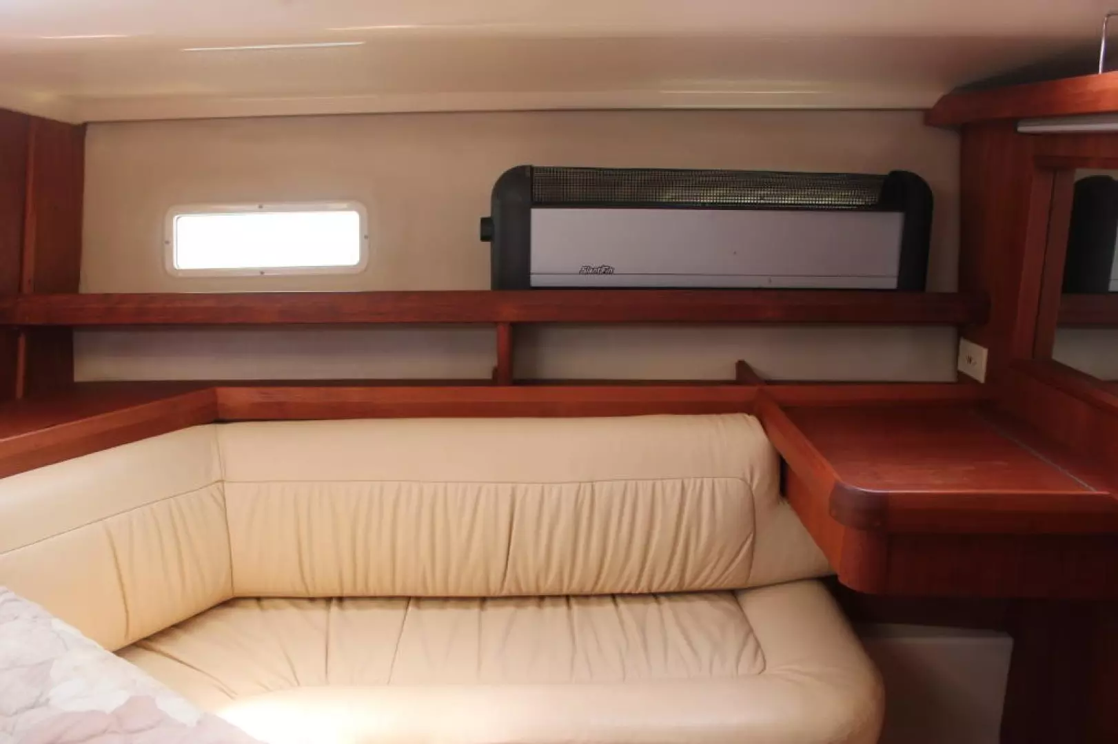 Paranon is a very roomy and comfortable center cockpit and feels like a much larger boat. Interior volume and enhanced accommodations are the idea behind the Passage 42 and Hunter makes full use of the center-cockpit theme by keeping the deck elevated from the mast all the way aft to provide up to 6'6" headroom below; with 14 feet of beam, the plan is opened up even further. Included are a double stateroom in the bow with its own head and shower, and another one - the master suite - in the stern quarters with a private head and shower. The main saloon is comprised of a large oval settee and a U-shaped galley on the starboard side that features refrigeration, hot and cold pressure water and a microwave oven. In lieu of ports is a large, "wraparound" windshield. In the passageway between the main and after cabins is the navigation station. The deck consists of a large center cockpit and a spacious upholstered "sun lounge" over the after cabin. Spanning the cockpit is a stainless steel structural arch that supports the traveler just over the helmsman's head. Sail controls and primary winches are within easy reach.