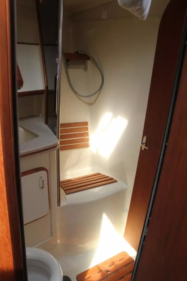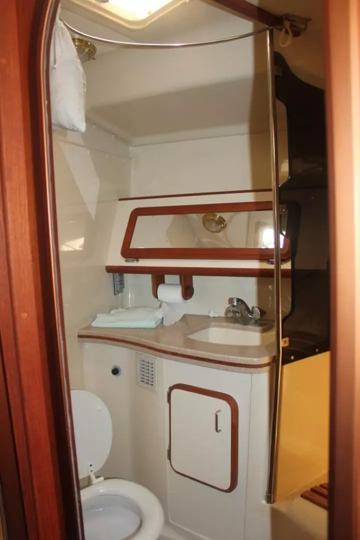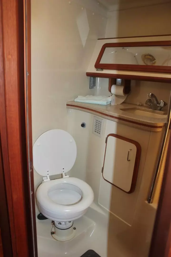 En-Suite head with a separate shower is accessed through the stateroom and also through the main salon through a separate door
