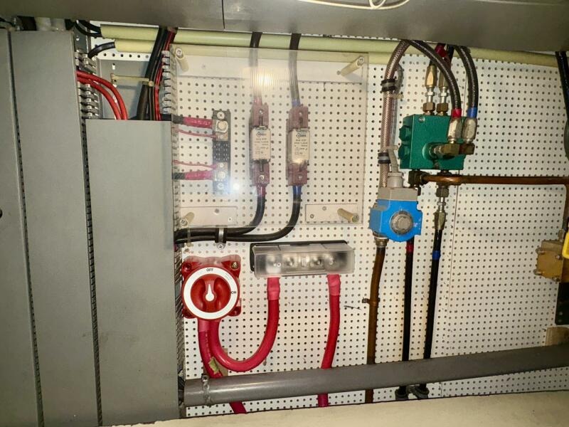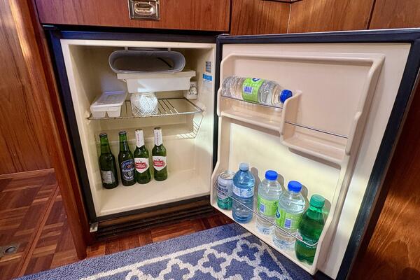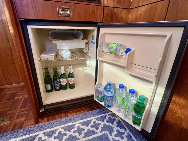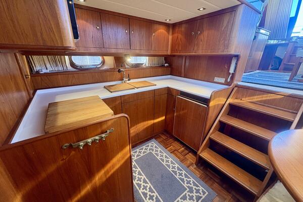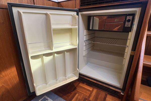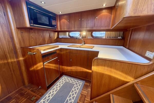 - Spacious, fully equipped galley with microwave/convection oven, twin under counter fridge/freezers and a propane/electric stove. (propane line plumbed to tank storage on the flybridge)