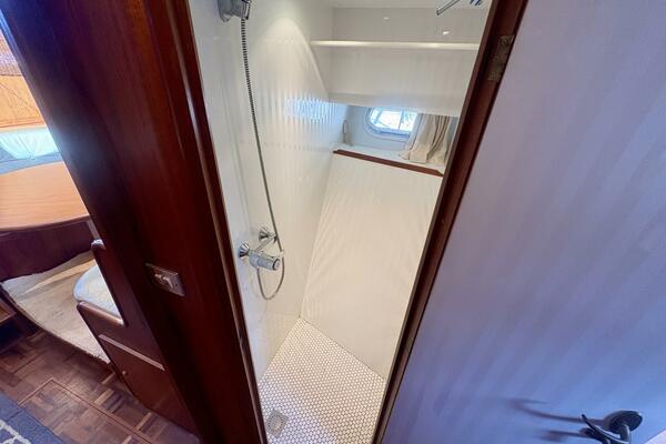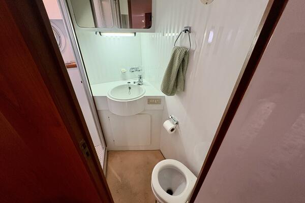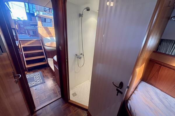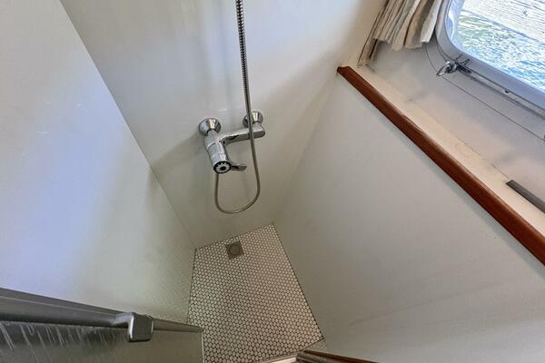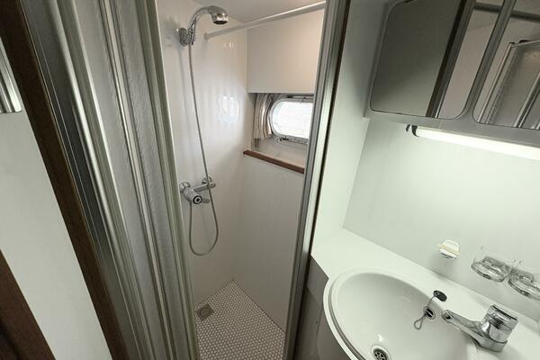 - Forward guest cabin accommodating up to three in two berths, with private ensuite head and separate stall shower.