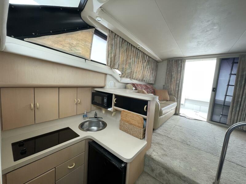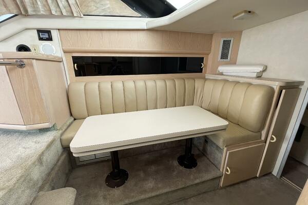 Third in a series of 34-foot convertibles produced by Silverton over the years, the Silverton 34 Convertible is a mid-tier cruiser whose surprisingly affordable price included a long list of standard equipment. Rakish styling distinguishes her from most other convertibles her size, and the Silverton's interior is as practical as it is Spartan. From the cockpit, a sliding glass door opens into the salon with convertible sofa to starboard and entertainment center to port. While the salon dimensions are not especially generous, around windows and light oak cabinets add to the impression of space. The galley with microwave and solid surface counters is forward and down three steps to port. A convertible dinette is opposite the galley, and the forward stateroom has a