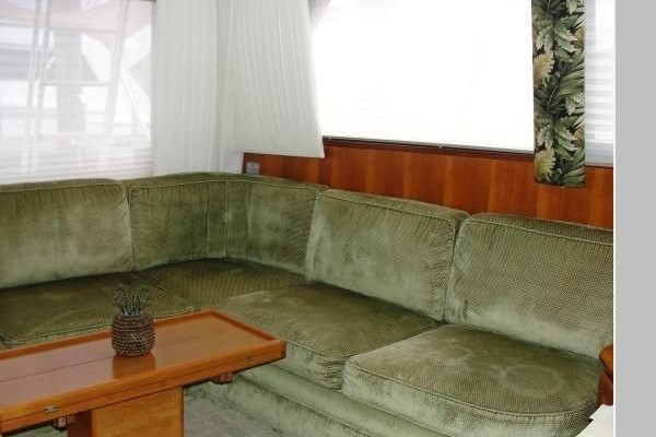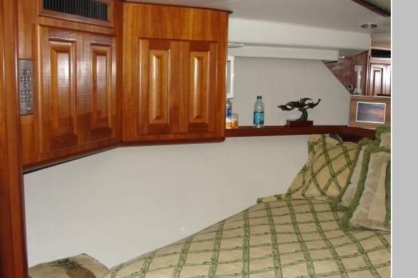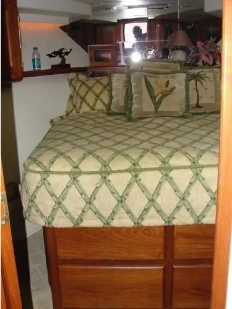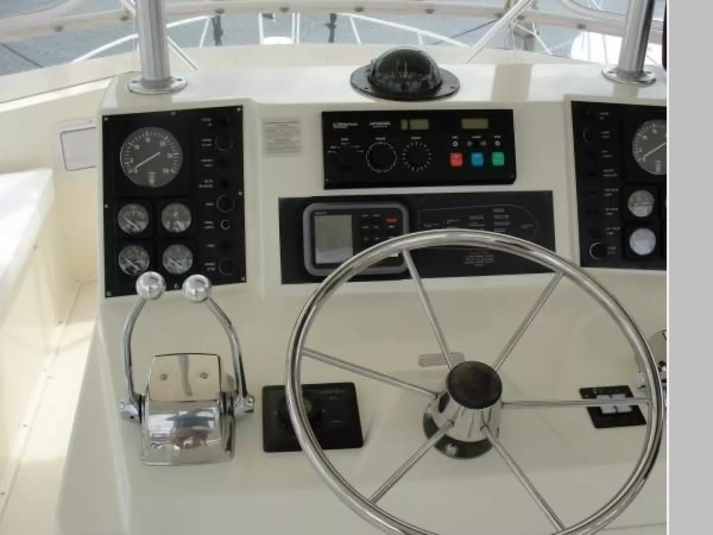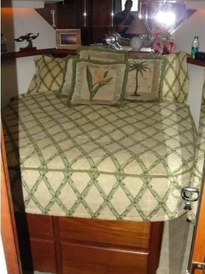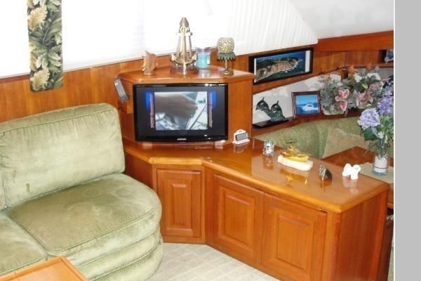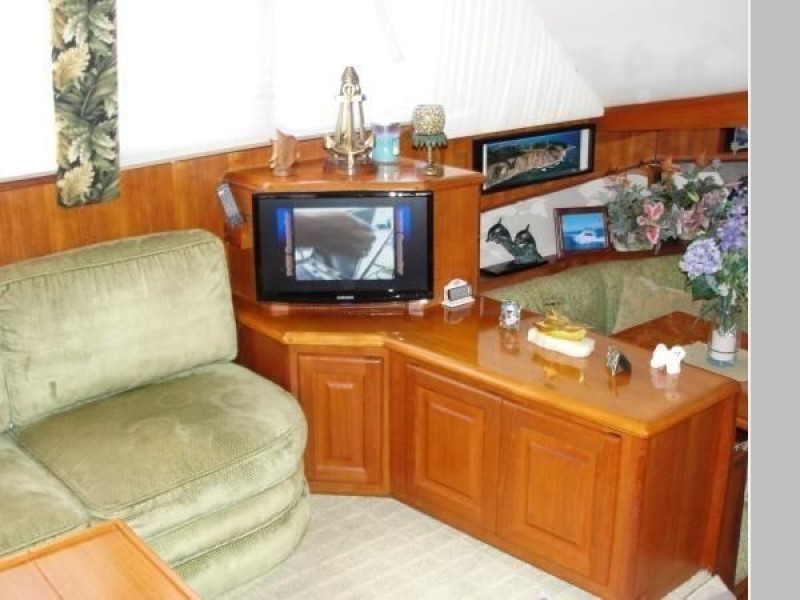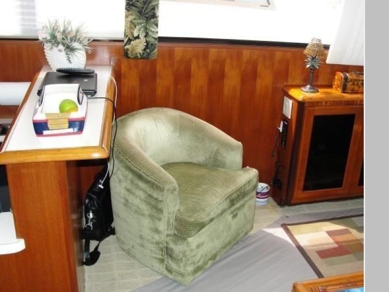 The master stateroom is forward with a centerline queen bed, with cedar lined hanging lockers port and starboard. Drawer storage under the bed with cabinet storage port and starboard and a ventilation hatch with shade and screen. Aft to starboard is the spacious head with vanity mirror and separate stall shower. Aft to port is the dinette area that converts to a bed for two. Aft to starboard is the spacious island galley with ample counter, cabinet and drawer space. Up a step to the salon area with a large L-shaped settee to port and a barrel chair to starboard, wet bar and entertainment center. Up on the flybridge the helm is centered with a port side bench seat and a forward facing bench seat forward of the helm.