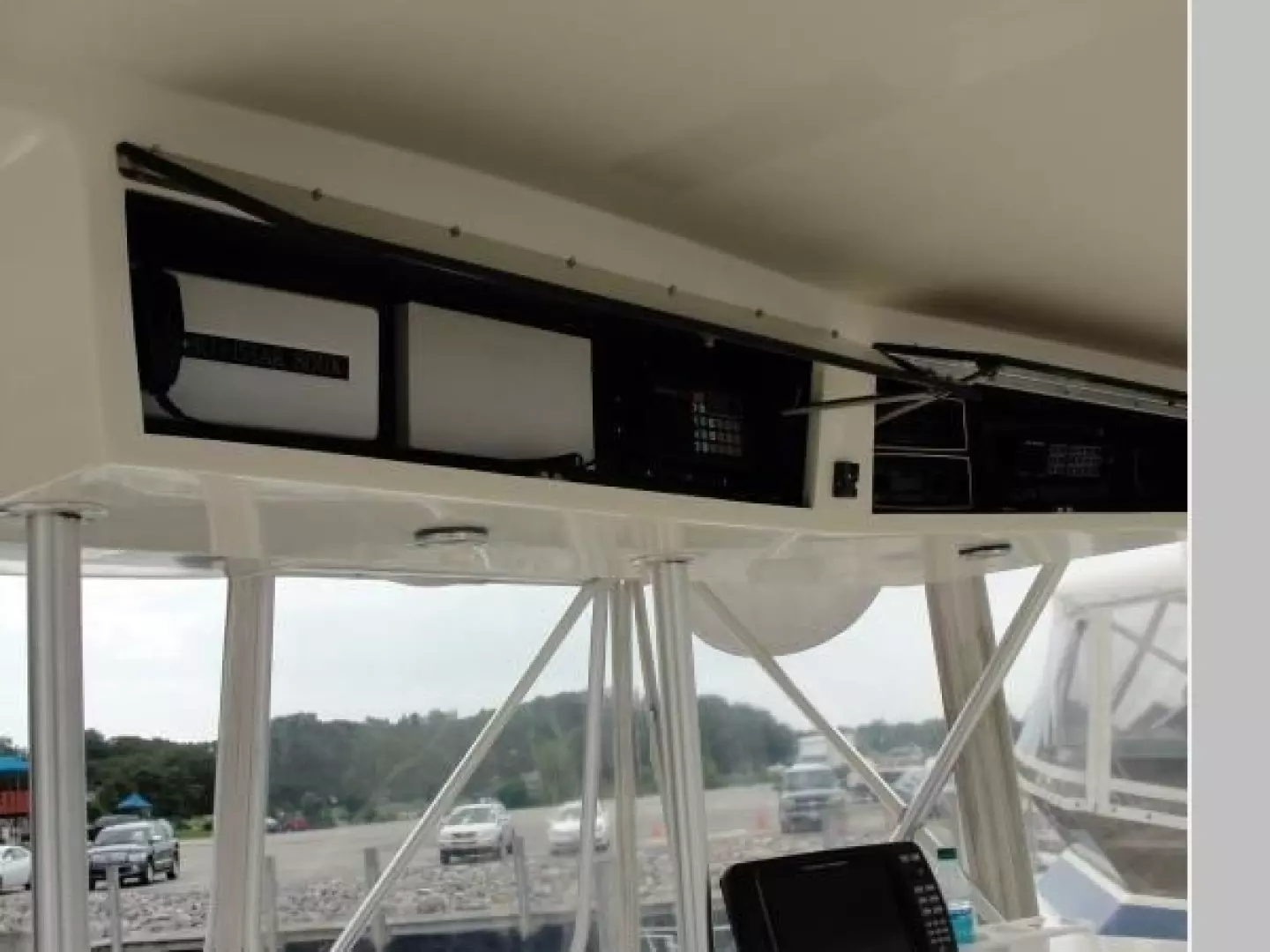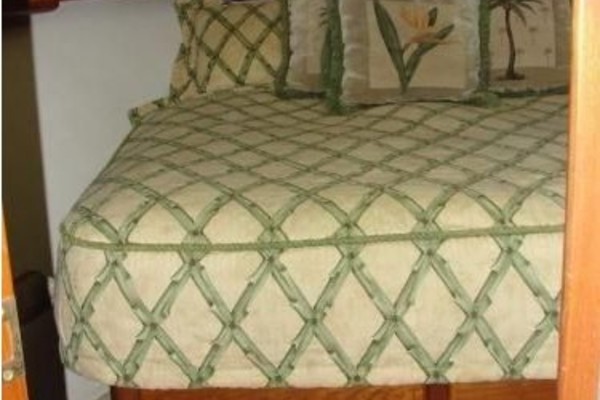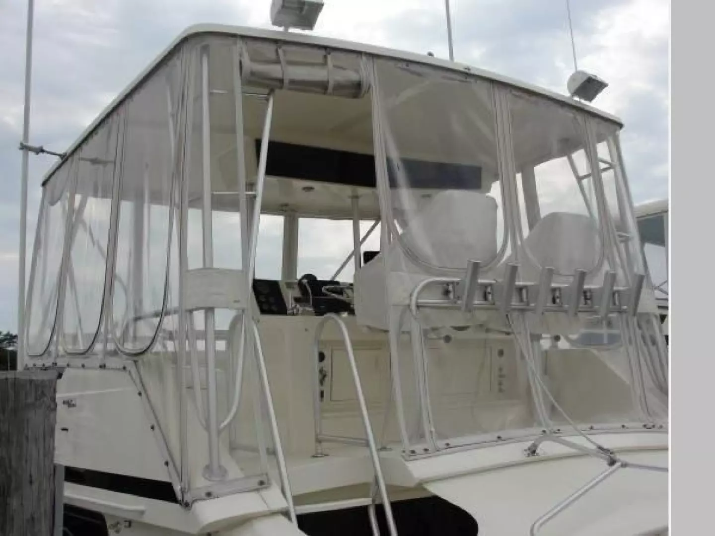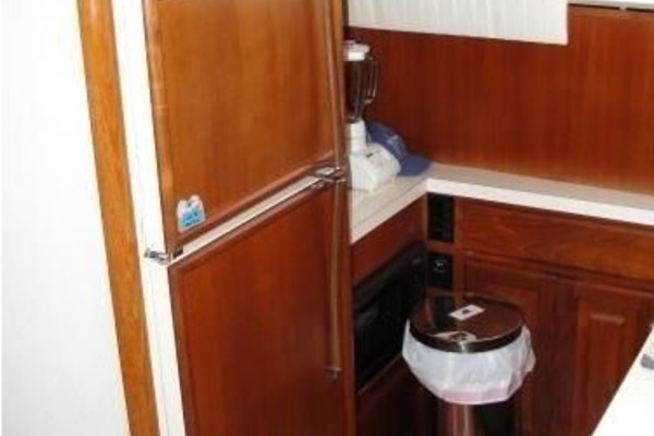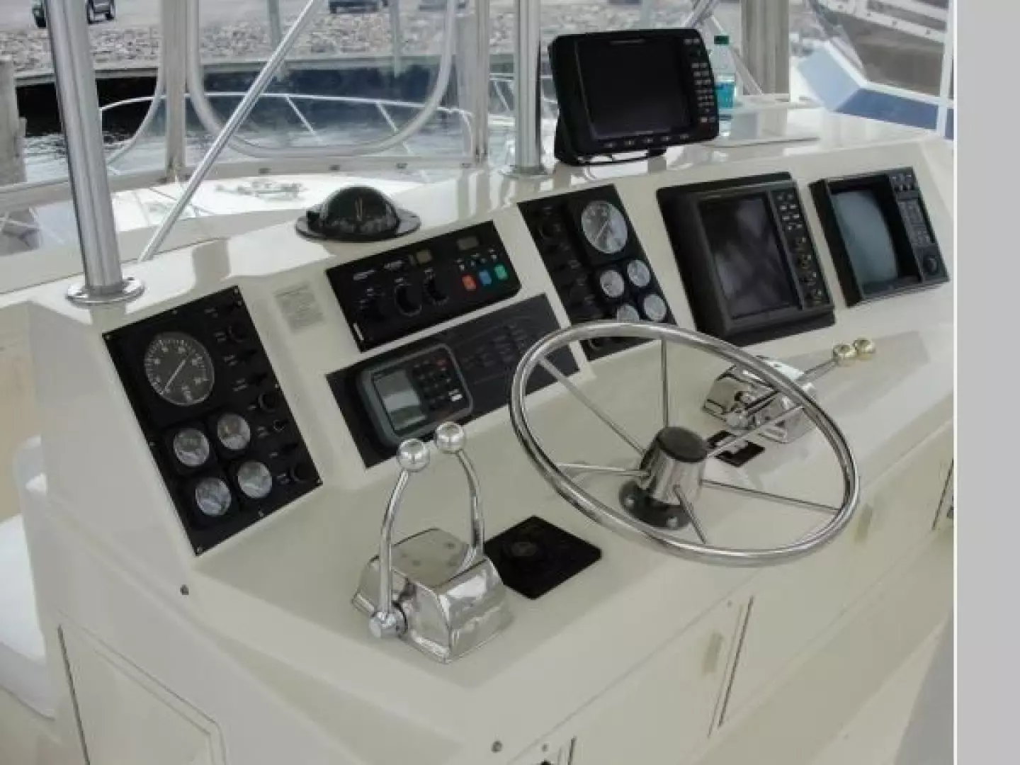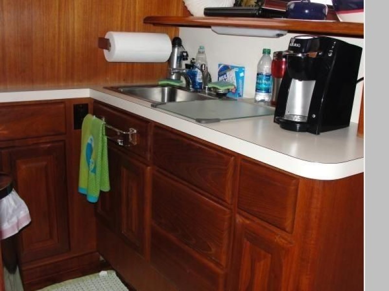 The master stateroom is forward with a centerline queen bed, with cedar lined hanging lockers port and starboard. Drawer storage under the bed with cabinet storage port and starboard and a ventilation hatch with shade and screen. Aft to starboard is the spacious head with vanity mirror and separate stall shower. Aft to port is the dinette area that converts to a bed for two. Aft to starboard is the spacious island galley with ample counter, cabinet and drawer space. Up a step to the salon area with a large L-shaped settee to port and a barrel chair to starboard, wet bar and entertainment center. Up on the flybridge the helm is centered with a port side bench seat and a forward facing bench seat forward of the helm.