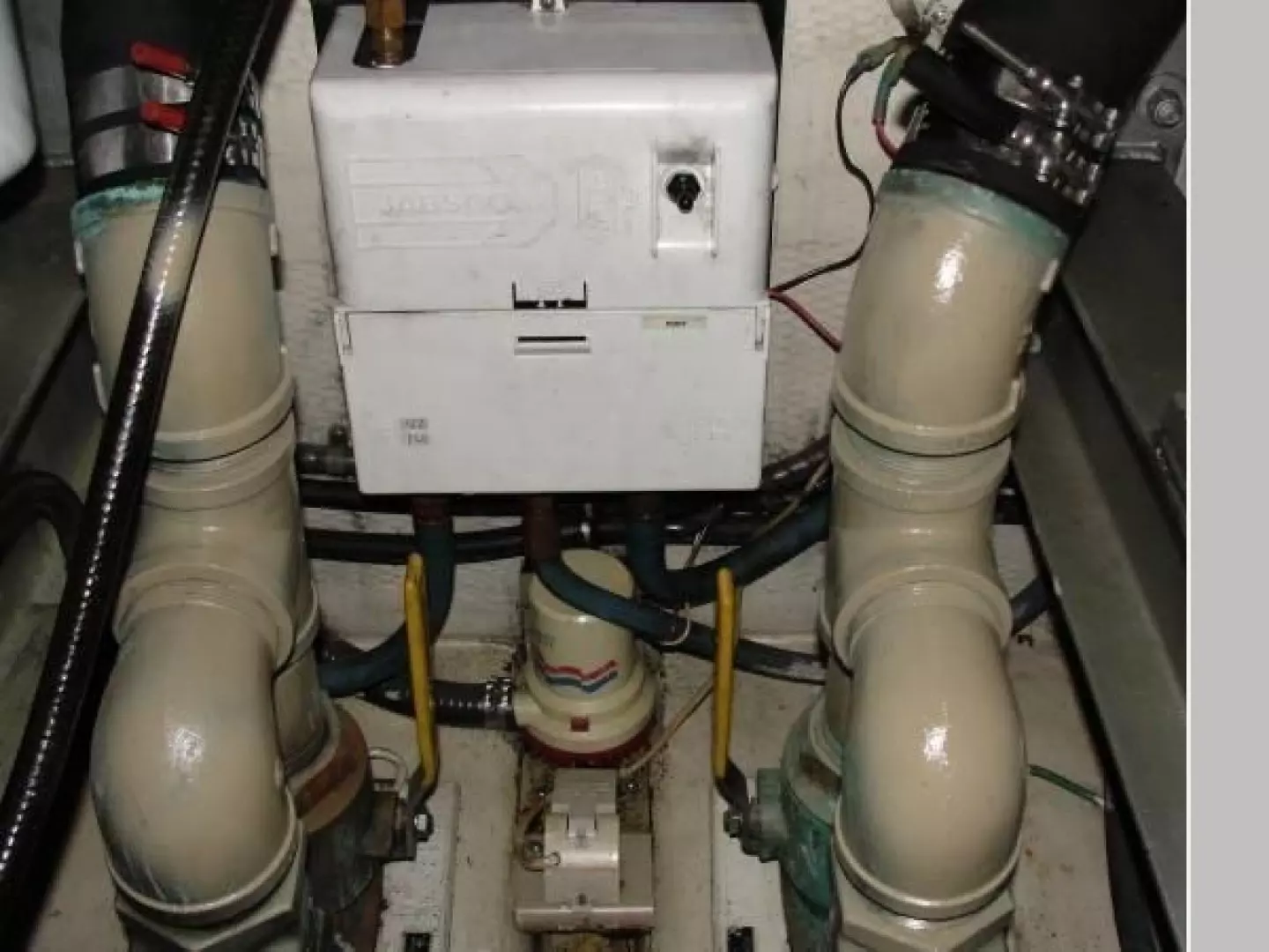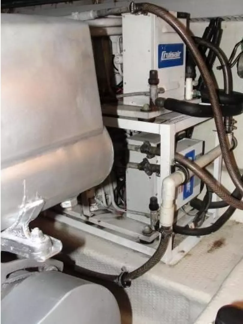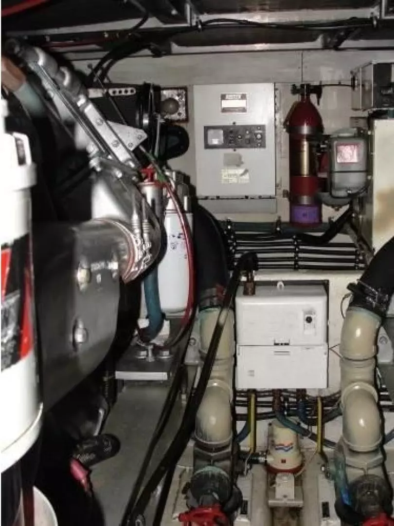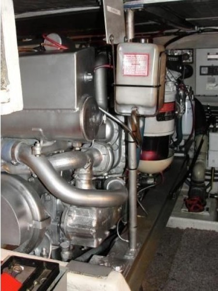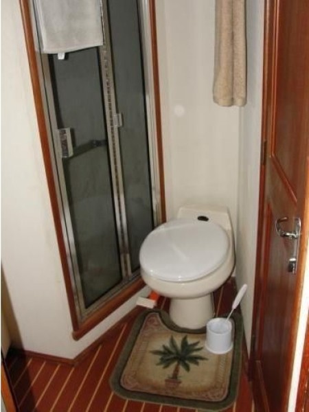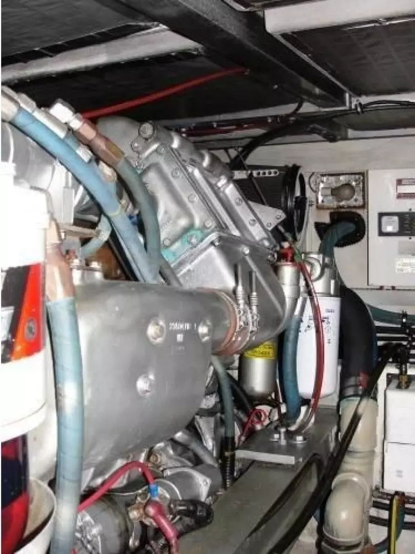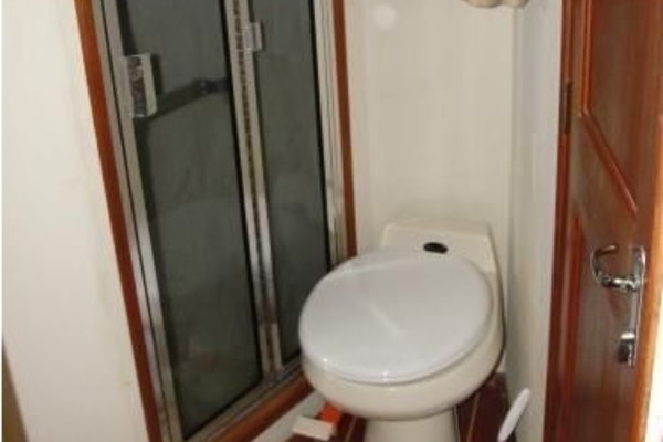 The master stateroom is forward with a centerline queen bed, with cedar lined hanging lockers port and starboard. Drawer storage under the bed with cabinet storage port and starboard and a ventilation hatch with shade and screen. Aft to starboard is the spacious head with vanity mirror and separate stall shower. Aft to port is the dinette area that converts to a bed for two. Aft to starboard is the spacious island galley with ample counter, cabinet and drawer space. Up a step to the salon area with a large L-shaped settee to port and a barrel chair to starboard, wet bar and entertainment center. Up on the flybridge the helm is centered with a port side bench seat and a forward facing bench seat forward of the helm.