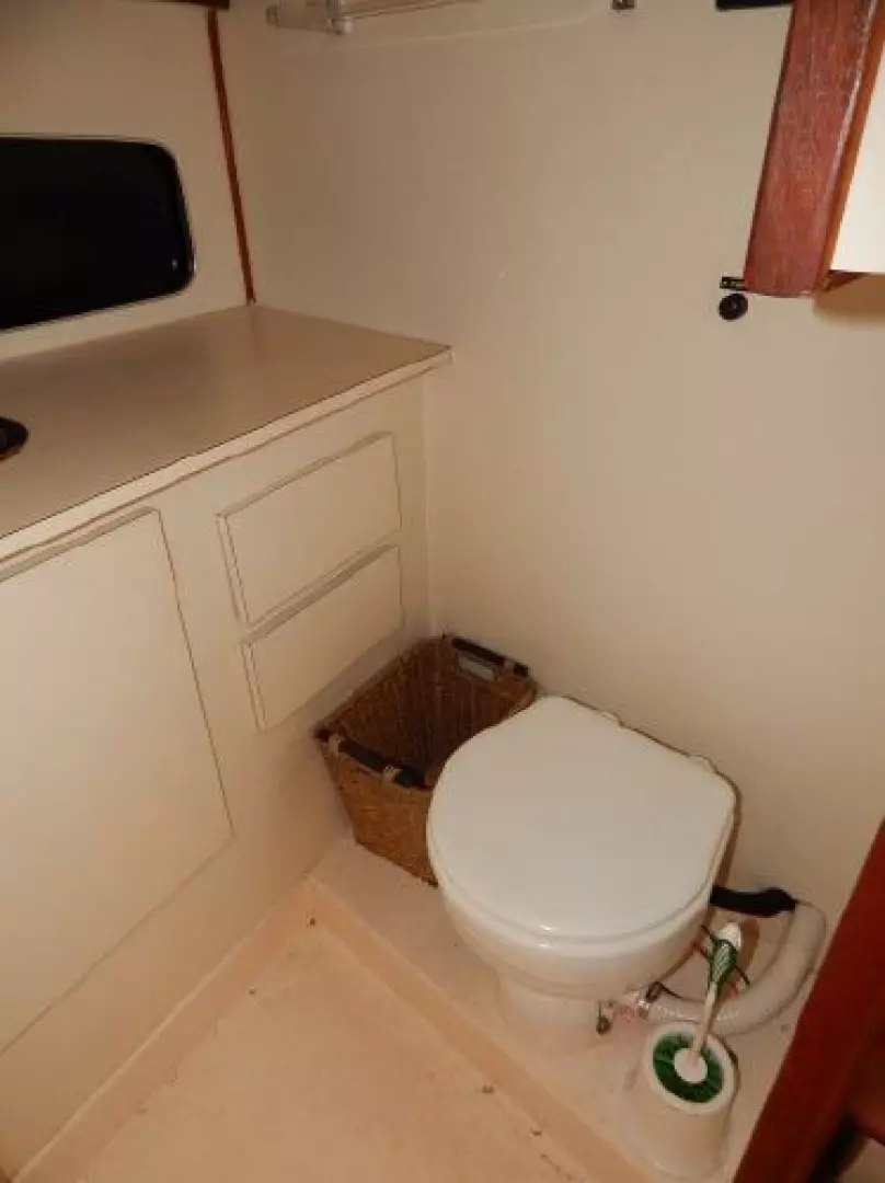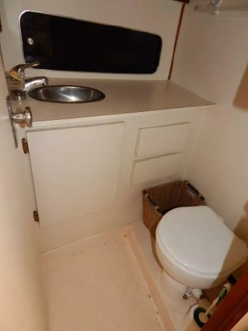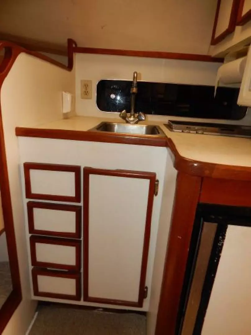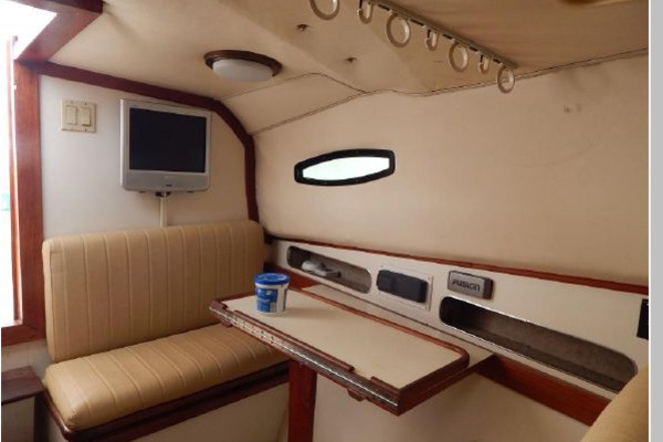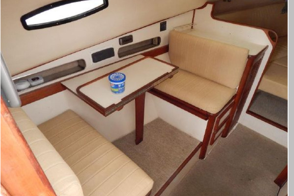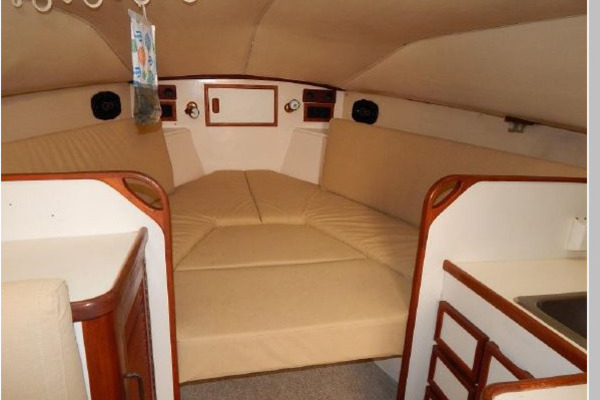 - Starting forward there is a large V-berth, next aft to port is the convertible dinette, to starboard is the galley and furthest aft is the enclosed head.
