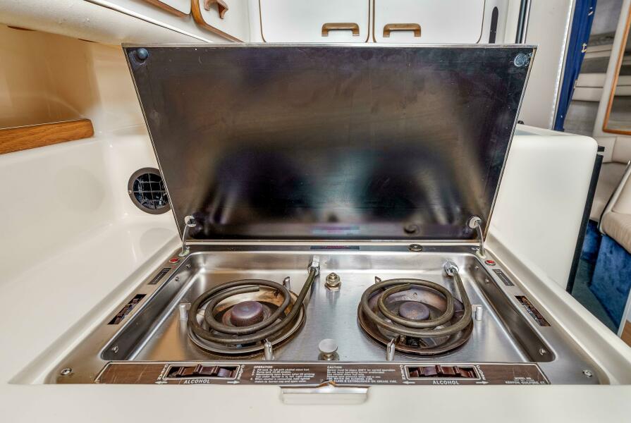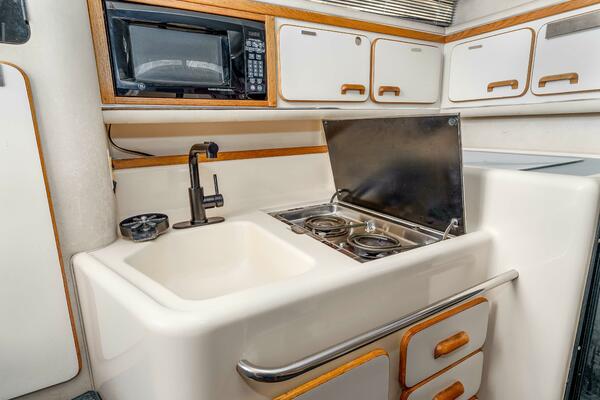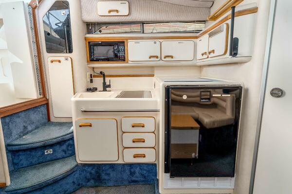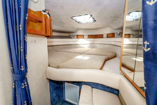 The 1991 Sea Ray 330 DA is a classic early-’90s express cruiser that blends style, comfort, and performance in a compact 33-foot hull. Built with a sturdy fiberglass deep-V hull and an 11′ 5″ beam, it offers surprisingly roomy interior accommodations for its size. Inside, you’ll find a mid-cabin layout (or convertible salon) with sleeping space for six, a fully equipped galley, and private head facilities. The cockpit is laid out for socializing and ease of use—helm seating, aft bench, transom door, and easy engine access. Powered (most often) by twin MerCruiser 5.7 L V-drive or sterndrive engines (totaling around 600 hp), she cruises in the mid-20 knot range and can push toward 30+ knots, depending on load and condition. With tasteful styling and solid fundamentals, this 1991 Sea Ray 330 DA remains a versatile cruiser ideal for weekend getaways, day trips, or coastal cruising.