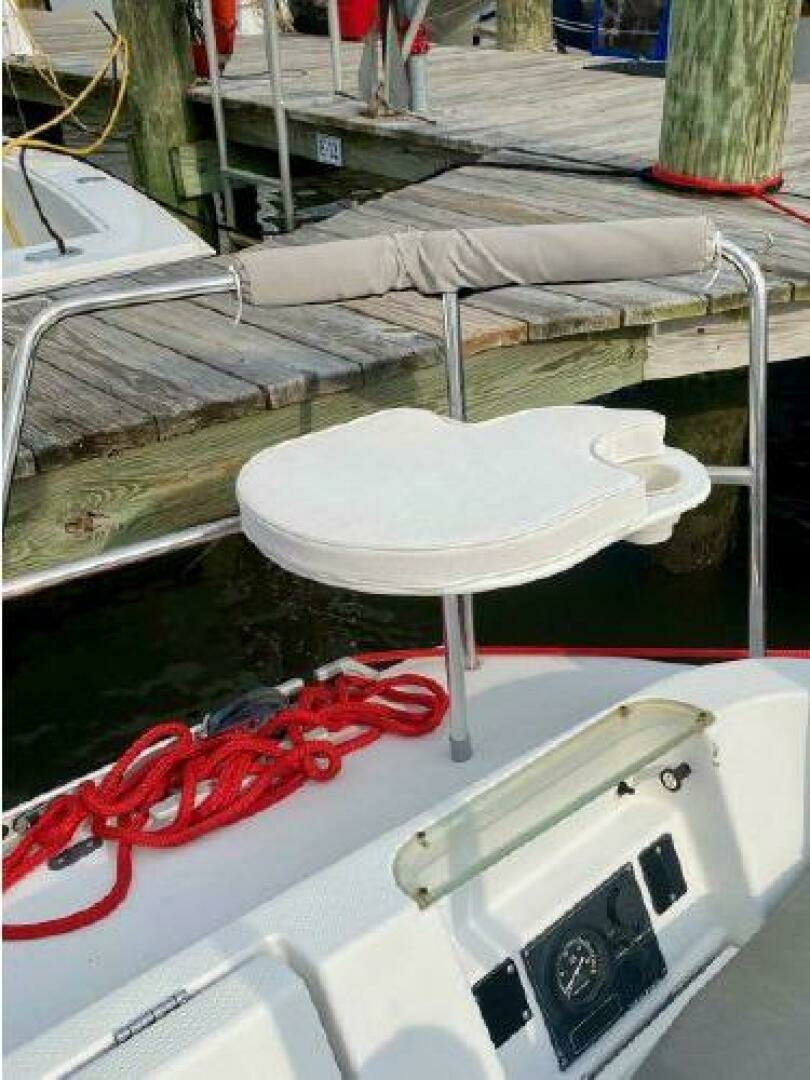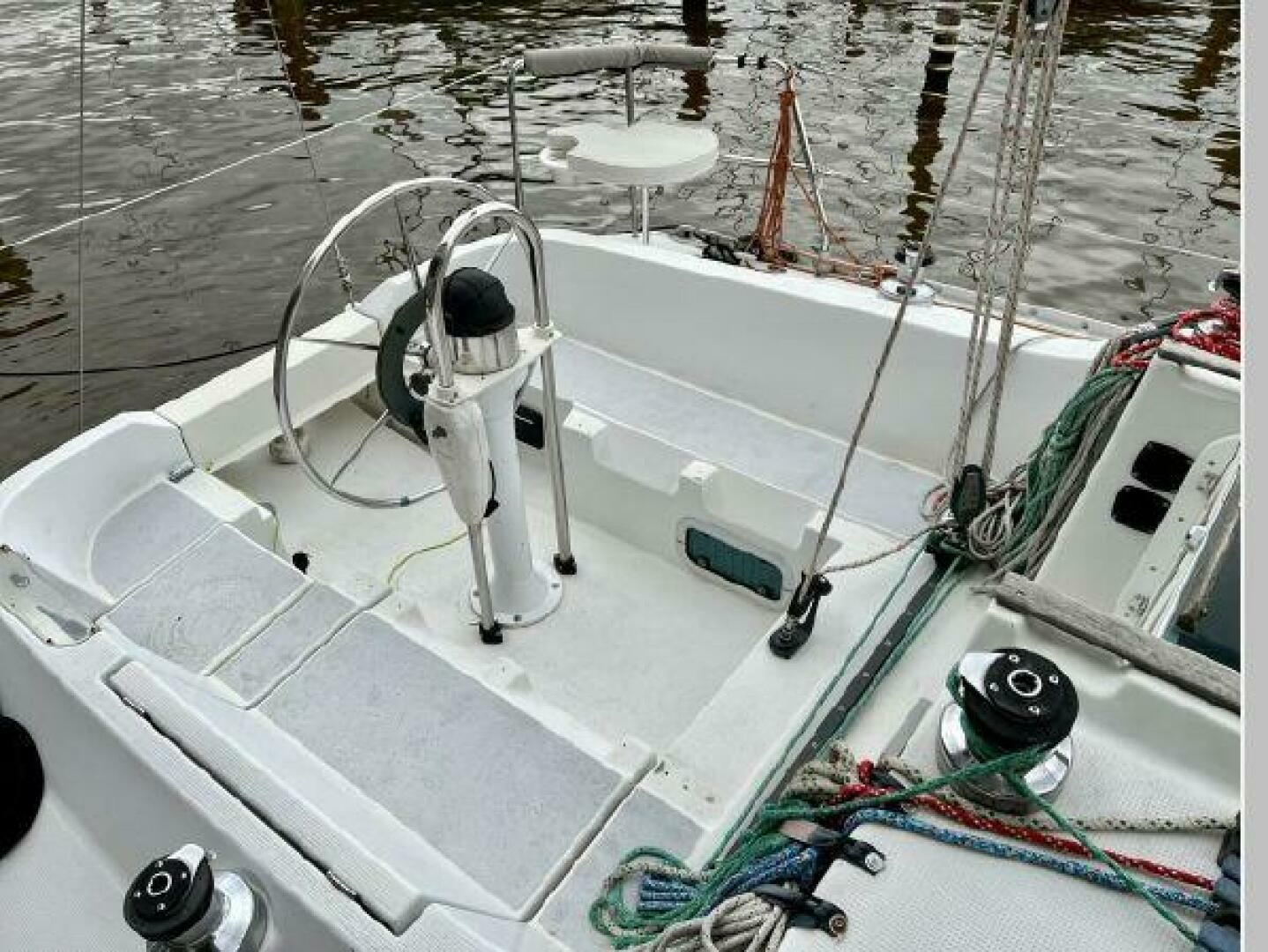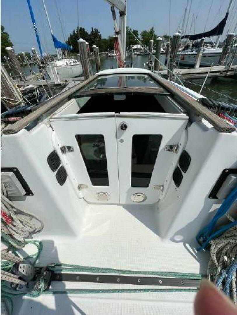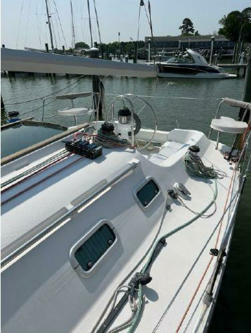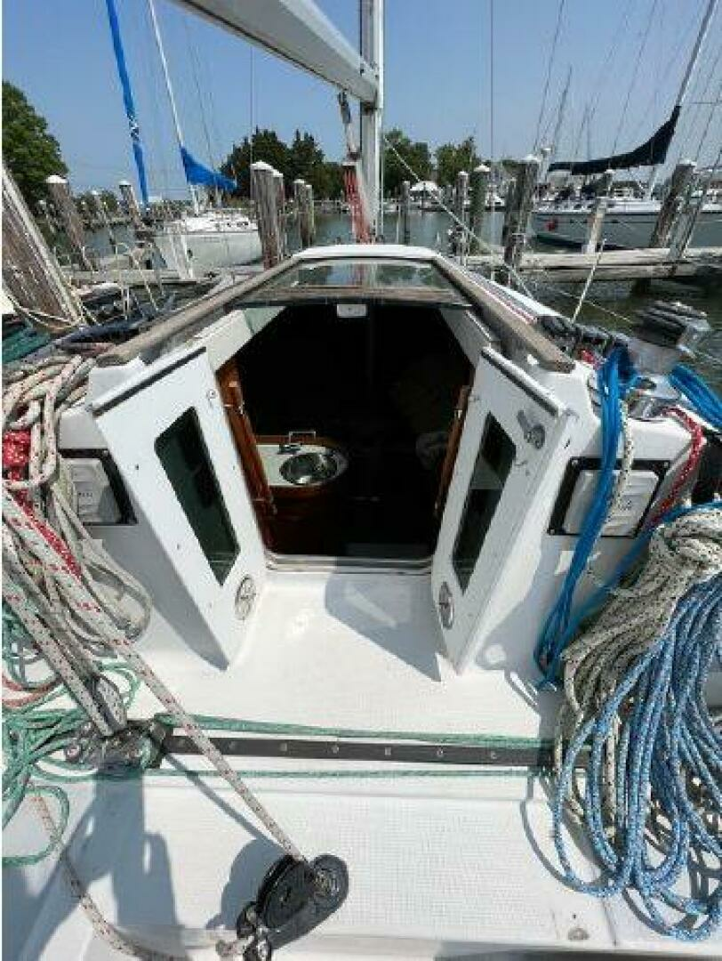 - On deck one will see she has all new running rigging and a new forward hatch. Her cockpit is quite comfortable and offers aft pulpit seats as well. The lift out helm seat offers easy access when boarding from the scooped transom.