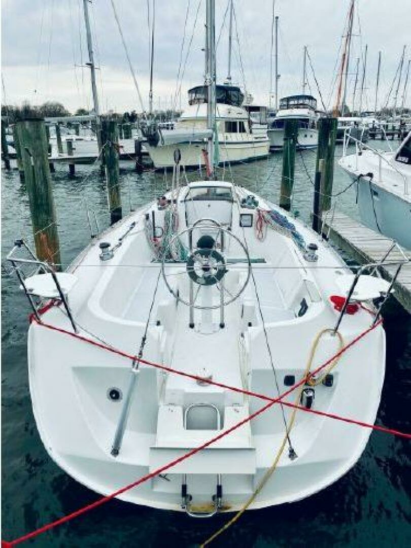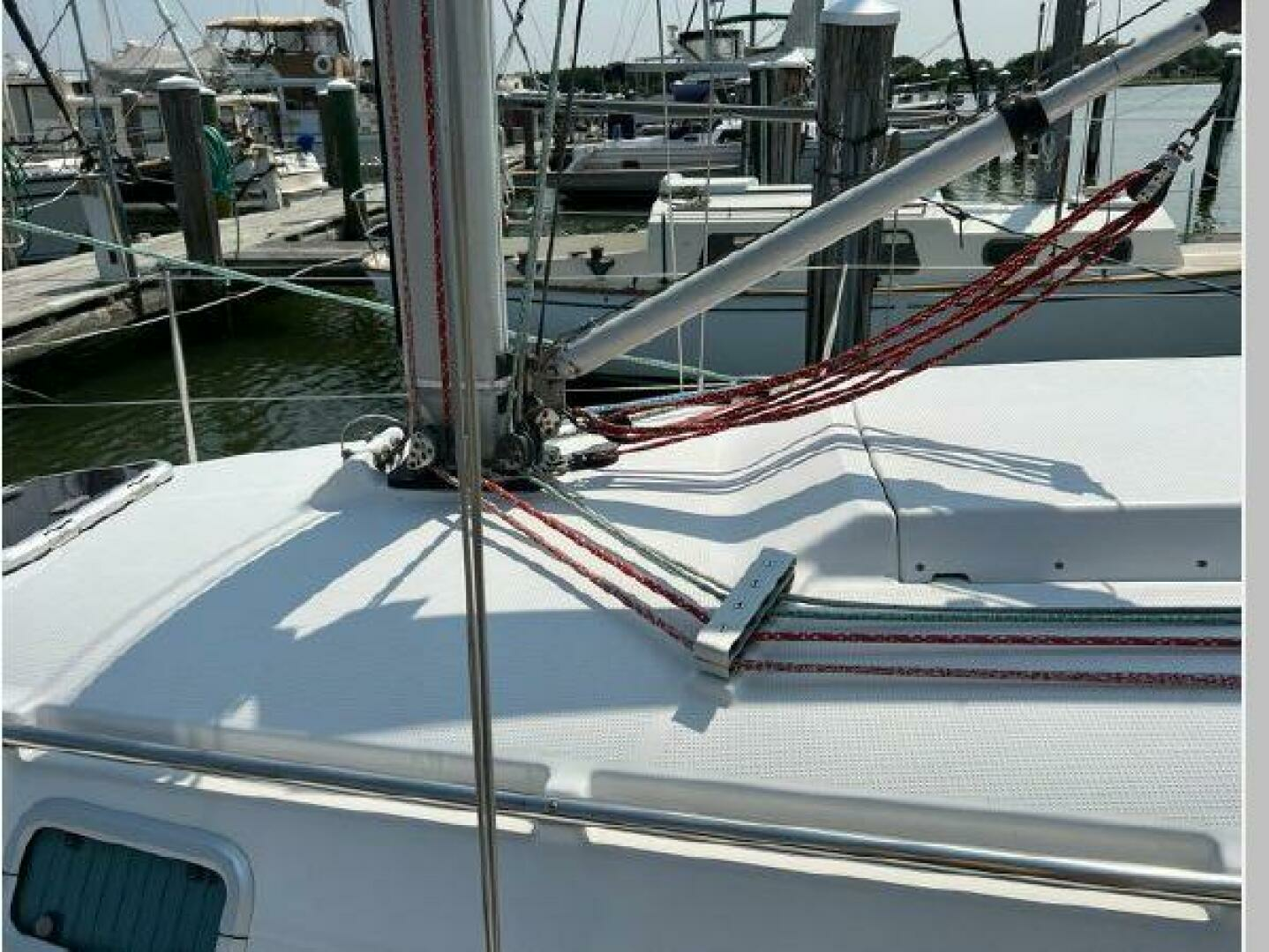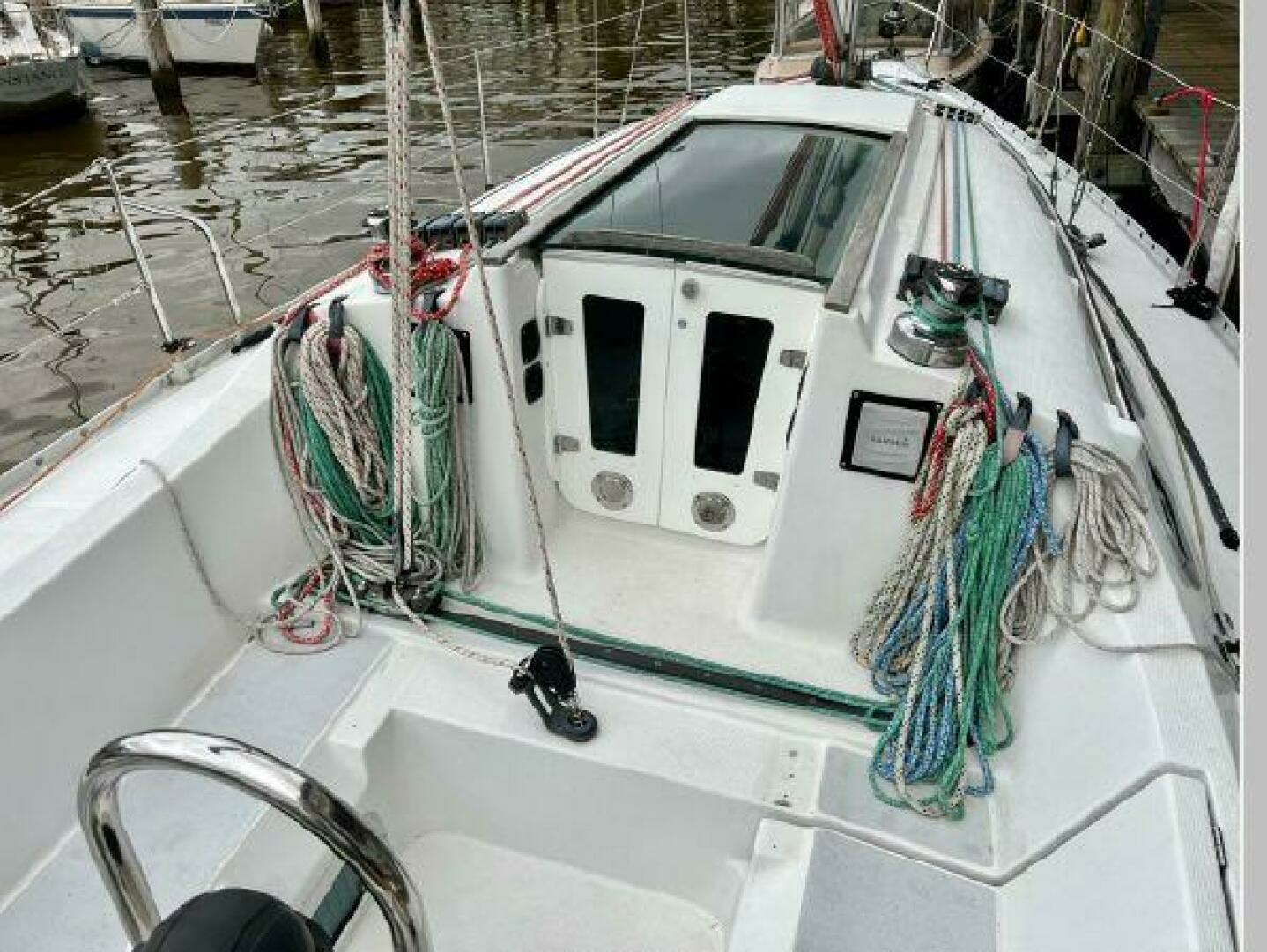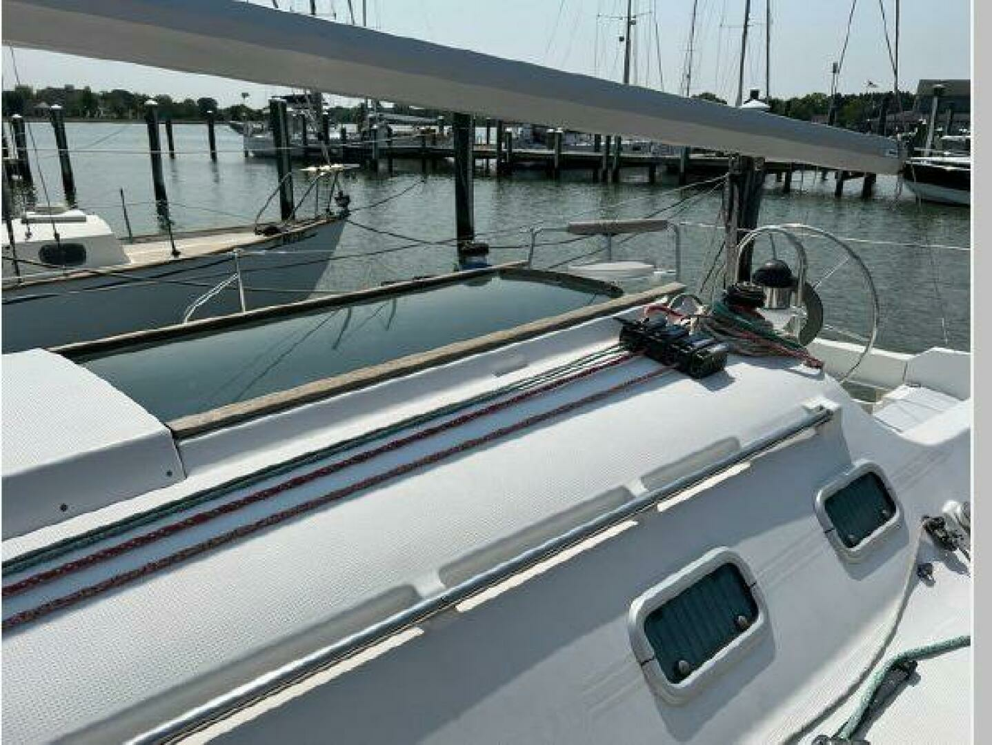 - On deck one will see she has all new running rigging and a new forward hatch. Her cockpit is quite comfortable and offers aft pulpit seats as well. The lift out helm seat offers easy access when boarding from the scooped transom.
